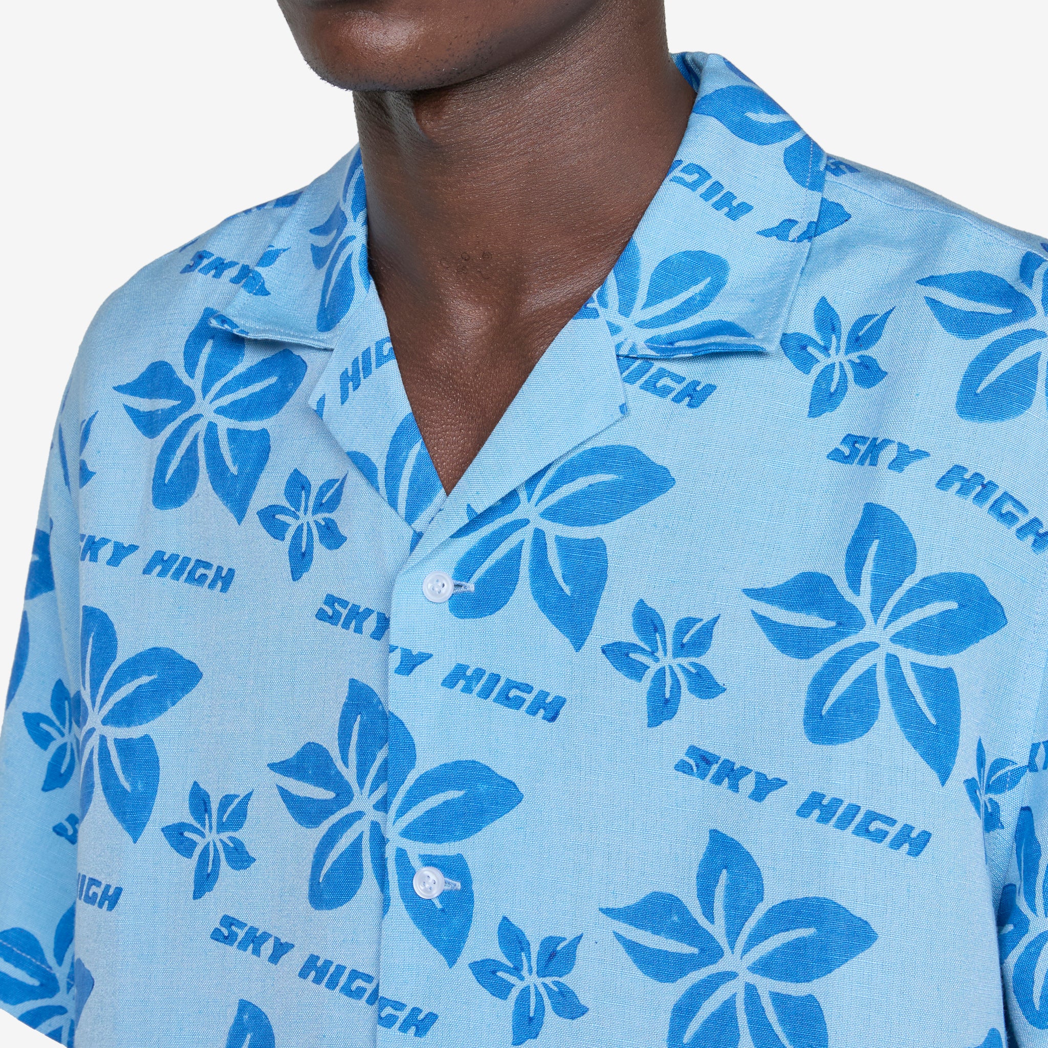 Unisex Hand Block Print Hawaiian Shirt in Blue from Sky High Farm Workwear. Slightly cropped, boxy fit shirt with a straight hem, full button closure and a camp collar. Crafted from a lightweight linen blend. Finished with an all-over floral print.