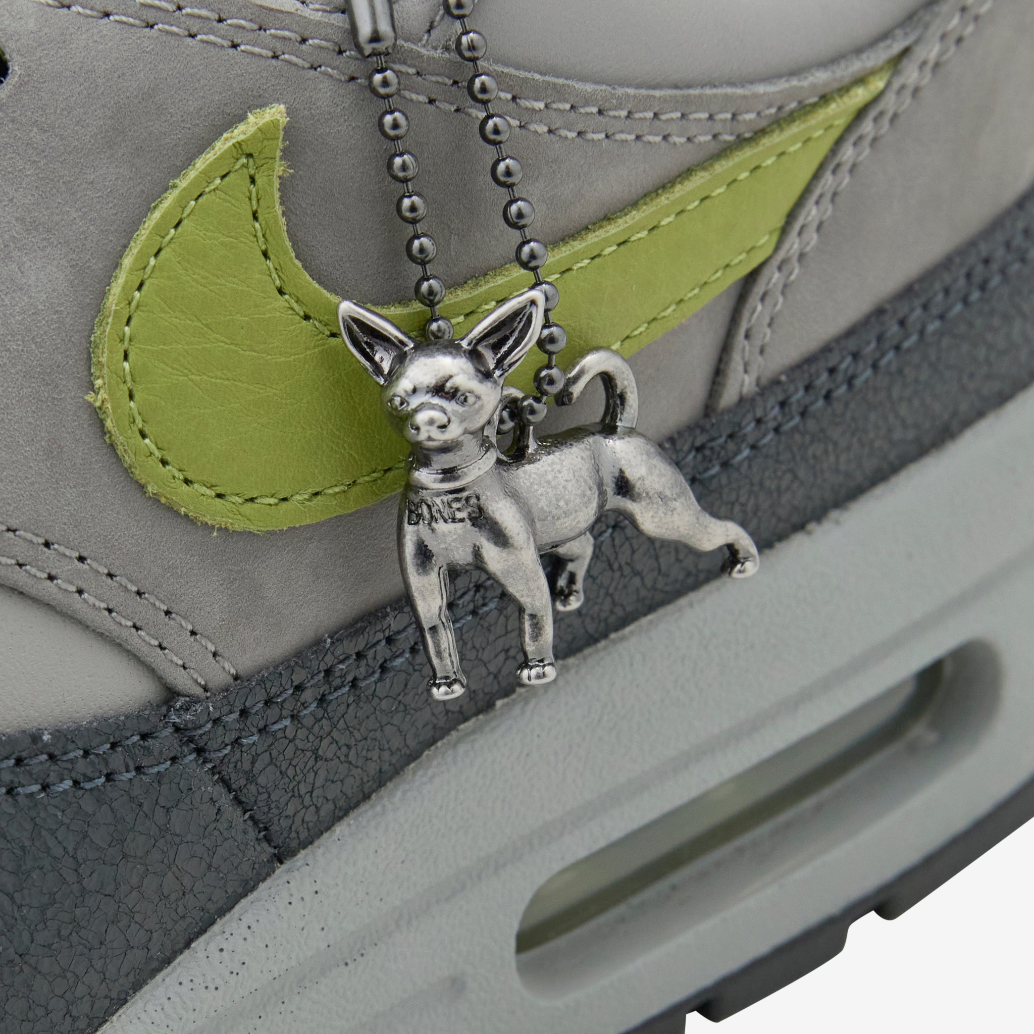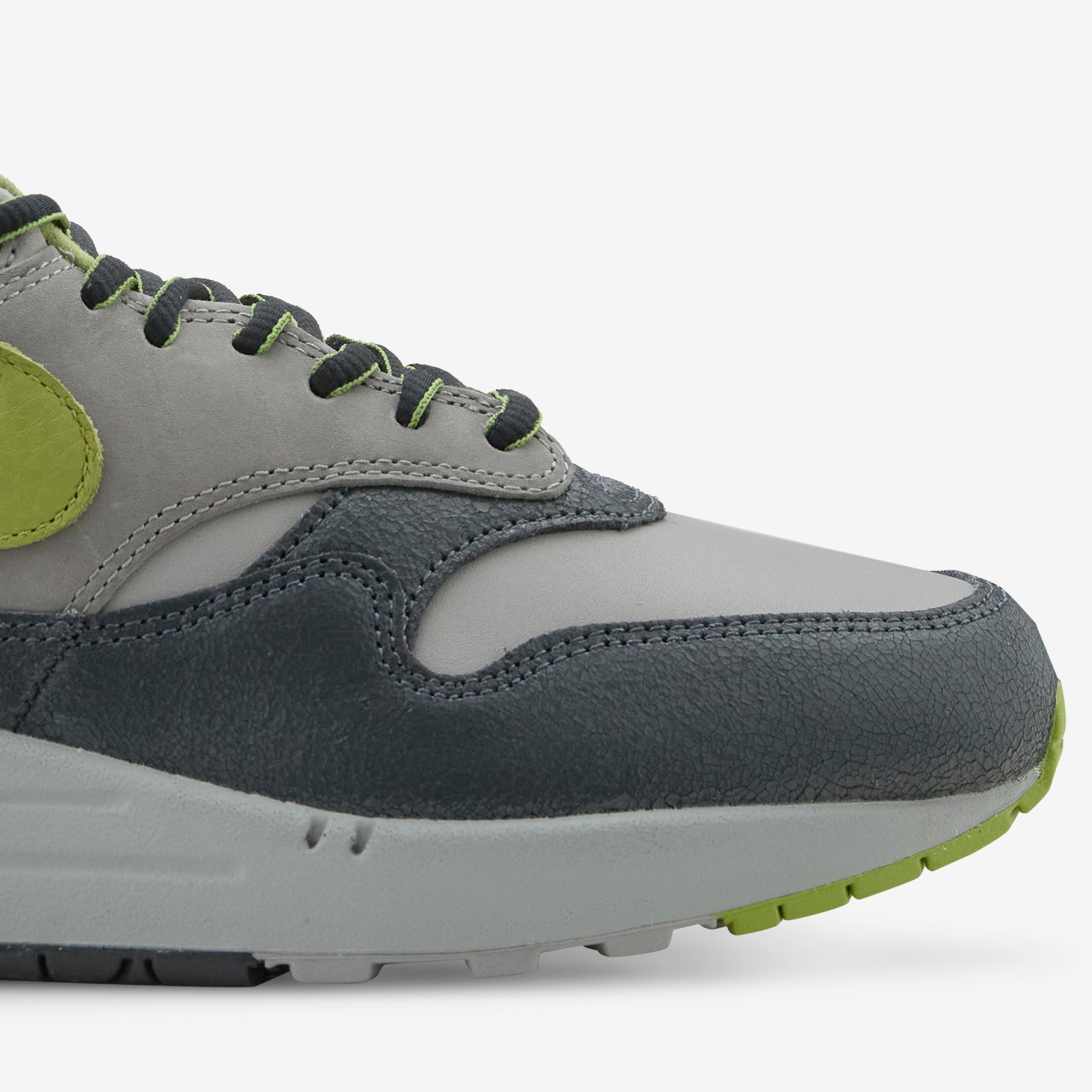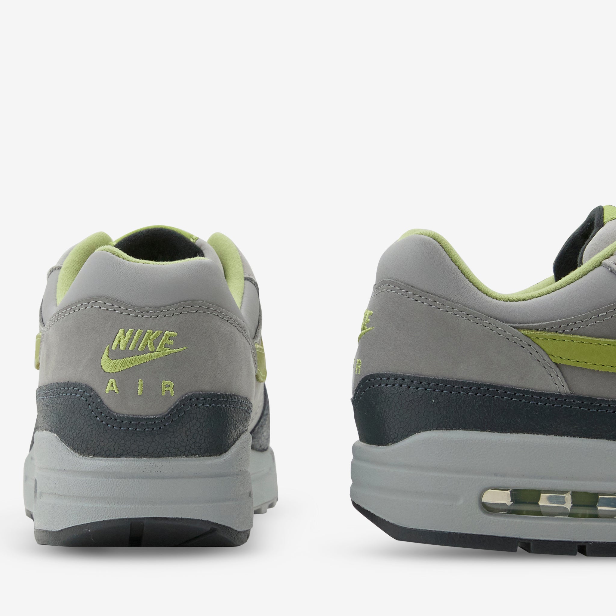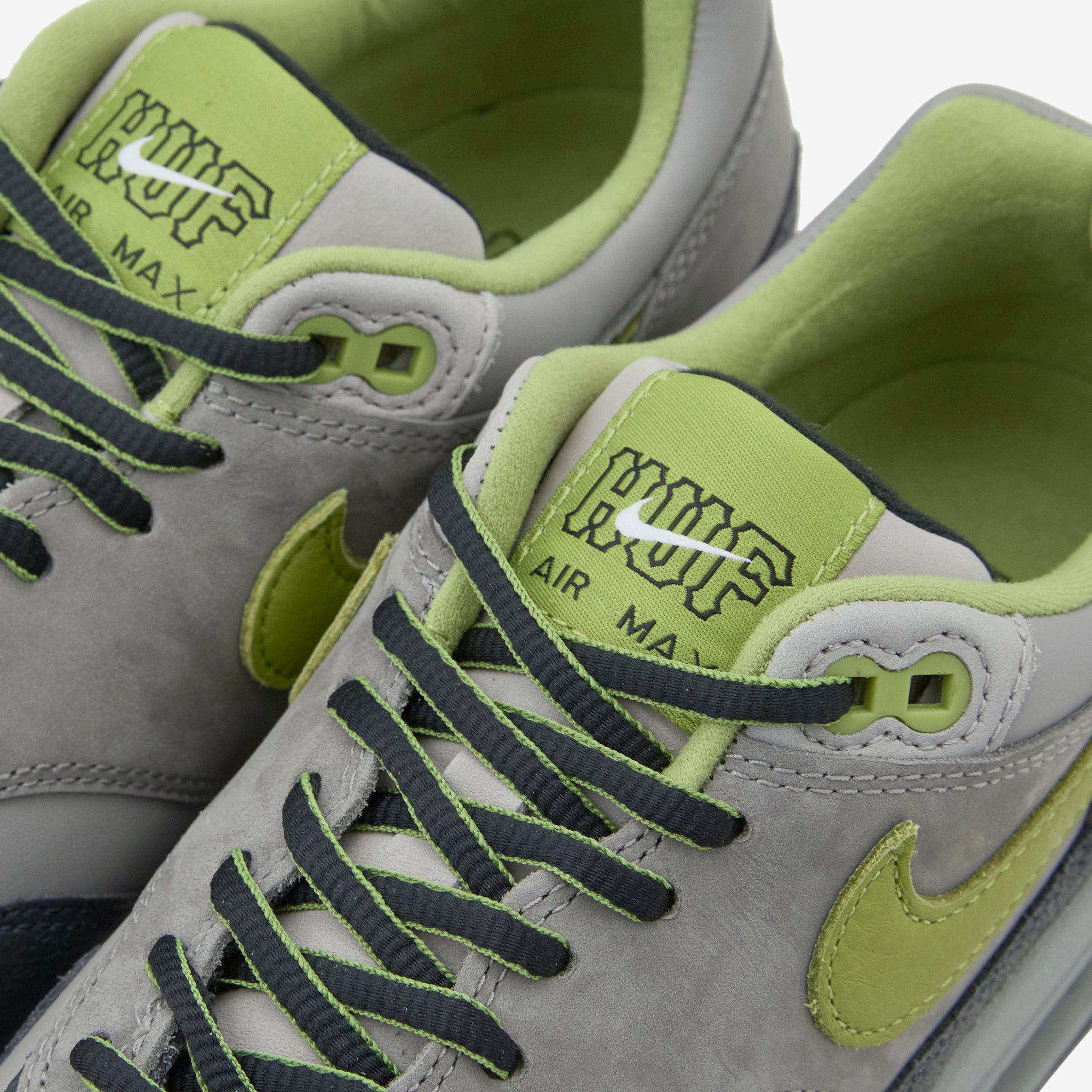 HUF collaborates with Nike on the Air Max 1 SP in Anthracite, Pear, Medium Grey and Flat Pewter. Durable upper with a foam midsole and wavy mudguard. Features a Max Air unit in the heel for cushioning and a rubber waffle outsole for durable traction.