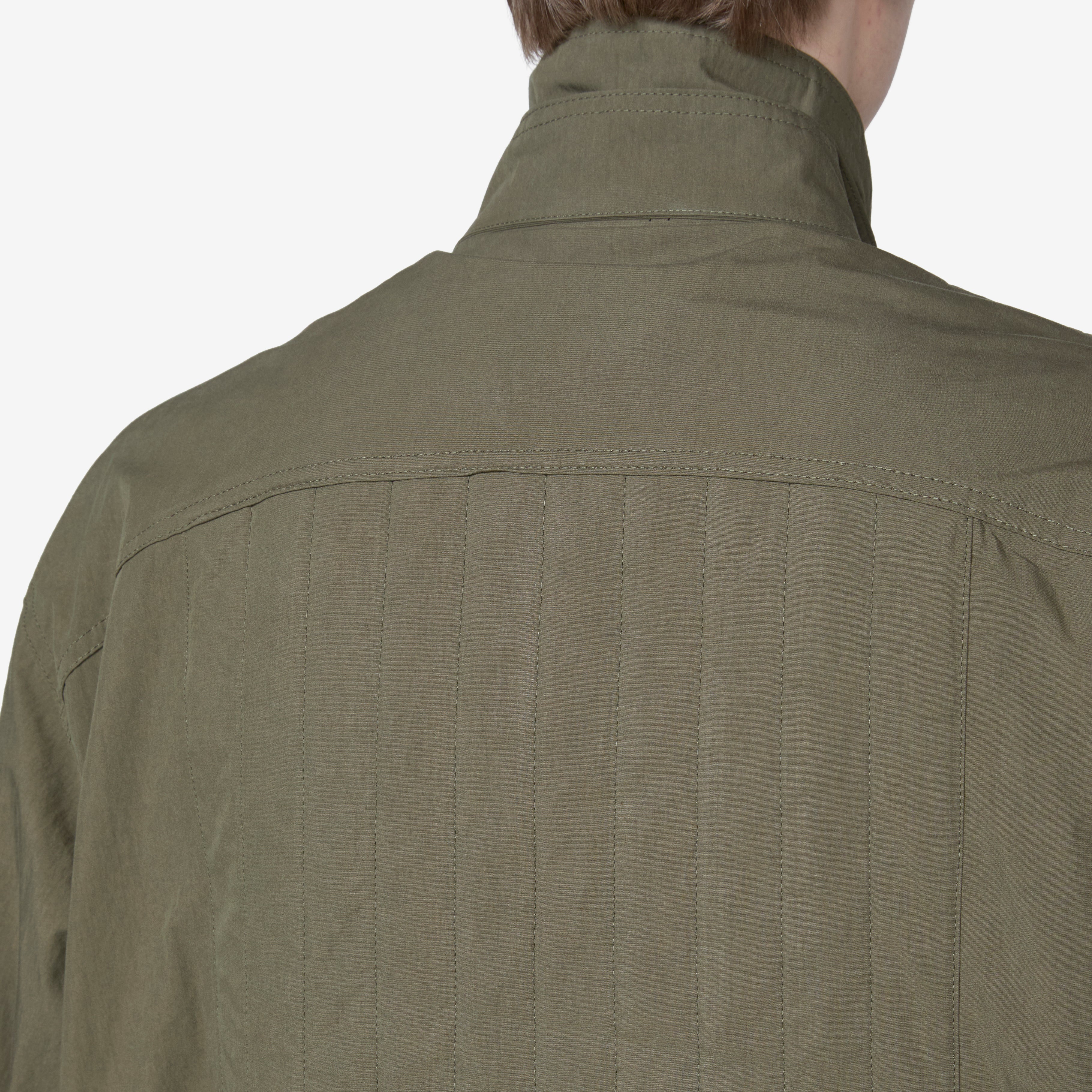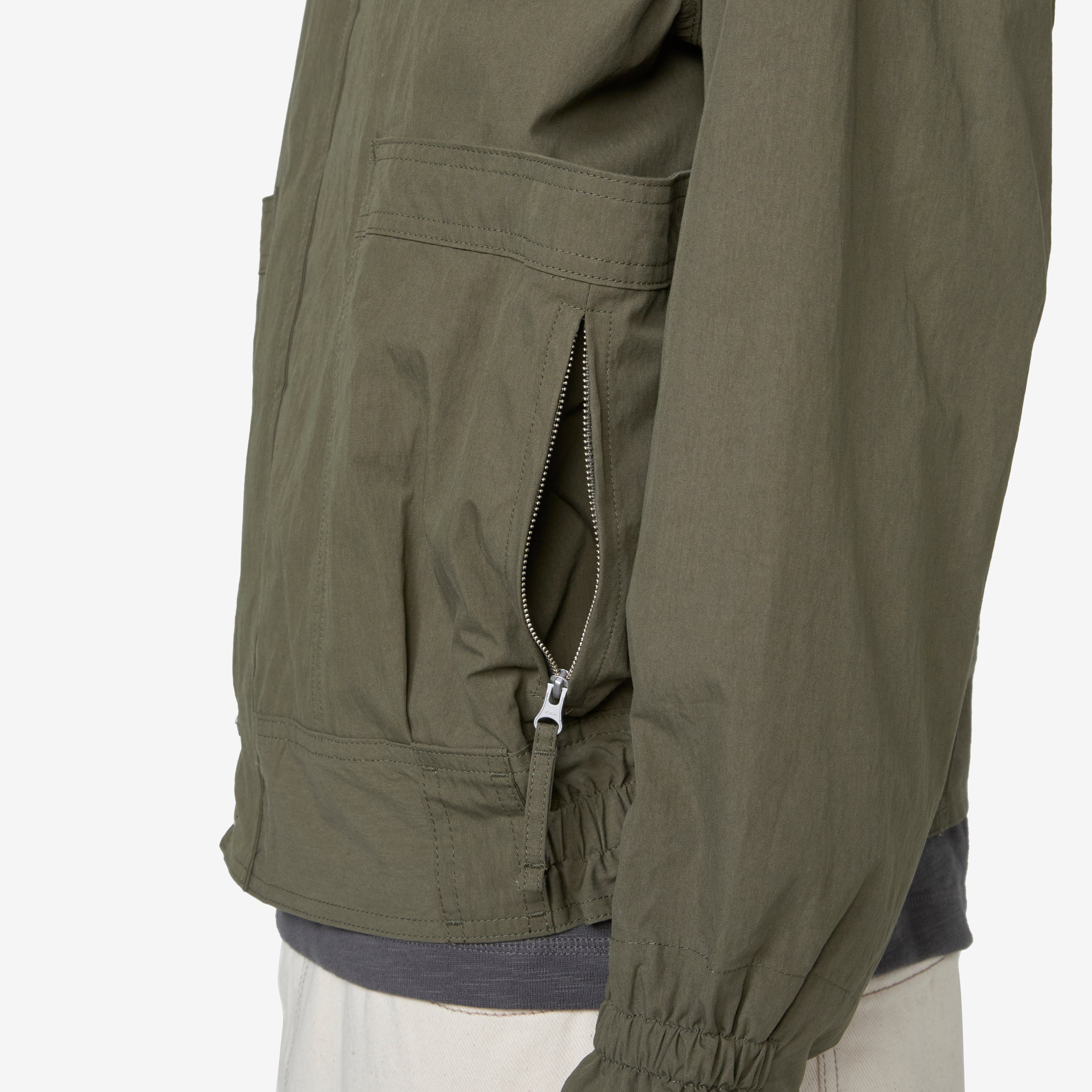 Men's Hunting Hiker Jacket in Sage Green from Uniform Bridge. Relaxed fit jacket with a full neck, semi-elasticated waistband and cuffs and two-way zip closure concealed by the placket with button closure. Crafted from a cotton and nylon blend for lightweight durability. Features two wrap-around pockets on the hem as well as three zipped pockets on the front.