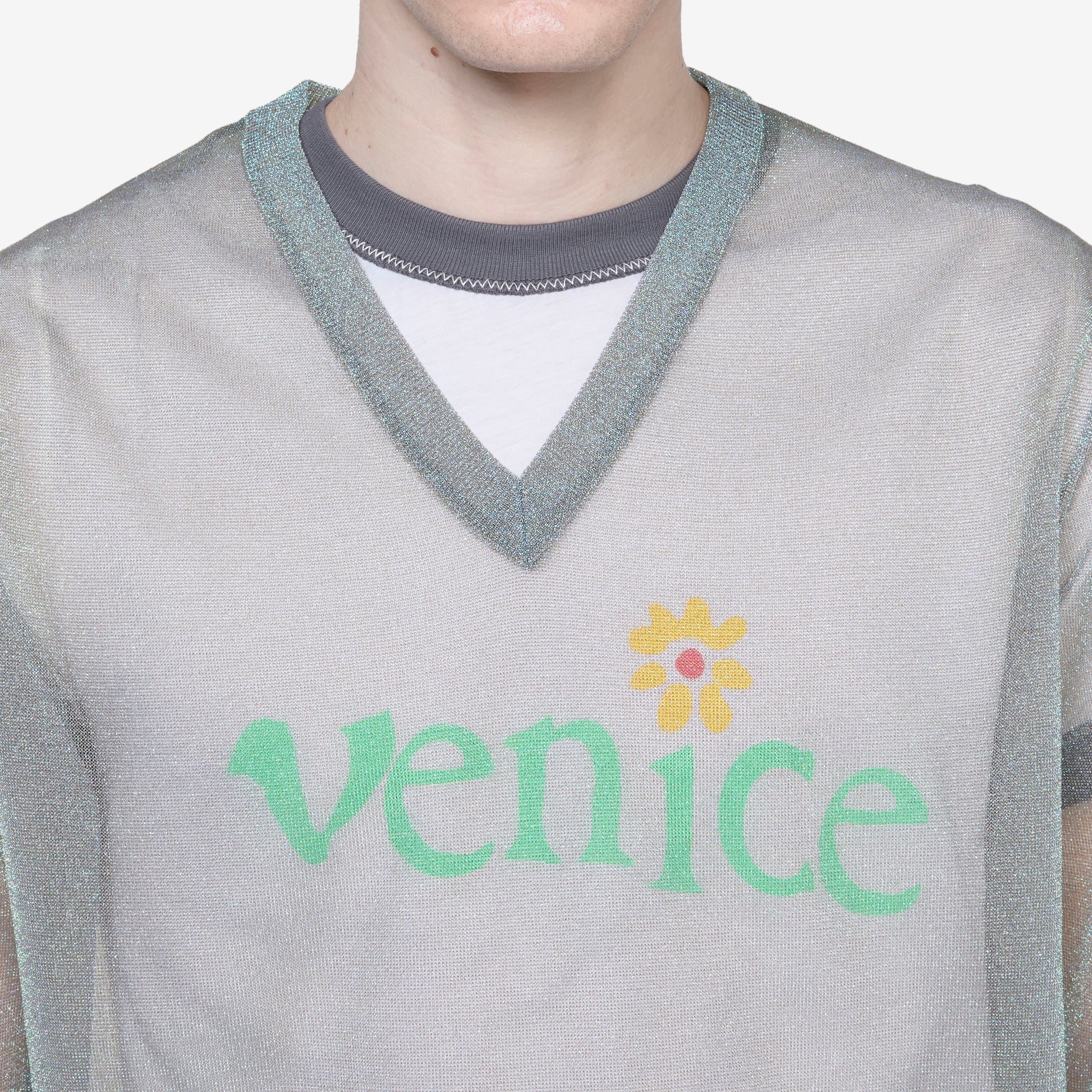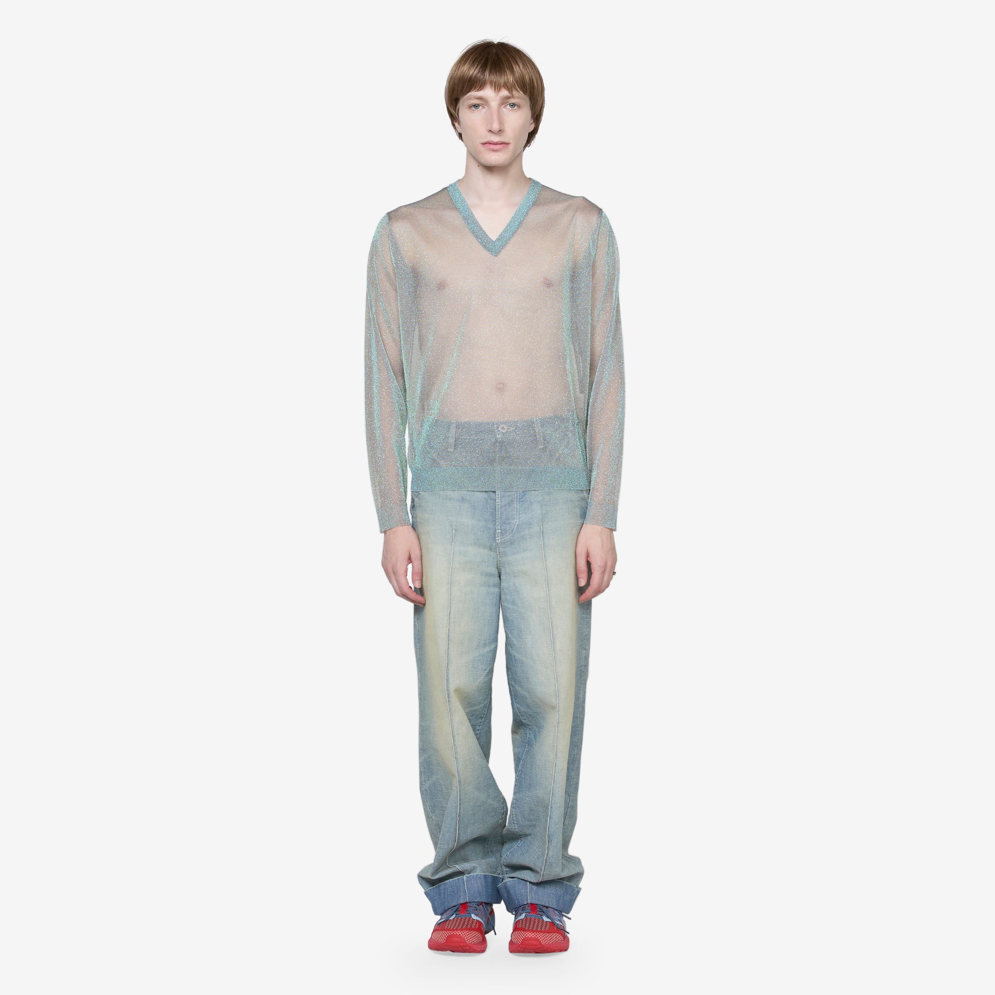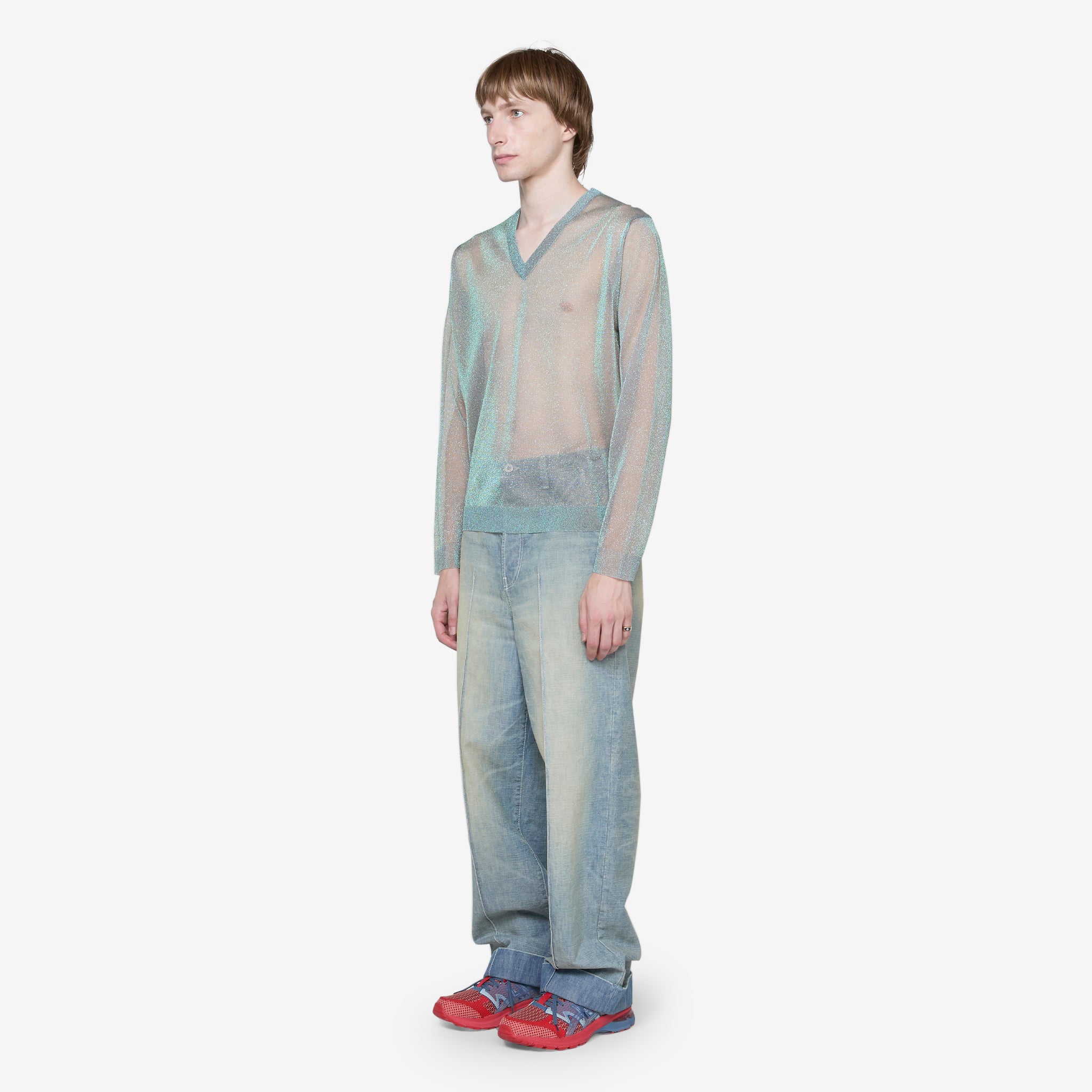 Men's Lurex Pullover in Silver from ERL. Relaxed fit, slightly cropped pullover sweatshirt with a v-neckline. Crafted from polyester with a shiny finish.