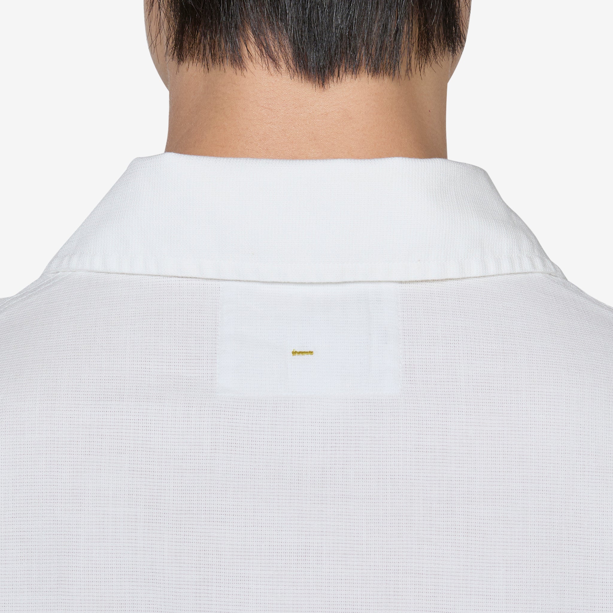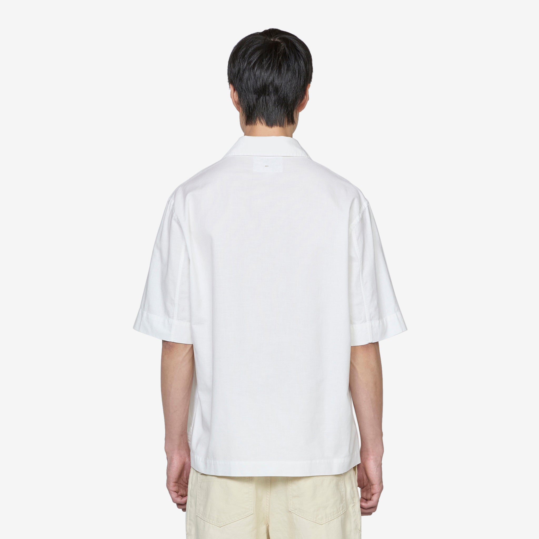 Men's MHL. Offset Placket Polo in White from MHL. By Margaret Howell. Relaxed fit short sleeve polo shirt with a two-button placket and side split hem. Crafted from cotton with corozo brace buttons.