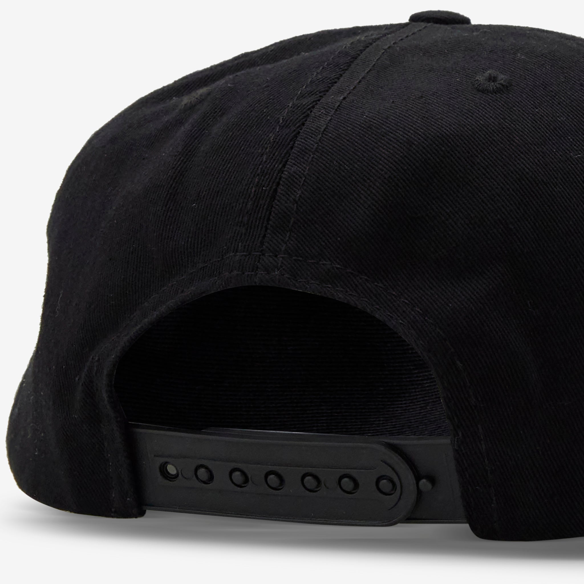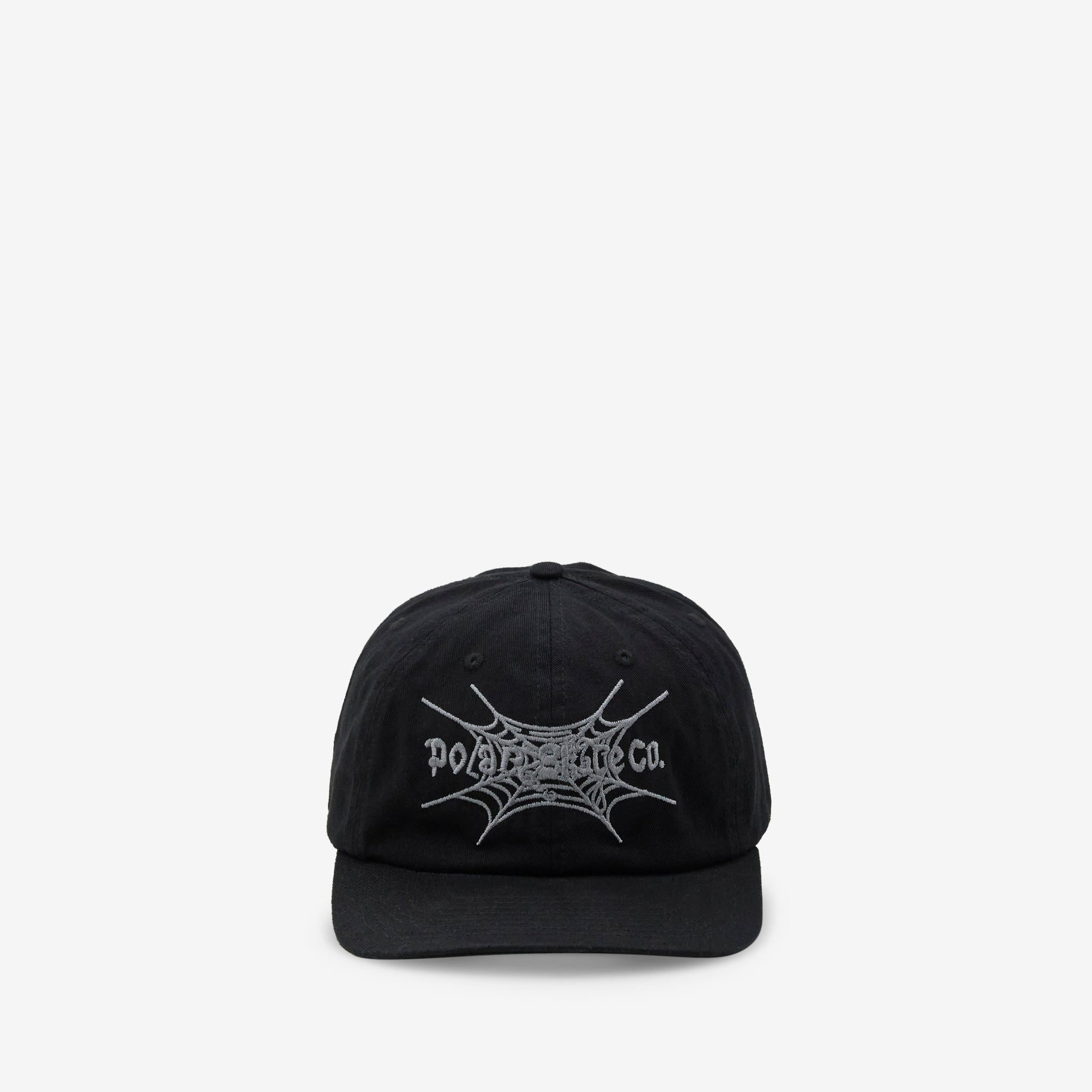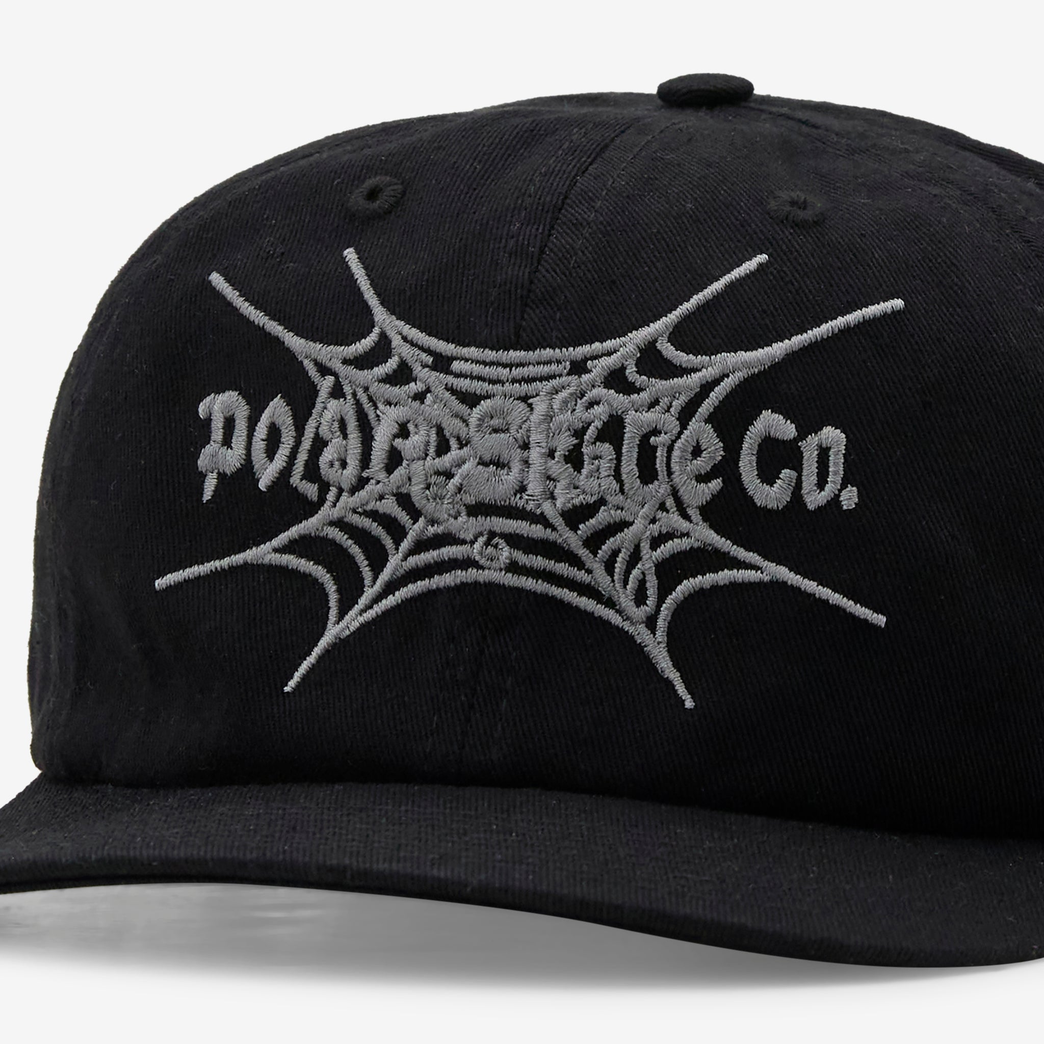 Michael Spiderweb Cap in Black from Polar Skate Co. Unstructured 6 panel cap with a flat brim and plastic adjuster. Crafted from cotton twill fabric which has been garment-washed for a worn look and feel. Finished with embroidered artwork on the front by Jacob Ovgren.