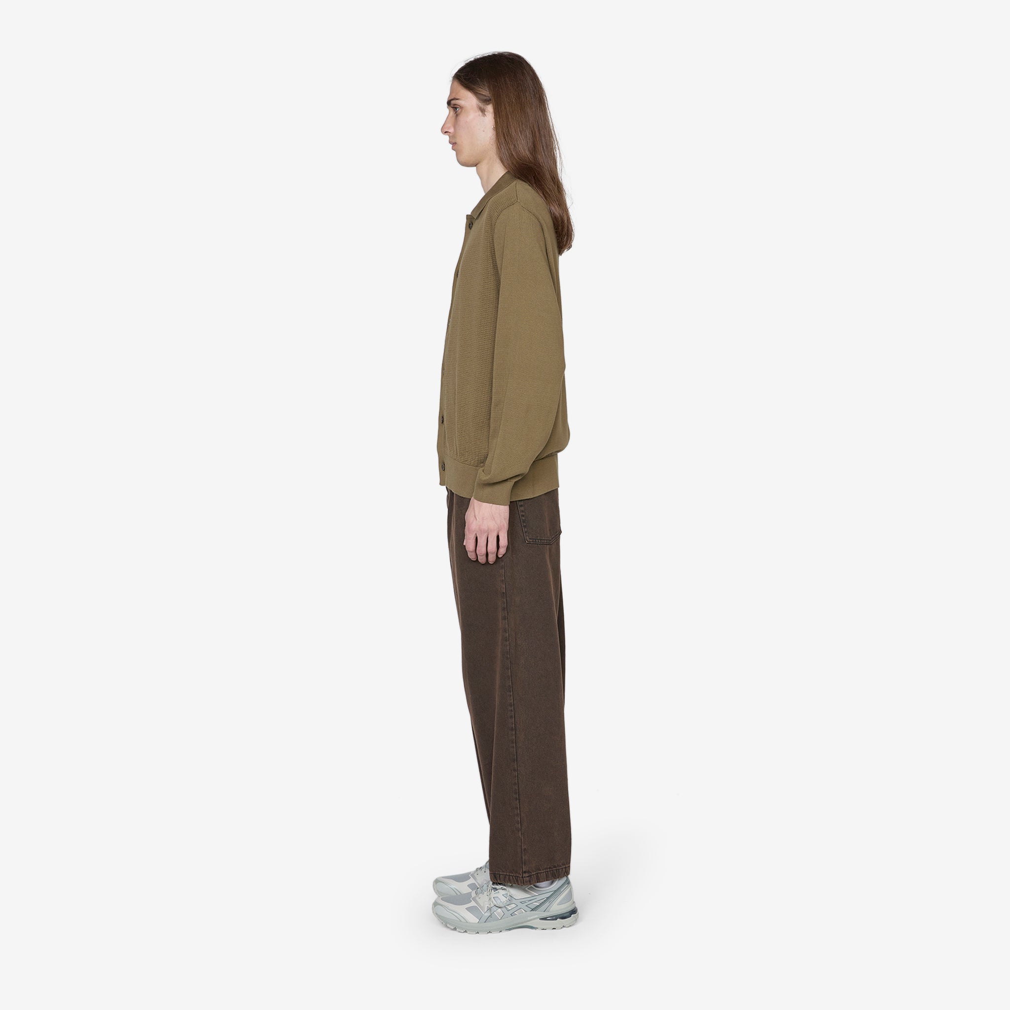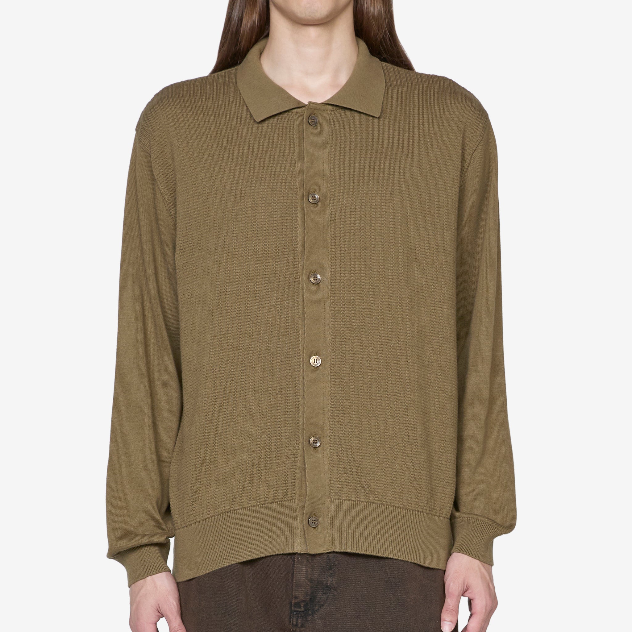 Men's Miles Cardigan in Beech from Polar Skate Co. Redtro fit, cropped longsleeve polo shirt with full button closure and ribbed trims. Crafted from a structured jersey knit with tonal customised faux pearl buttons.