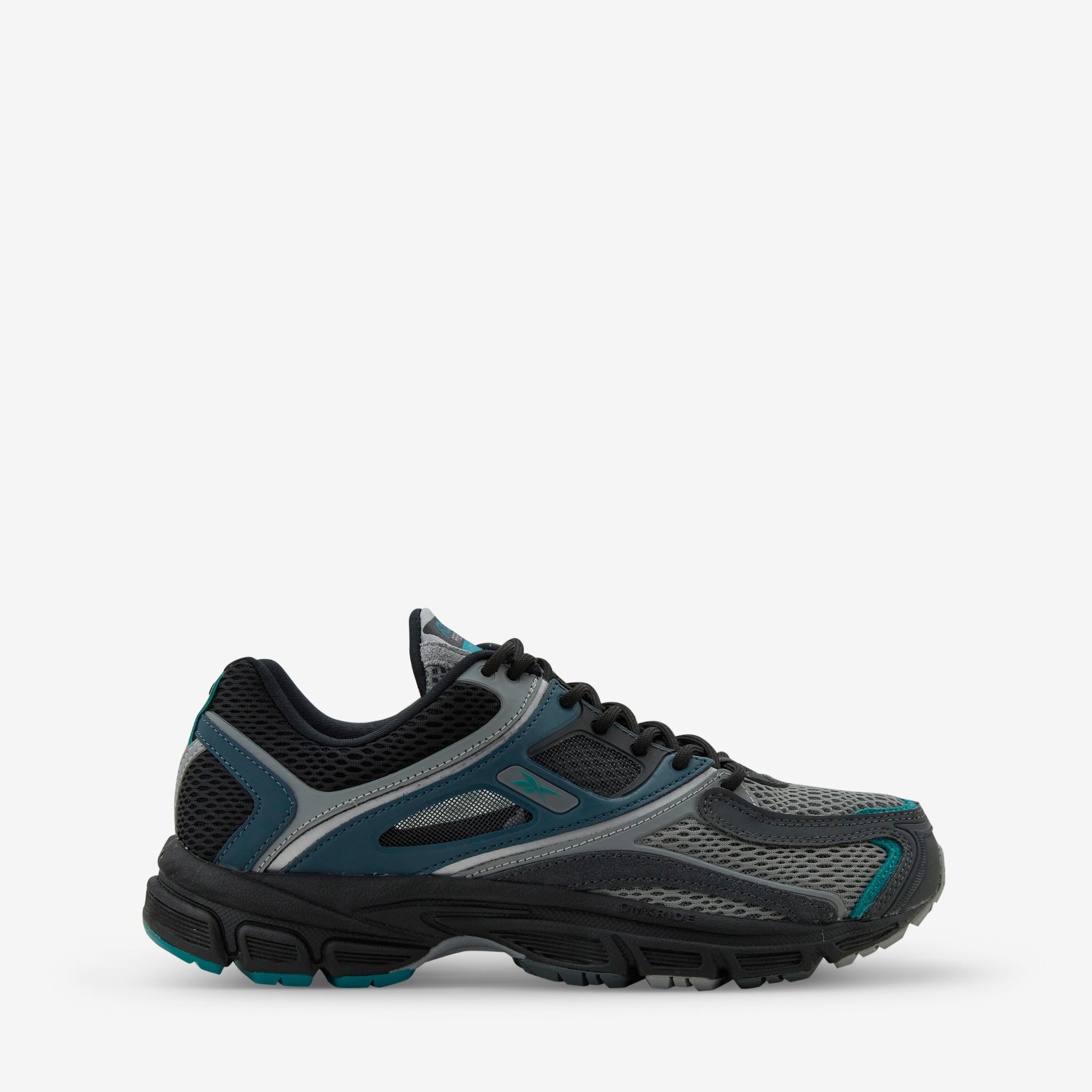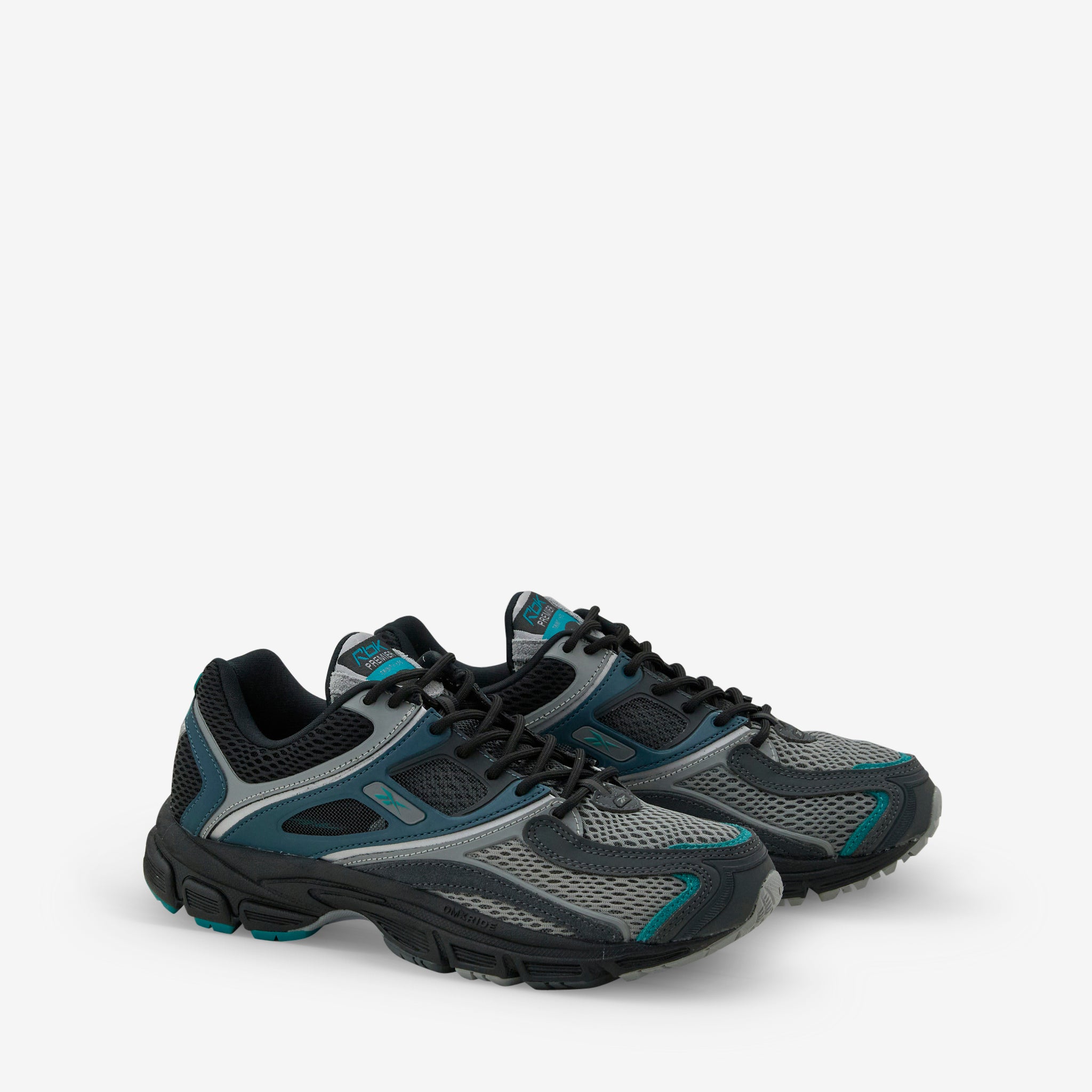 RBK Premier Trinity KFS in Grey and Black from Reebok. Running-inspired shoes with a layered mesh and suede upper. Features a Kinetic Fit System and TPU shank plate for added support and a rubber outsole for traction.