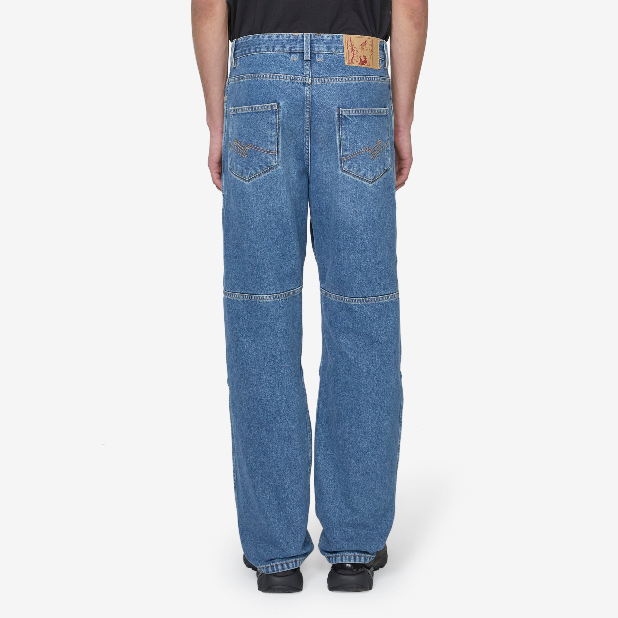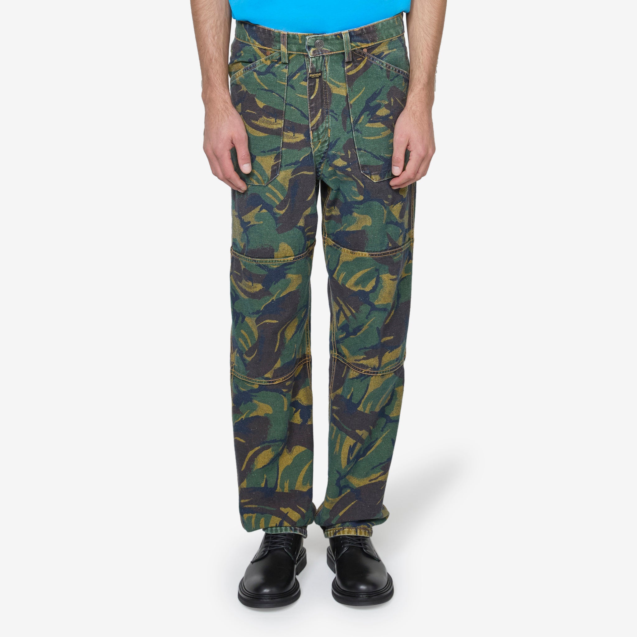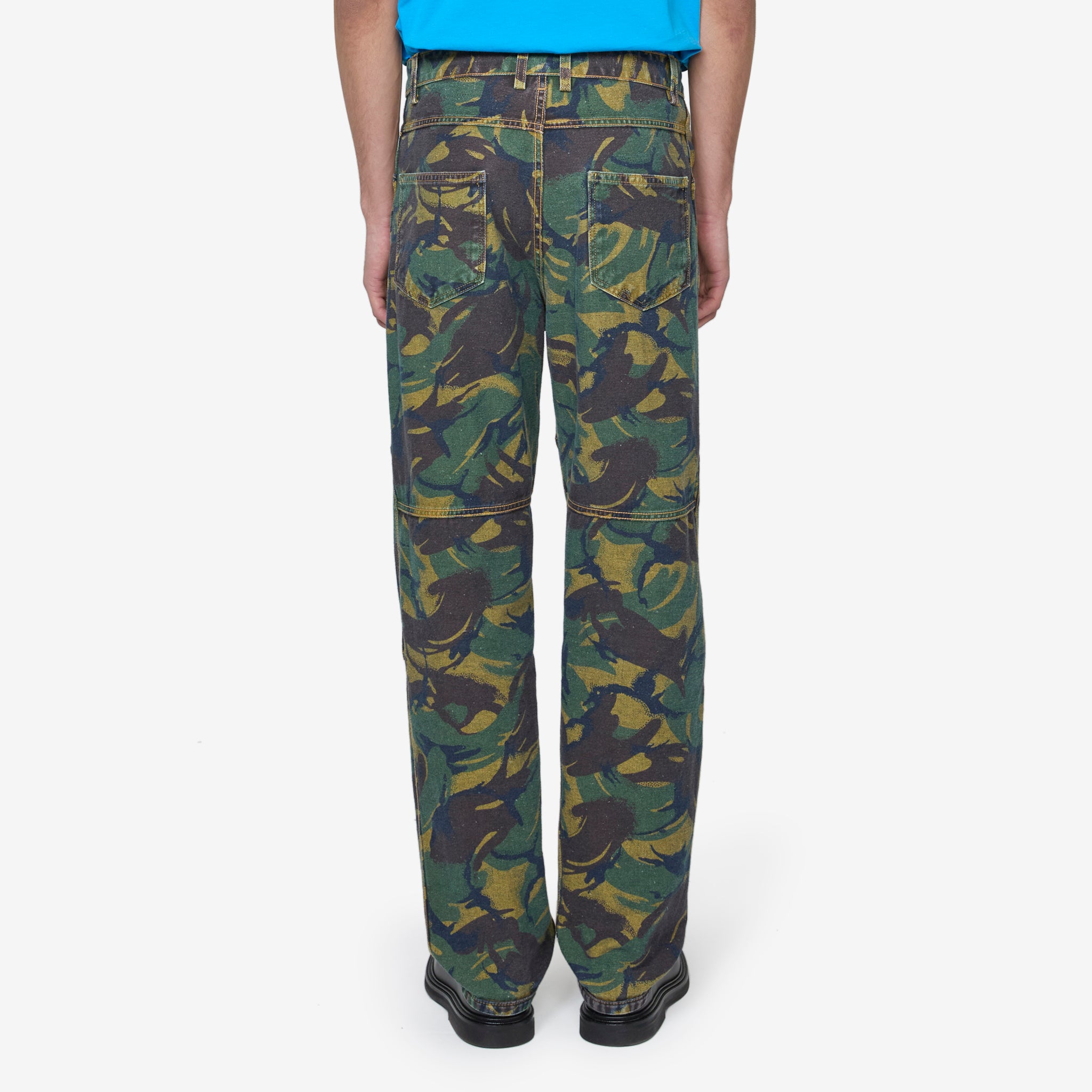 Unisex Reversible Camo Jean in Blue Camo from Martine Rose. Straight fit reversible panelled jeans featuring five-pocket construction, zip fly and front button fastening. Crafted from organic cotton with a camo print and blue wash on the reverse. Finished with a branded paper jacron at the back waist.