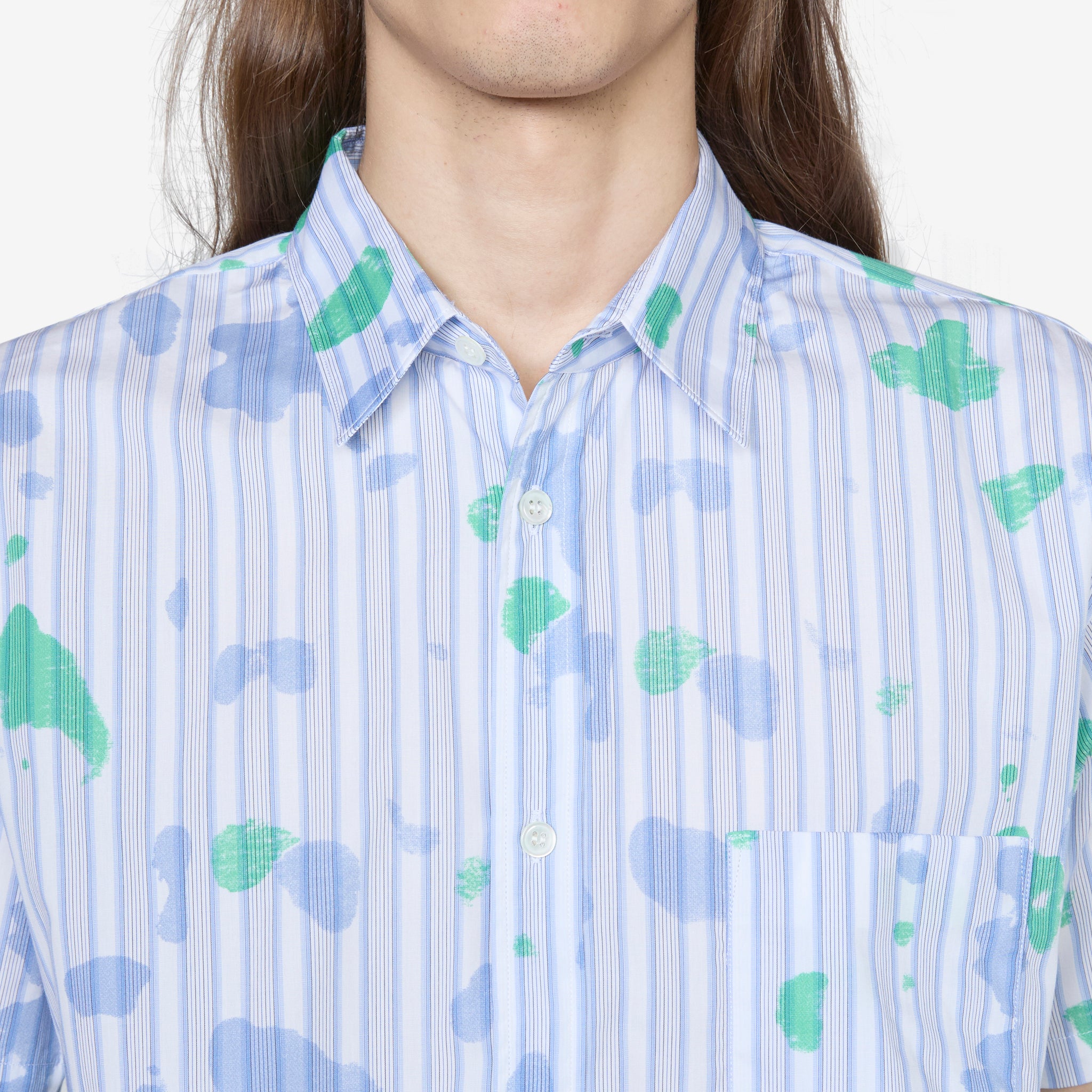 Men's Short Sleeve Spray Paint Shirt in Stripe from Comme des Garçons SHIRT. Relaxed fit longsleeve shirt with a classic collar, full button closure and a curved hem. Crafted from striped cotton fabric with spray paint pattern all-over. Finished with a single patch pocket on the chest.