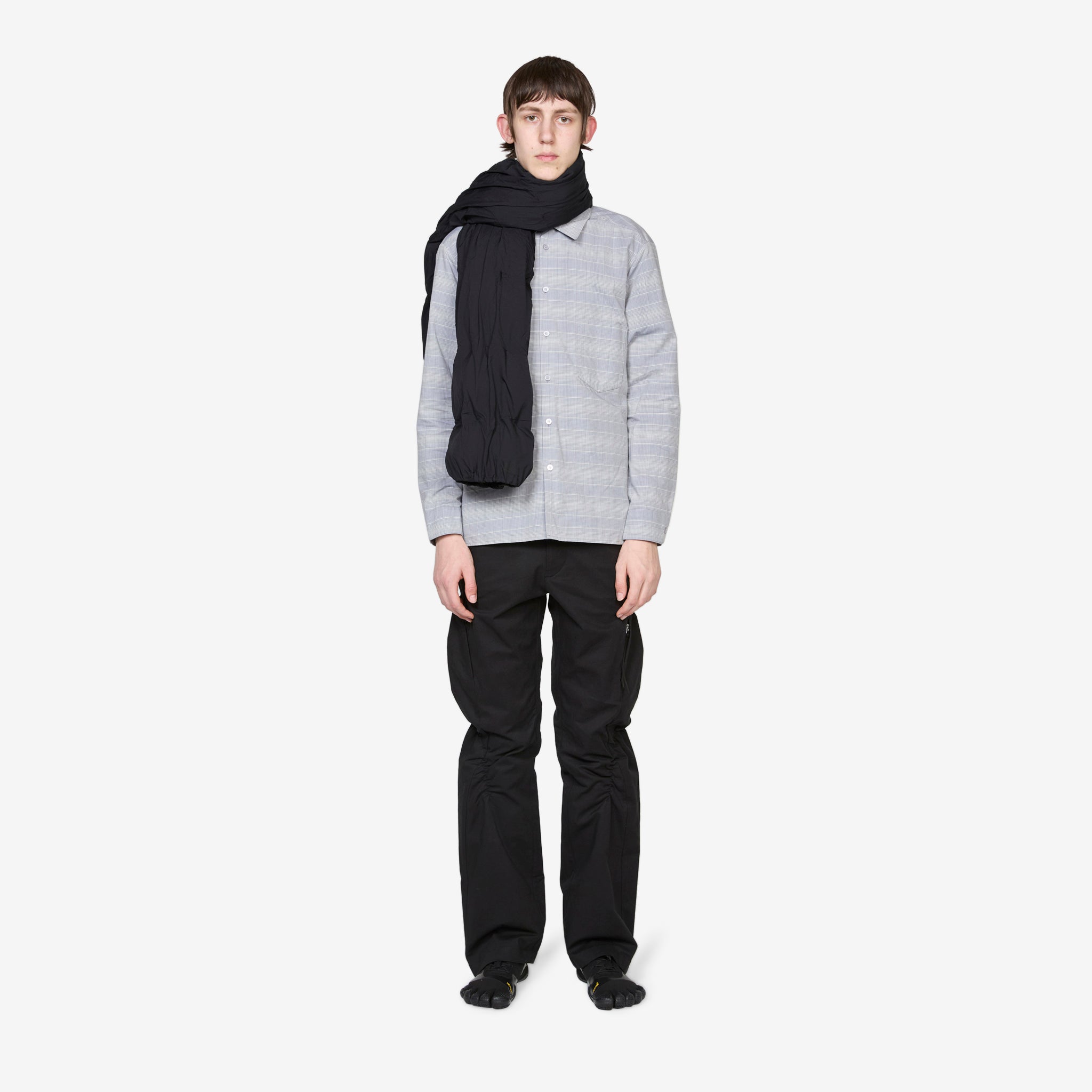 Archive Cocoon Scarf in Black from Post Archive Faction (PAF). Padded wrap-around scarf with cuffed, open-ended hems for hand warmth. Crafted from a nylon shell with warm goose down fill and utilitarian down distribution around the neck. Finished with a woven brand label at the hem.