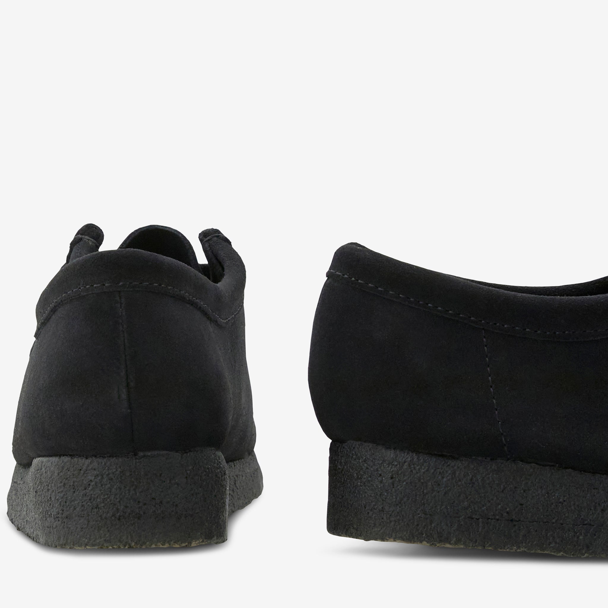 Men's Wallabee in Black Suede from Clarks. Classic moccasin silhouette featuring a suede upper with a leather lining and water and stain-resistant finish. Clarks signature crepe outsole provides durable structure. Finished with topstitch detailing and removable self-fabric Clarks fobs.