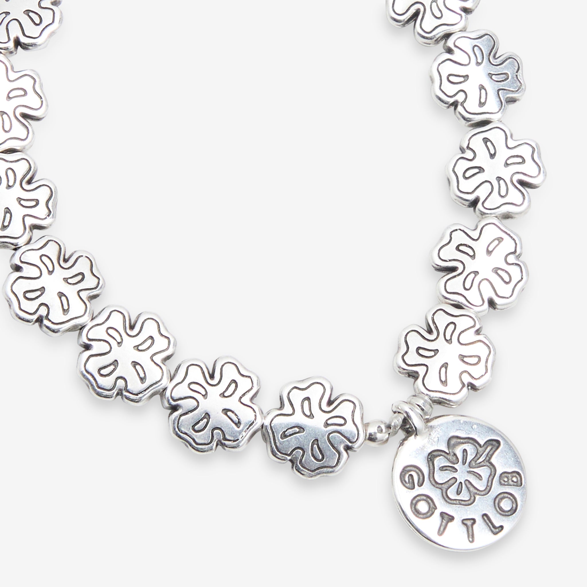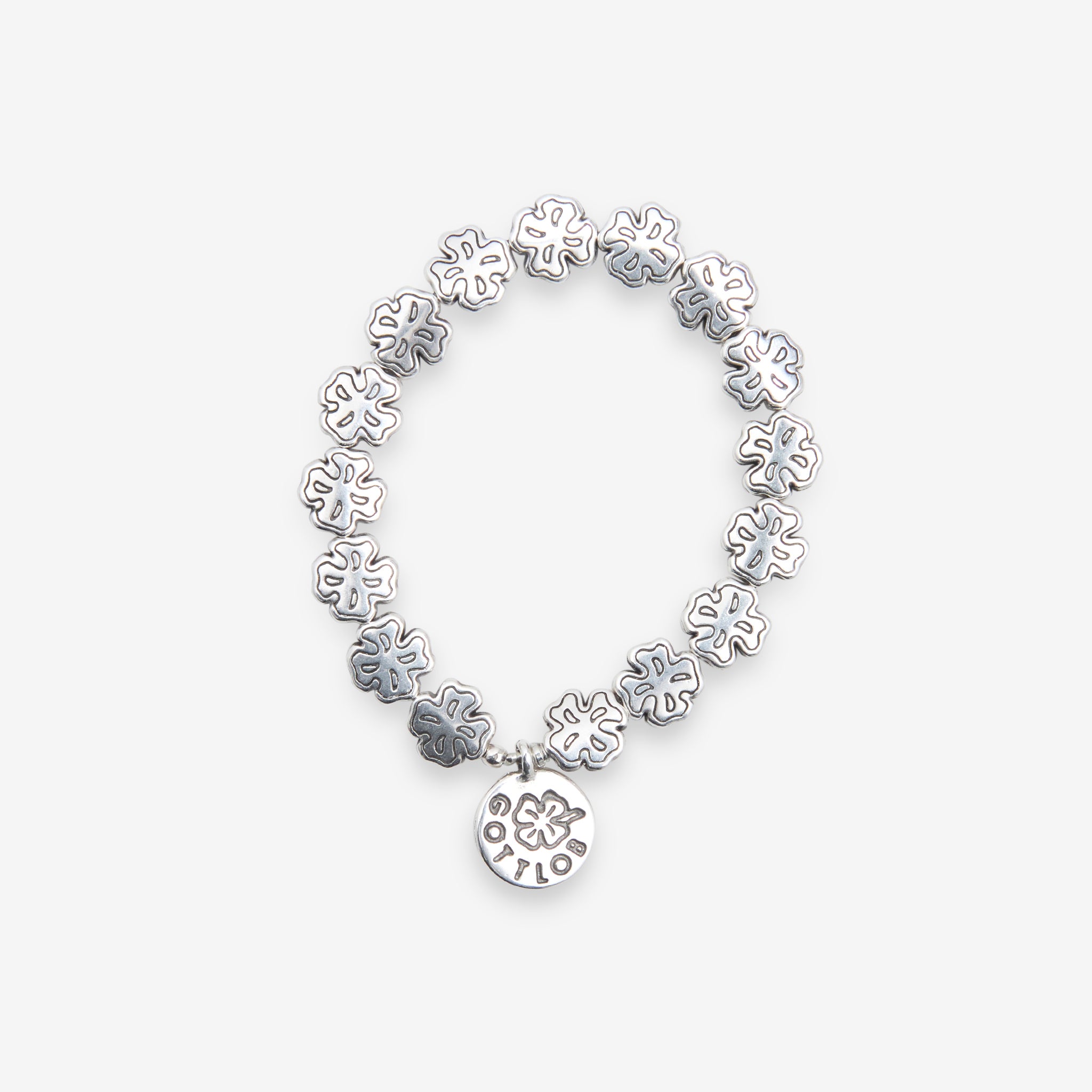 Unisex Edition No. 3 Bracelet in Silver from Gottlob. Elastic beaded bracelet featuring custom-engraved 999 Silver plated clover-style beads. Finished with a branded charm in silver plating.