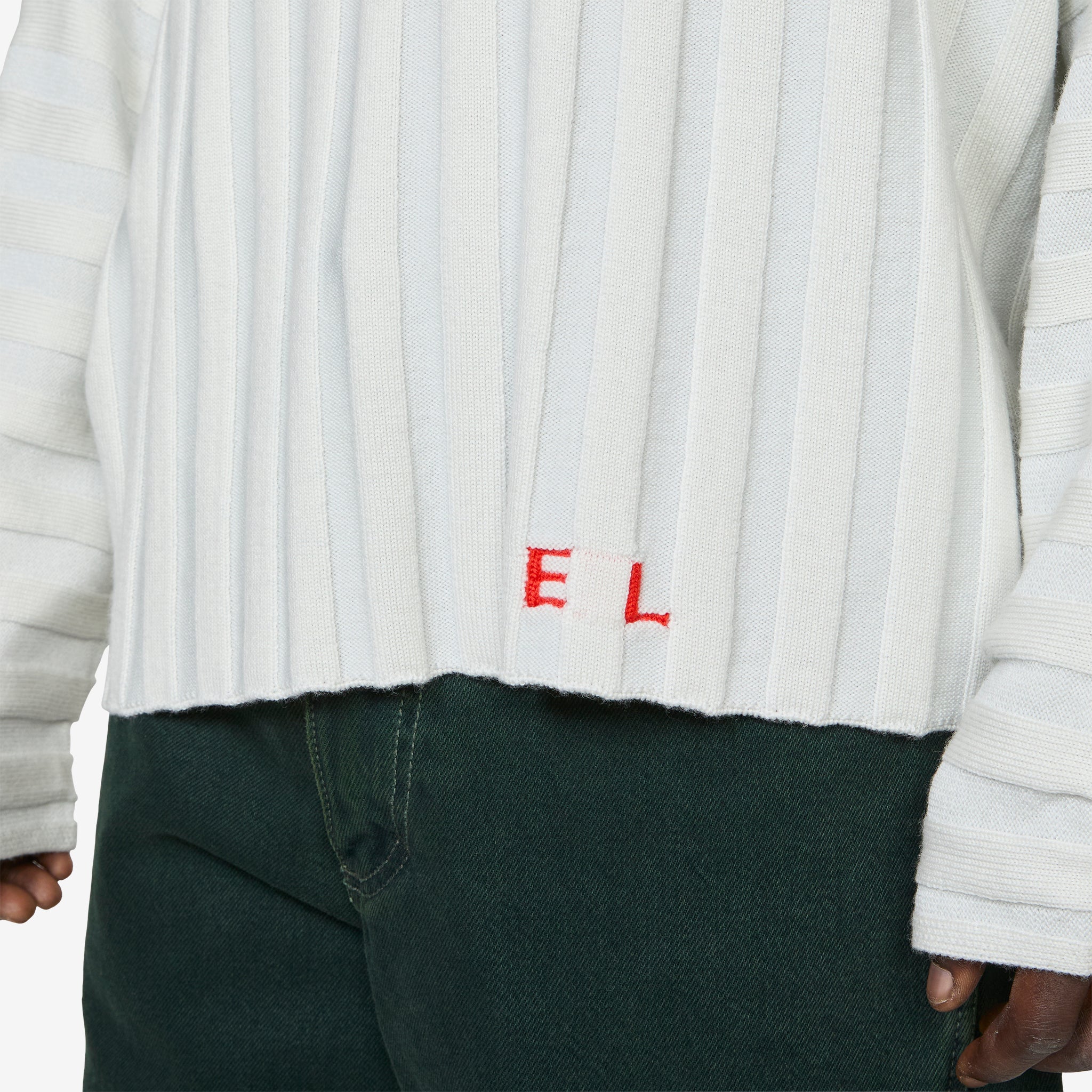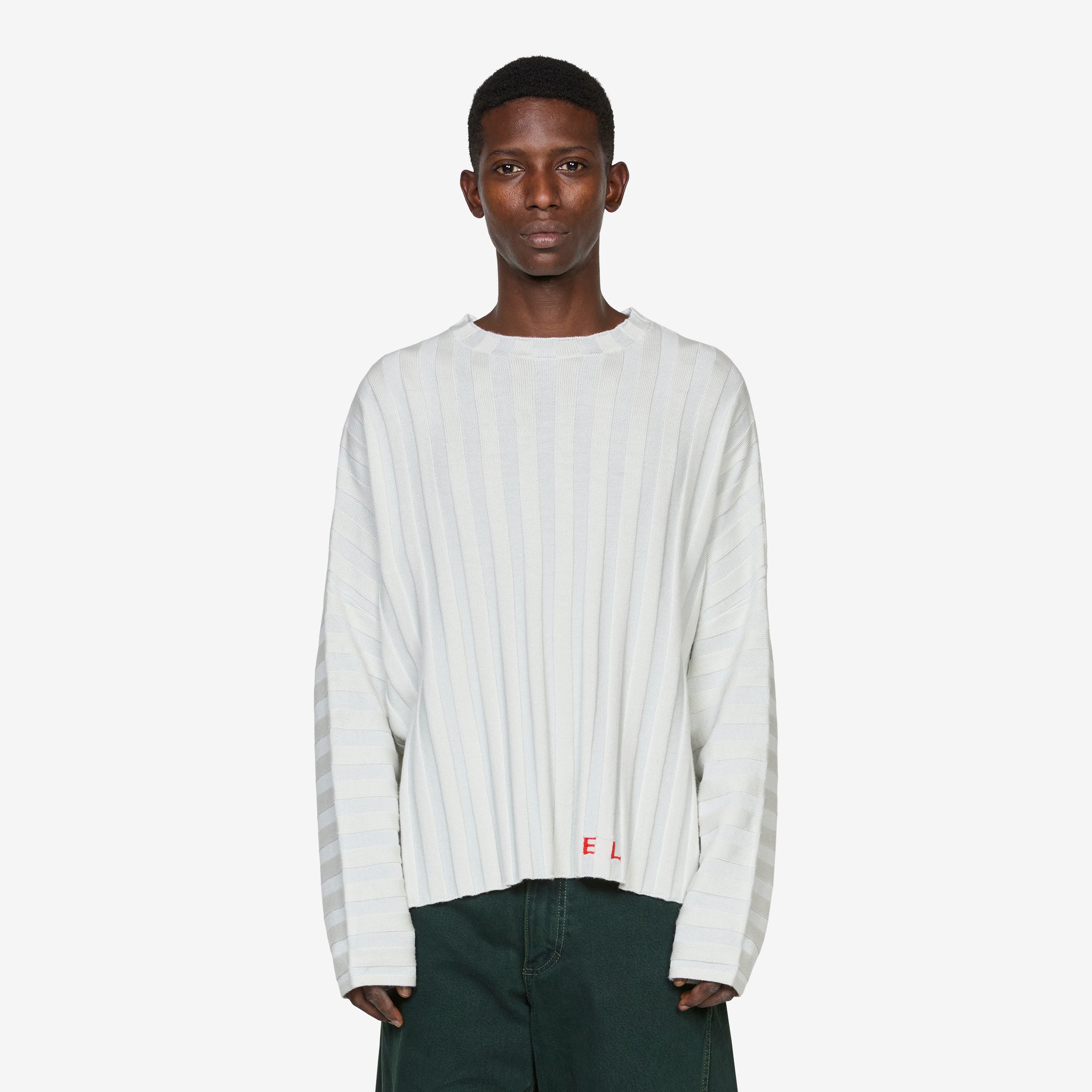 Keyboard Sweater in Snow from Eckhaus Latta. Relaxed fit sweater with a cropped silhouette and ribbed crew neckline. Crafted from a 10x10 extrafine soft merino wool rib with dolman sleeve construction. Finished with an intarsia-knit logo at the left hem.