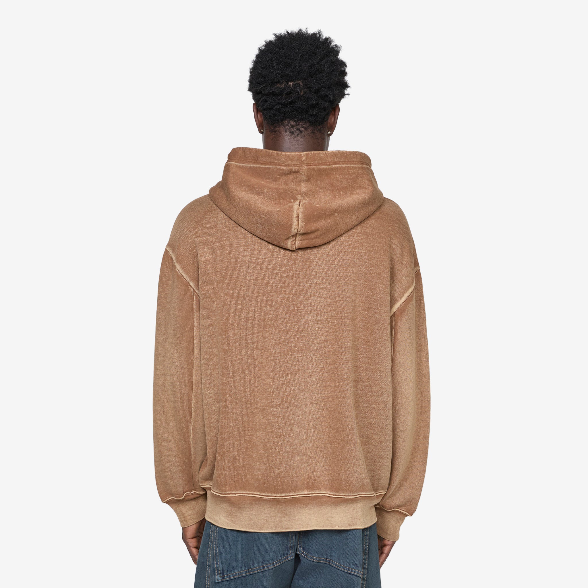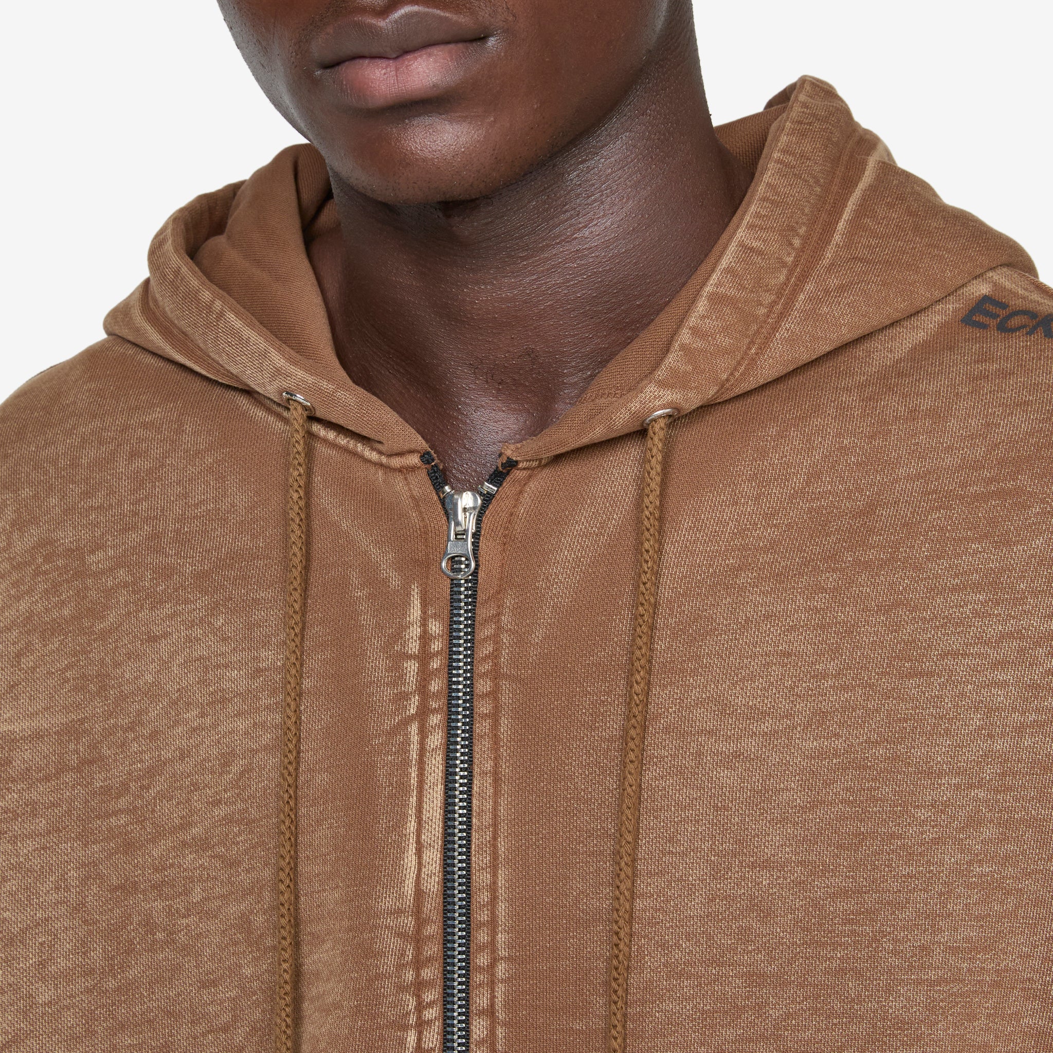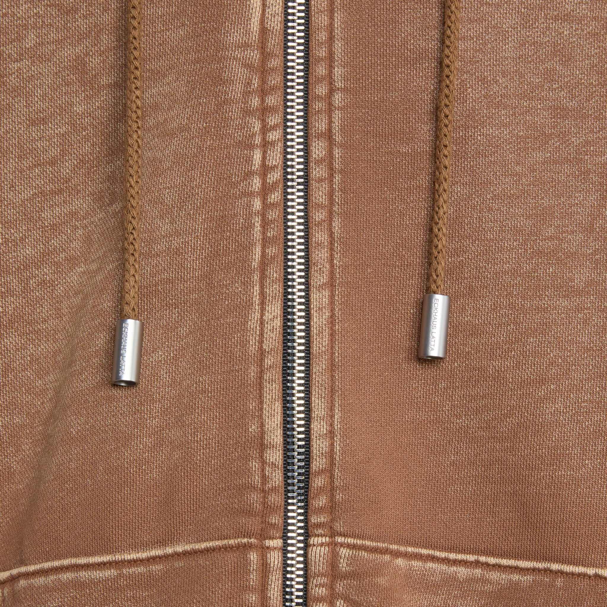 Zip Hoodie in Bison from Eckhause Latta. Relaxed fit hoodie with a drawstring adjustable hood, two-way zip closure, kangaroo pocket and ribbed trims. Crafted from a garment washed premium cotton and finished with printed branding at the left shoulder.
