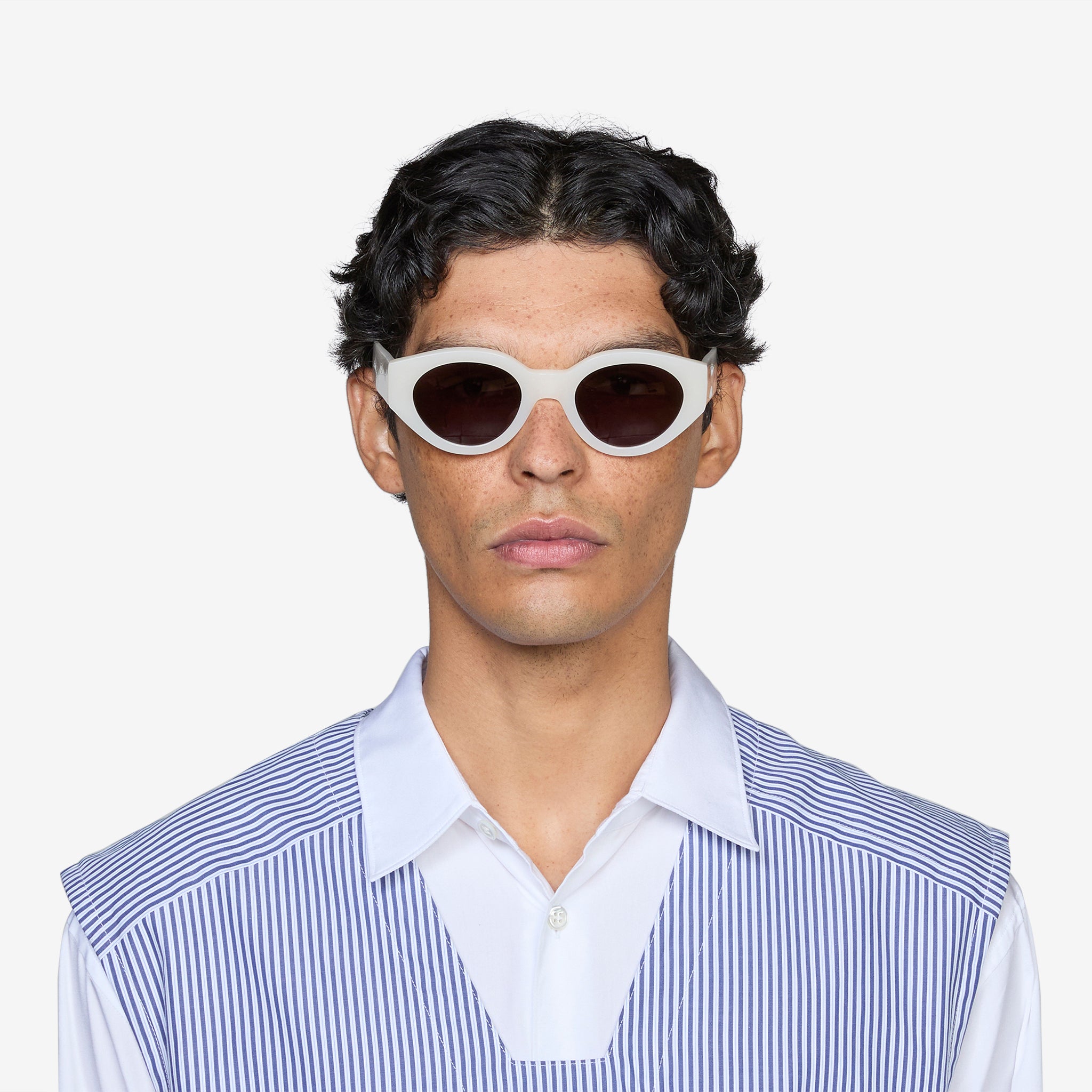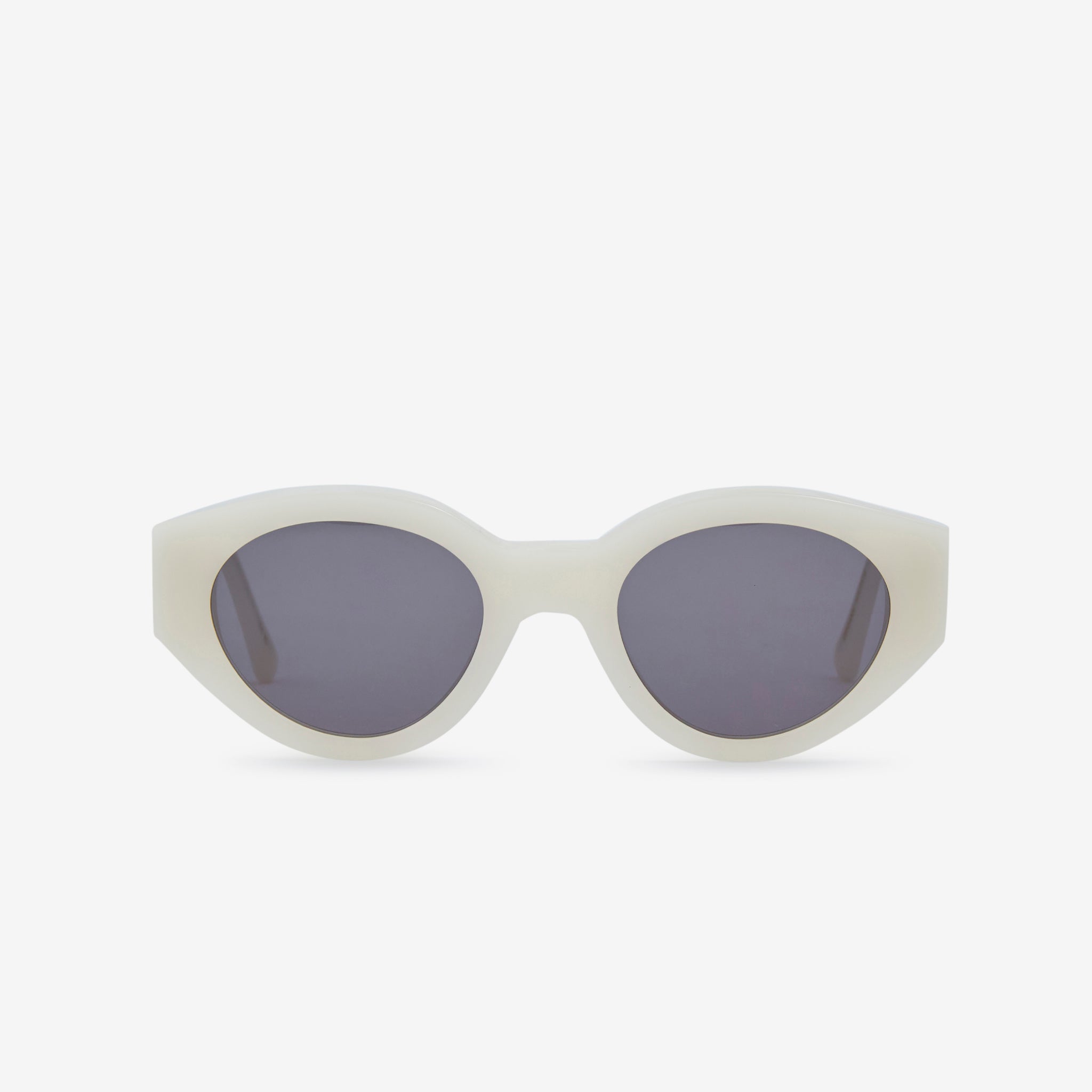 Polly from Monokel Eyewear in Pearl with a solid grey lens. These soft oval frames with wide temples are crafted from organic and biodegradable acetate. They feature 100% UV protective Carl Zeiss Vision lenses as well as stainless steel hinges and teflon covered hinge screws.