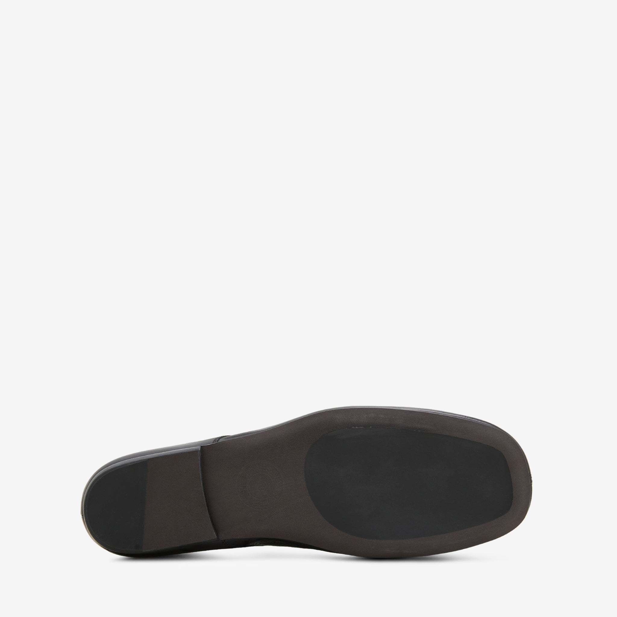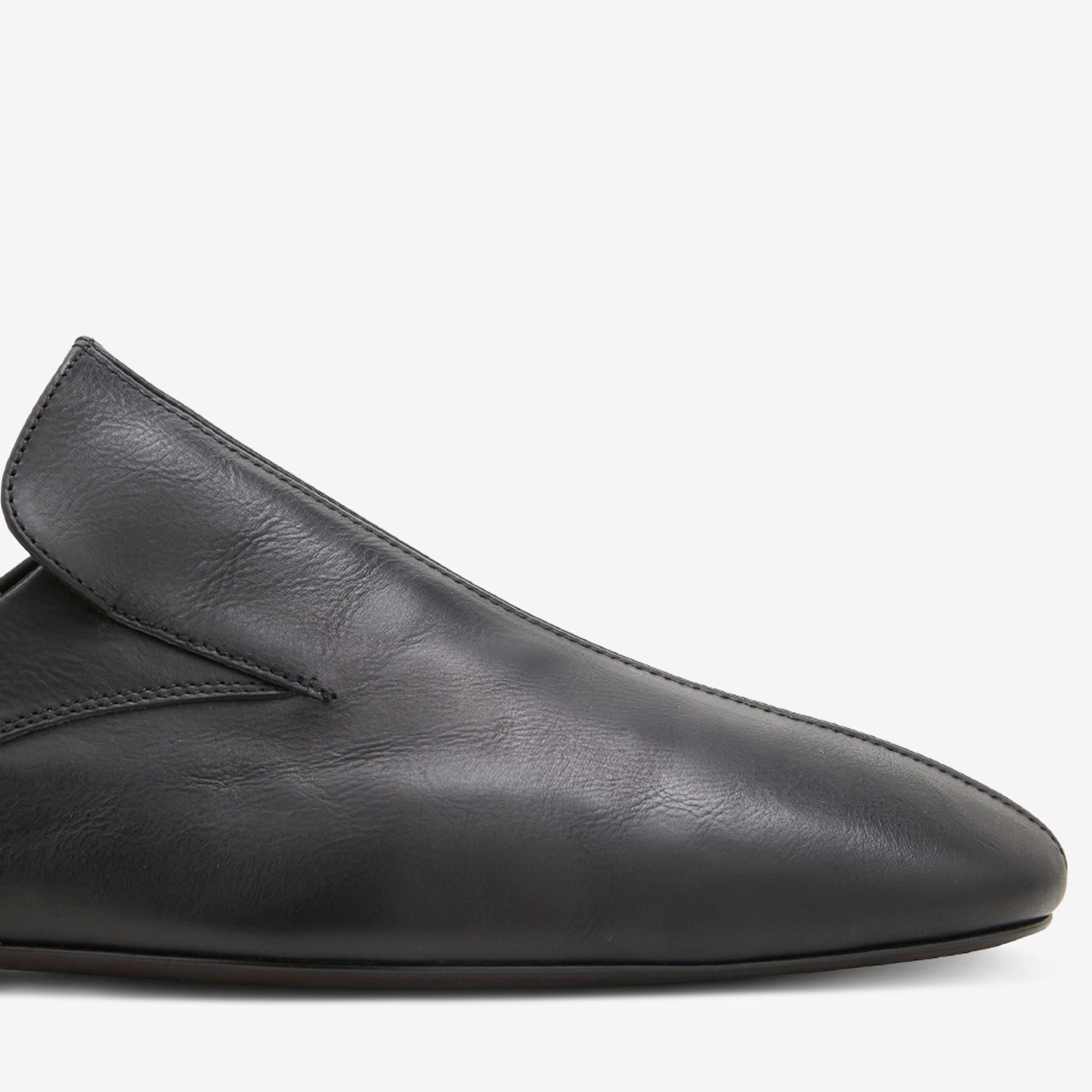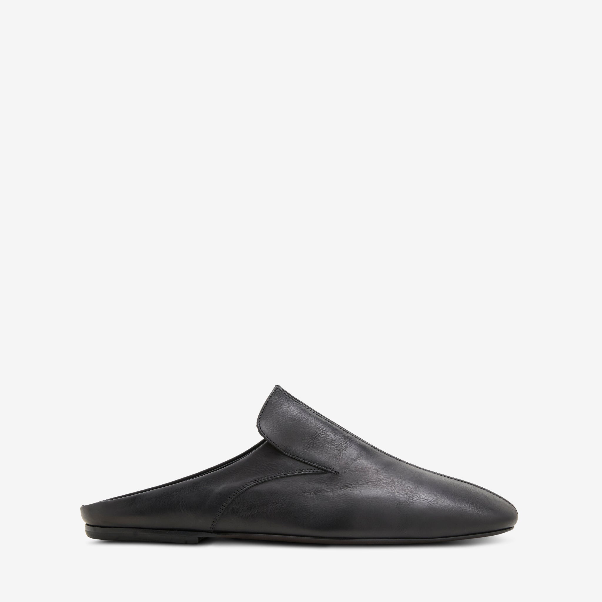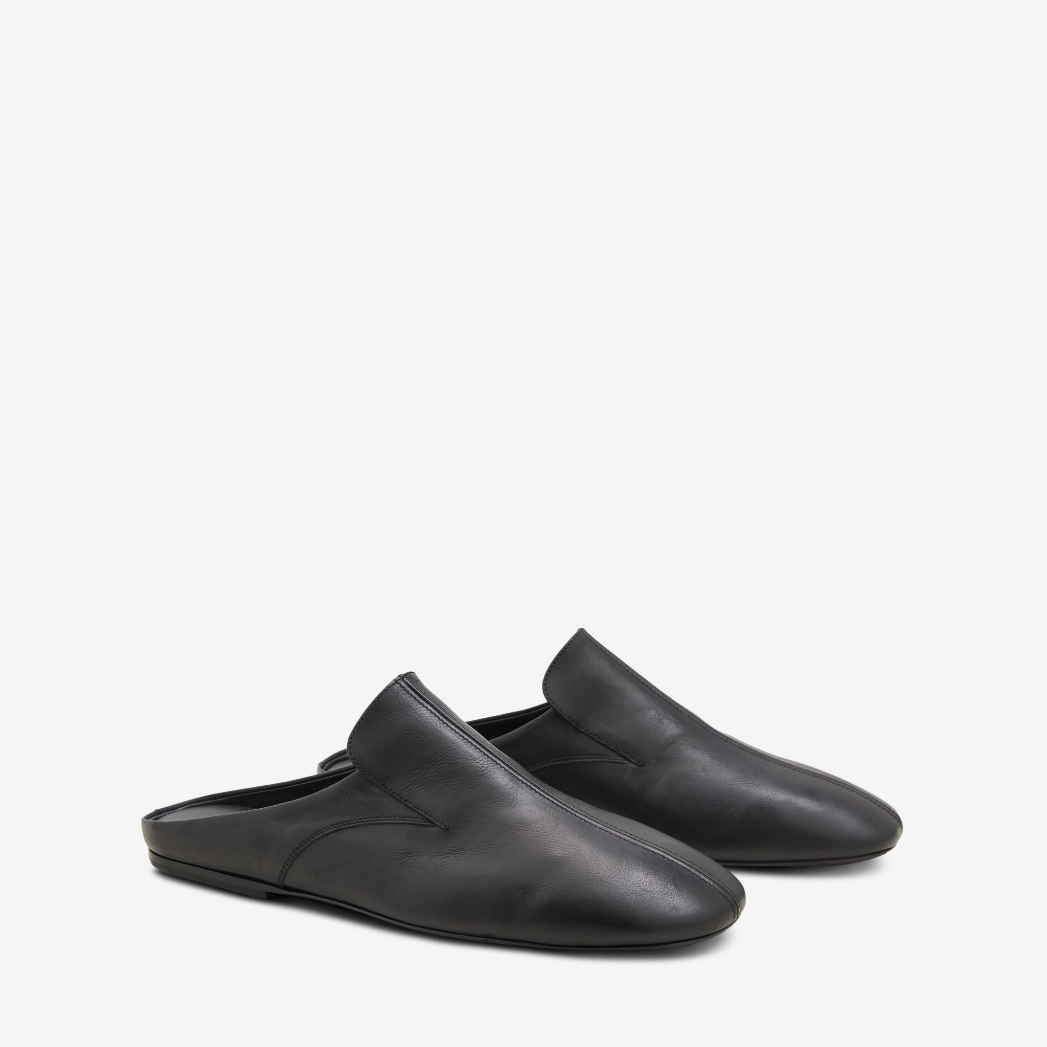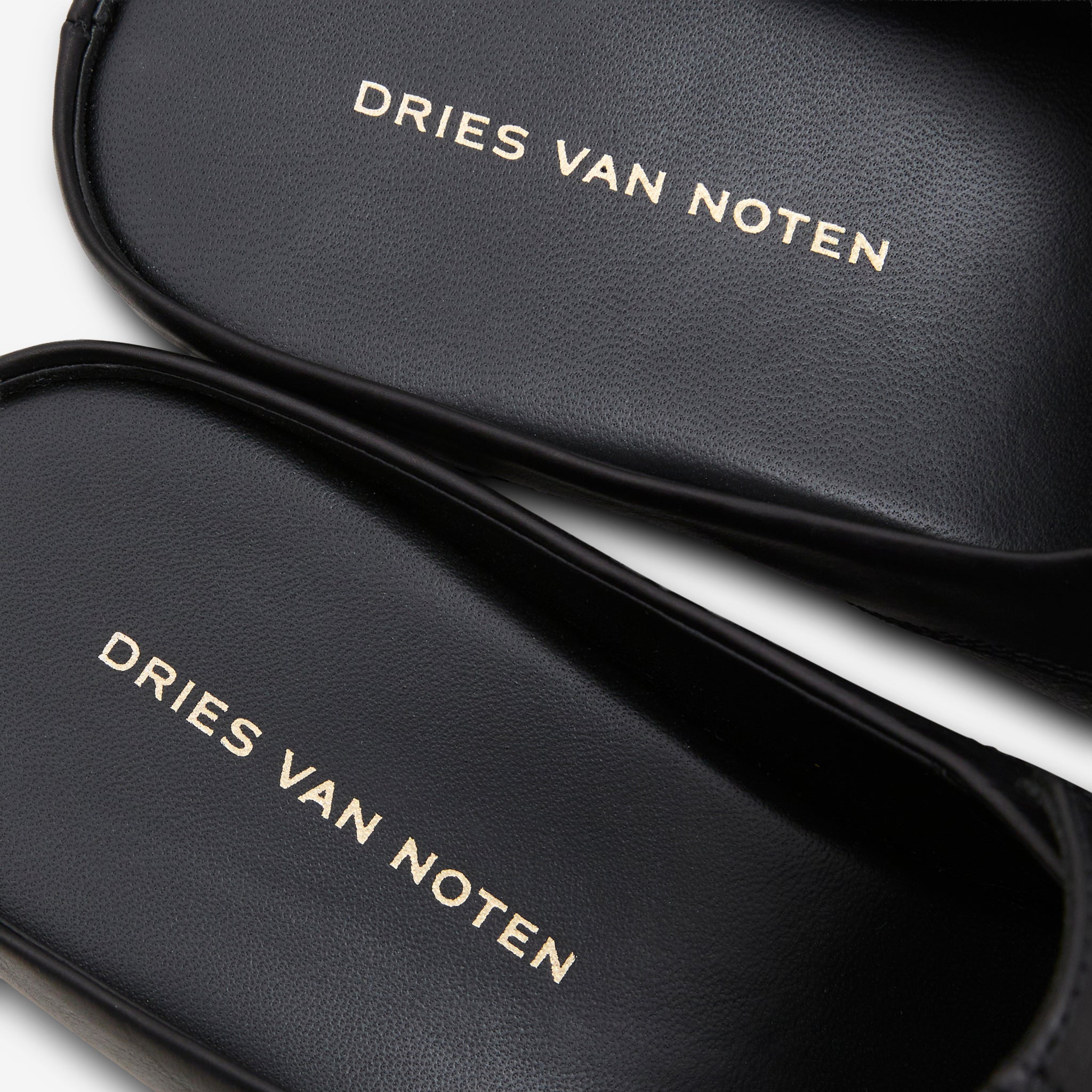 Unisex Leather Mule in Black from Dries Van Noten. Slip on, low profile mules with panelled construction details. Crafted from premium leather in a subtle grain. Finished with a slim sole and gold foil branding at the footbed.
