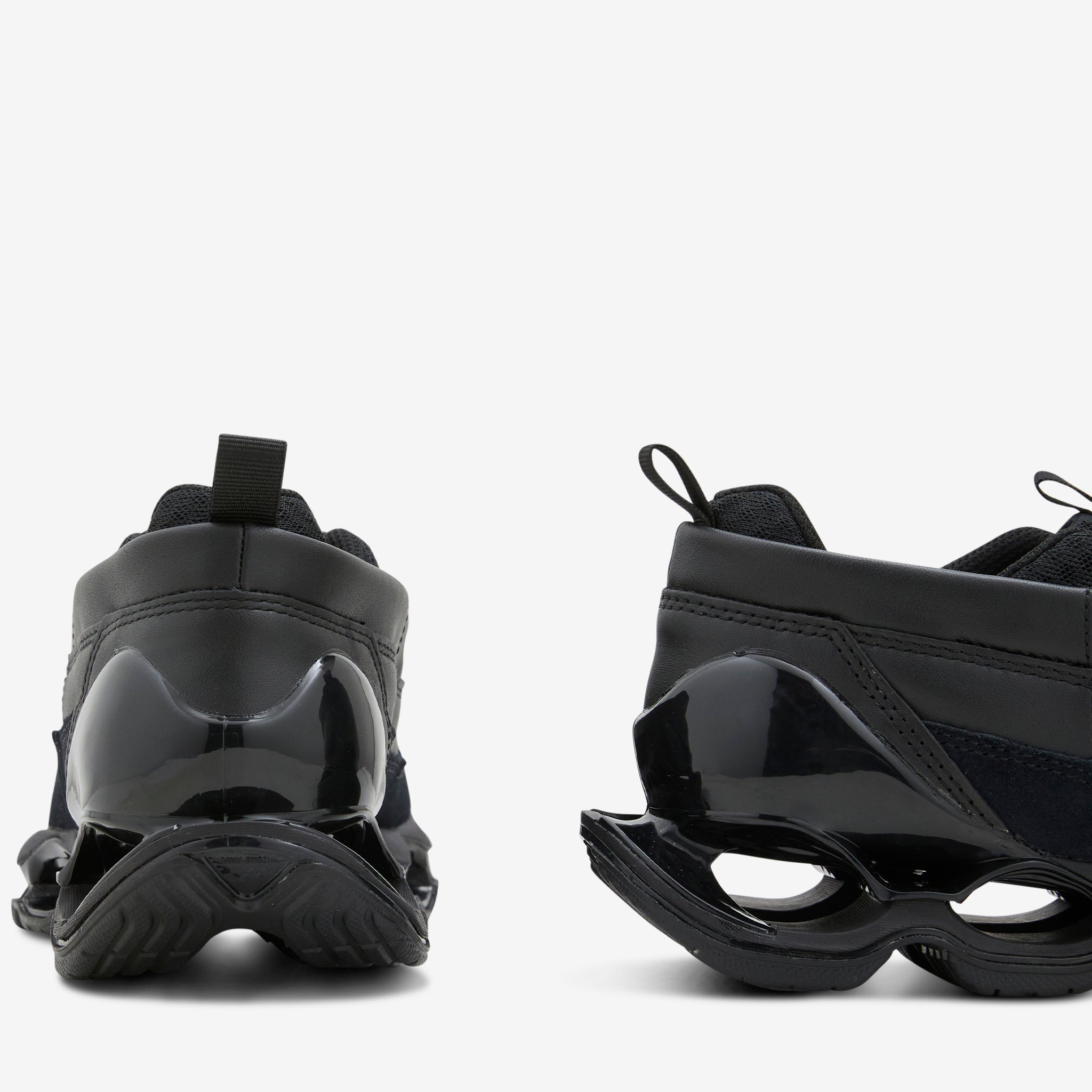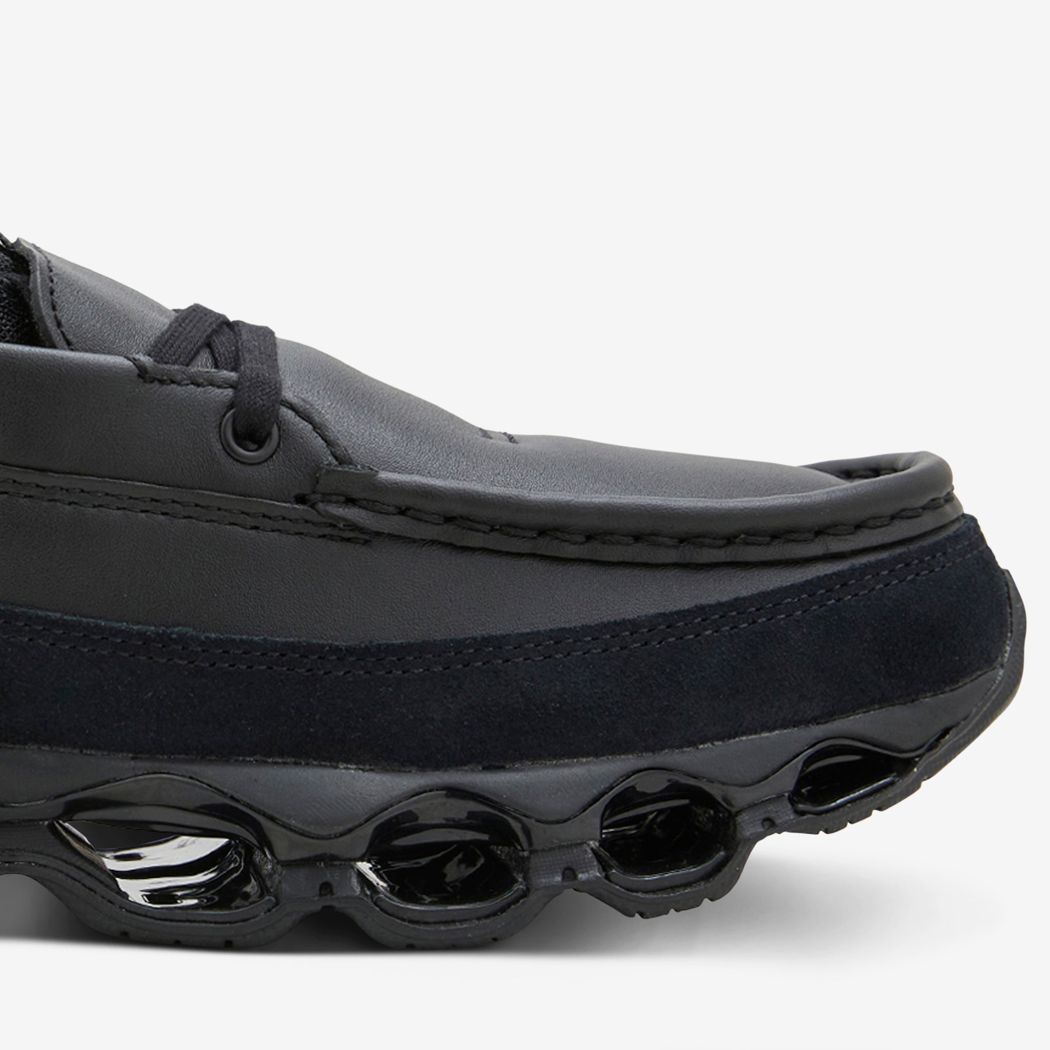Men's Wave Prophecy Moc in Black from Mizuno. Hybrid silhouette with a moc-style leather upper and lace closure. Prophecy sole unit provides unparalleled comfort and support through Infinity Wave technology and U4ic midsole foam. Finished with a supportive heel cage and heel tab.