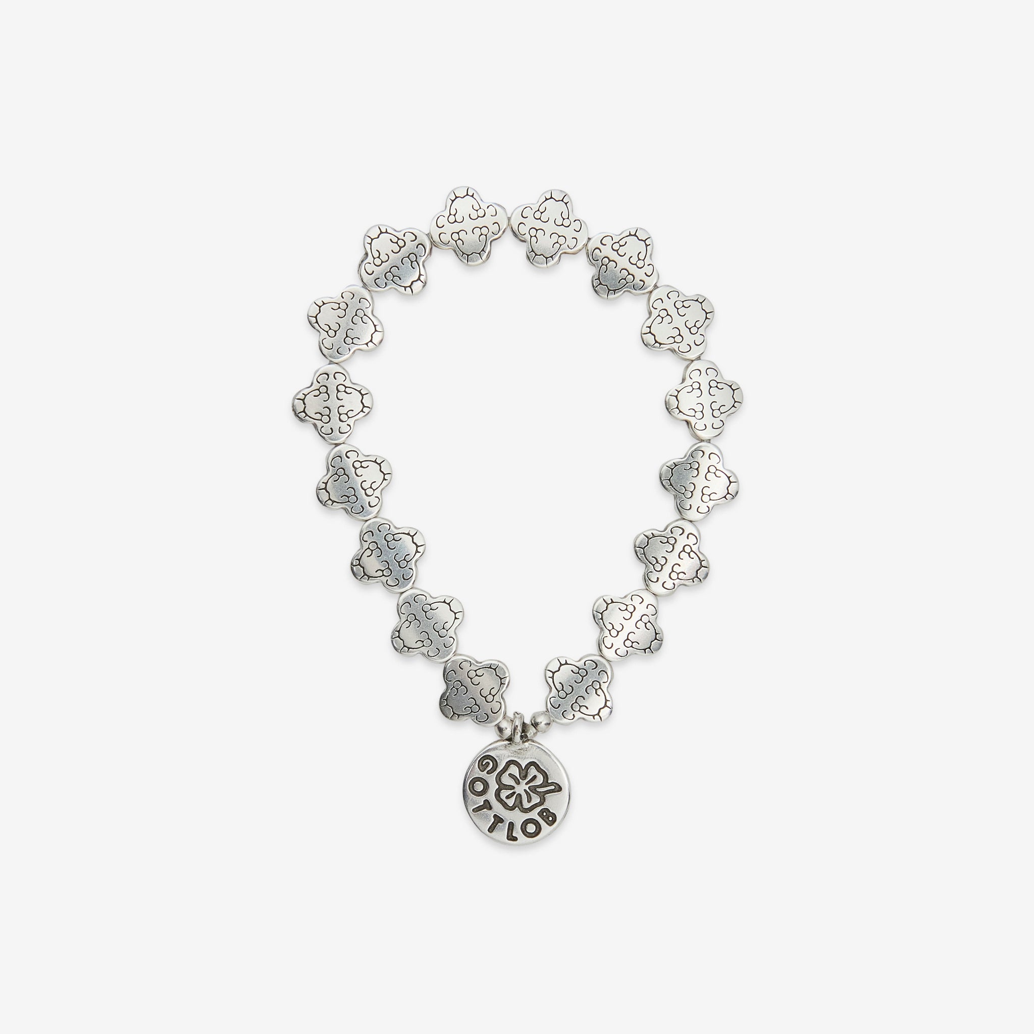 Edition No.1 Bracelet in Silver and Gold from Gottlob. Elastic beaded bracelet featuring custom-engraved 999 Silver and finished with a branded charm in silver plating.