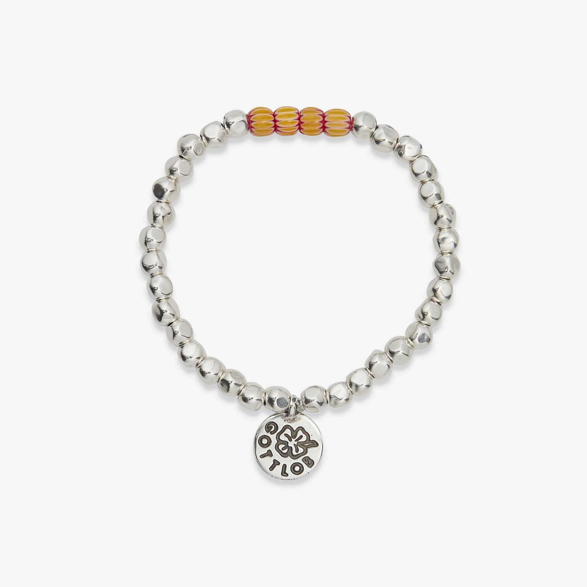 Edition No. 2 Bracelet in Orange and Dark Red from Gottlob. Elastic beaded bracelet featuring 999 Silver plated beads with an uneven round shape and four highlight Murano beads. Finished with a branded charm in silver plating.