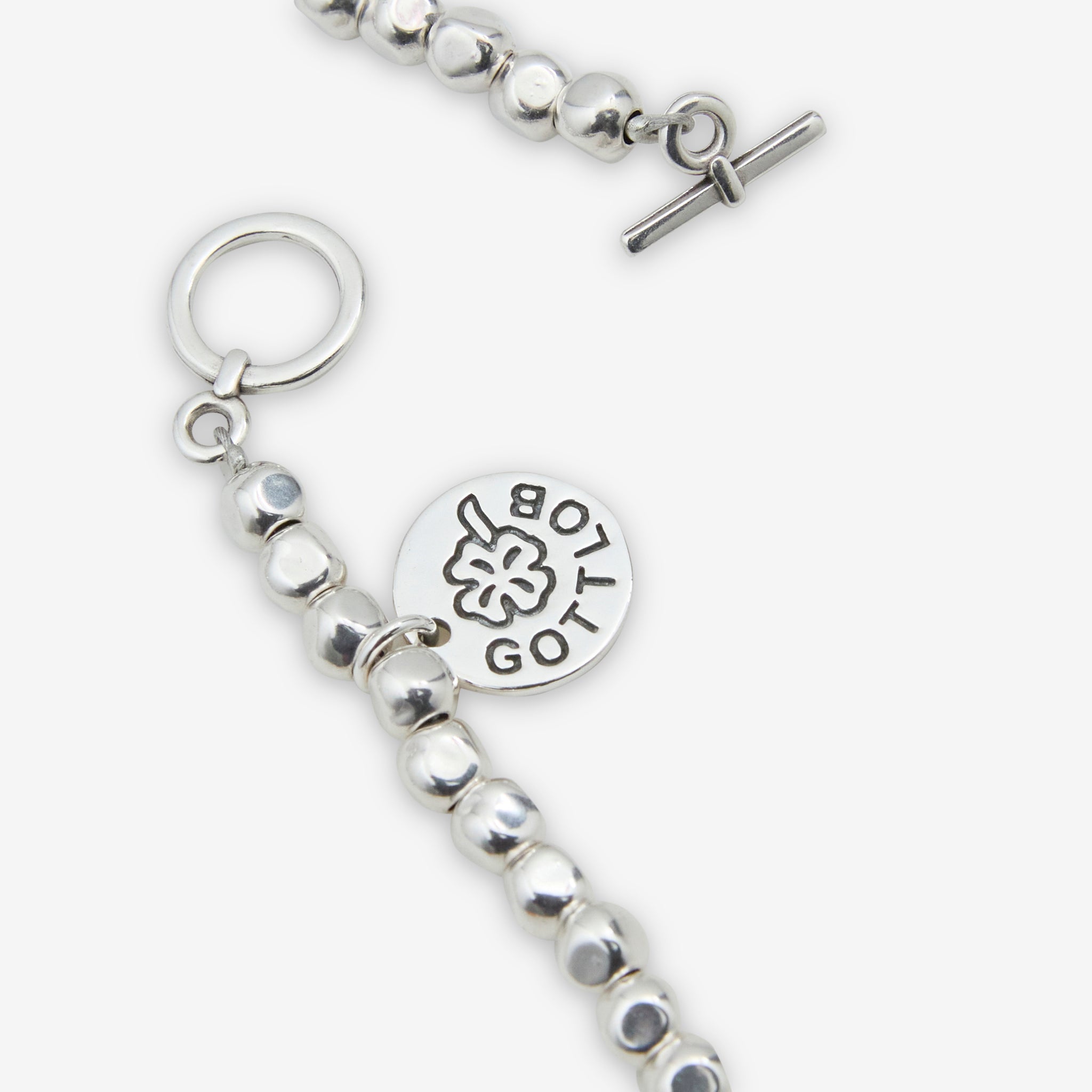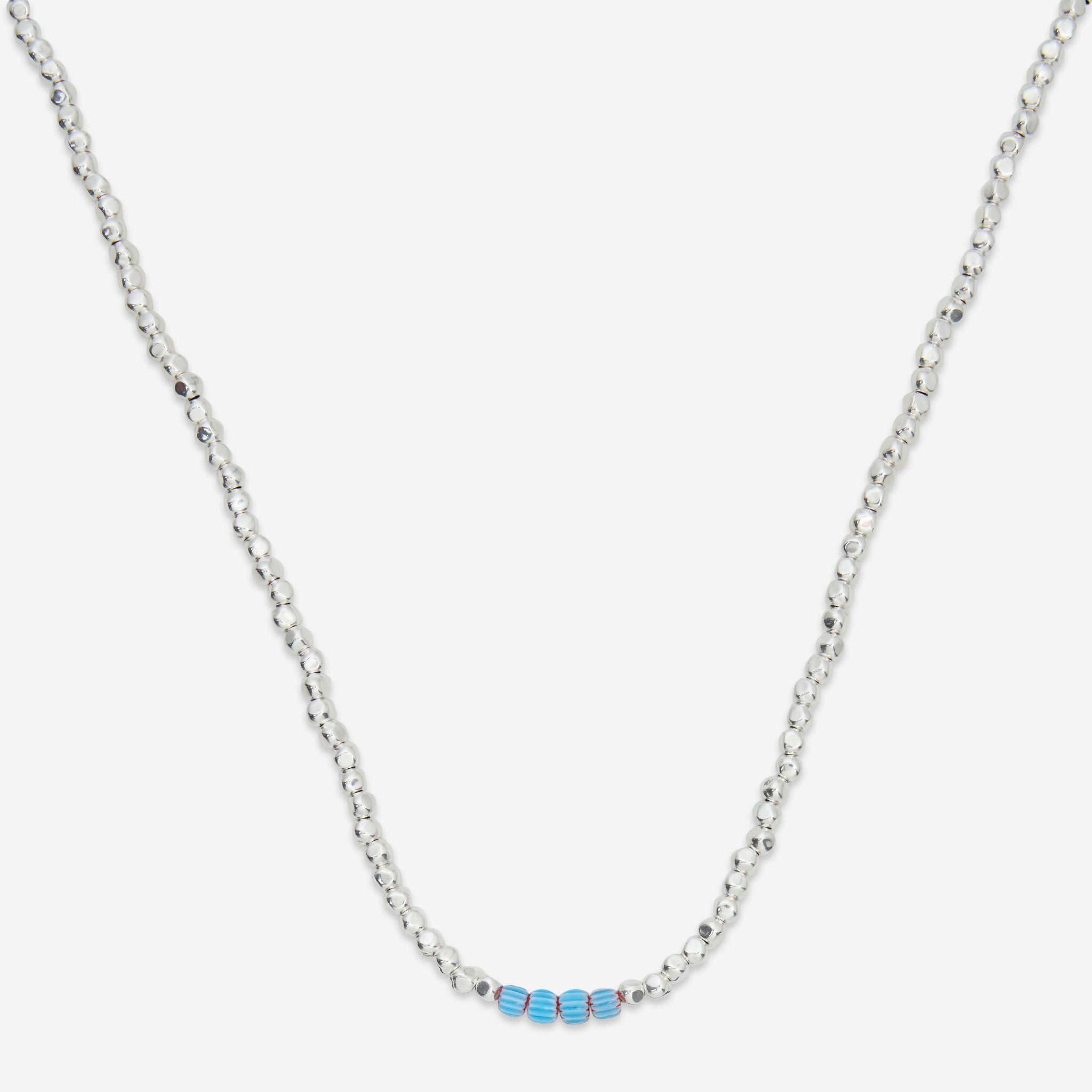 Edition No. 2 Necklace in Turquoise and Red from Gottlob. Features 999 Silver plated beads with an uneven round shape and four highlight Murano beads. Finished with a branded charm in silver plating.