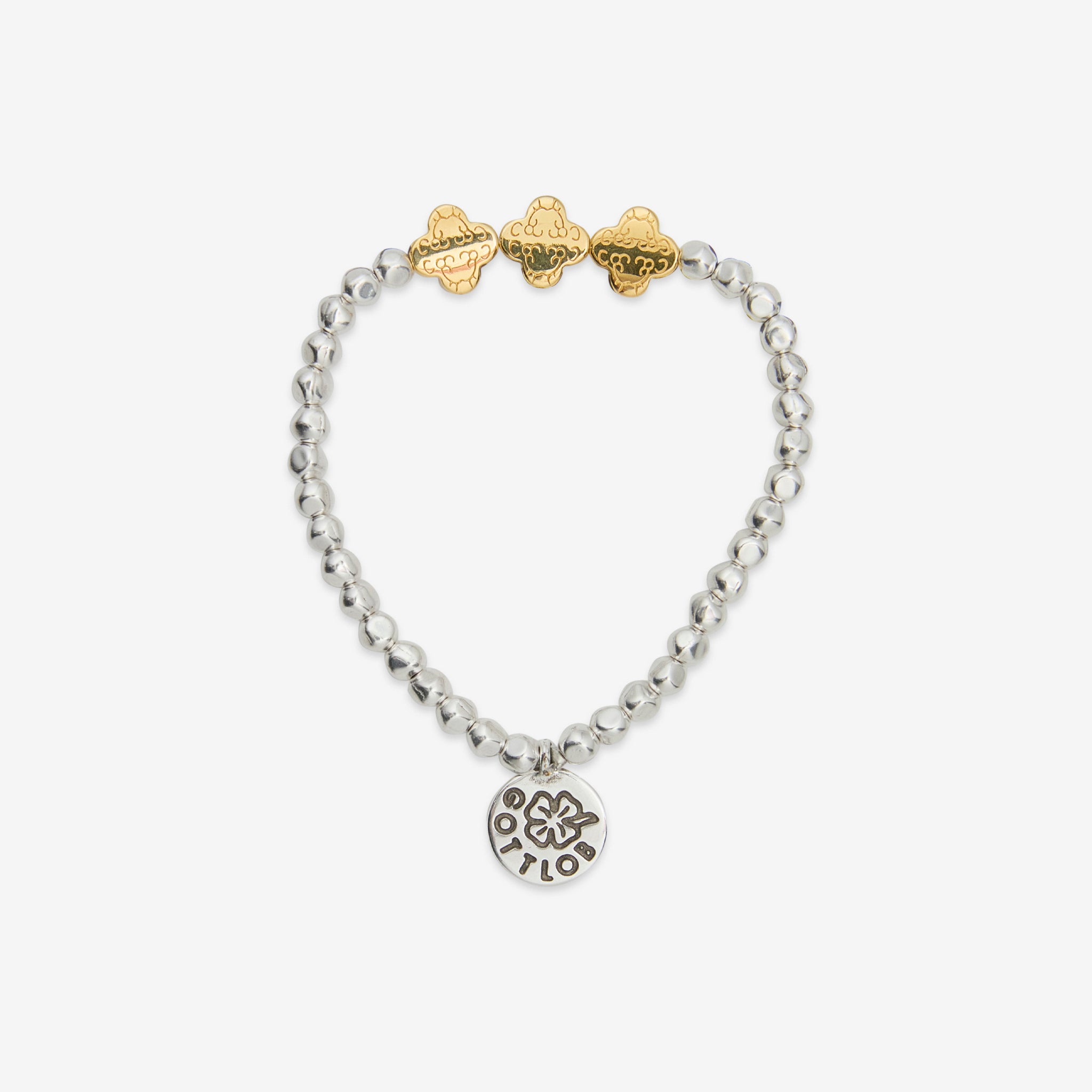 Edition No. 4 Bracelet in Silver and Gold from Gottlob. Elastic beaded bracelet featuring 999 silver plated irregular beads and three custom-engraved 24K Gold plated clover beads. Finished with a branded charm in silver plating.