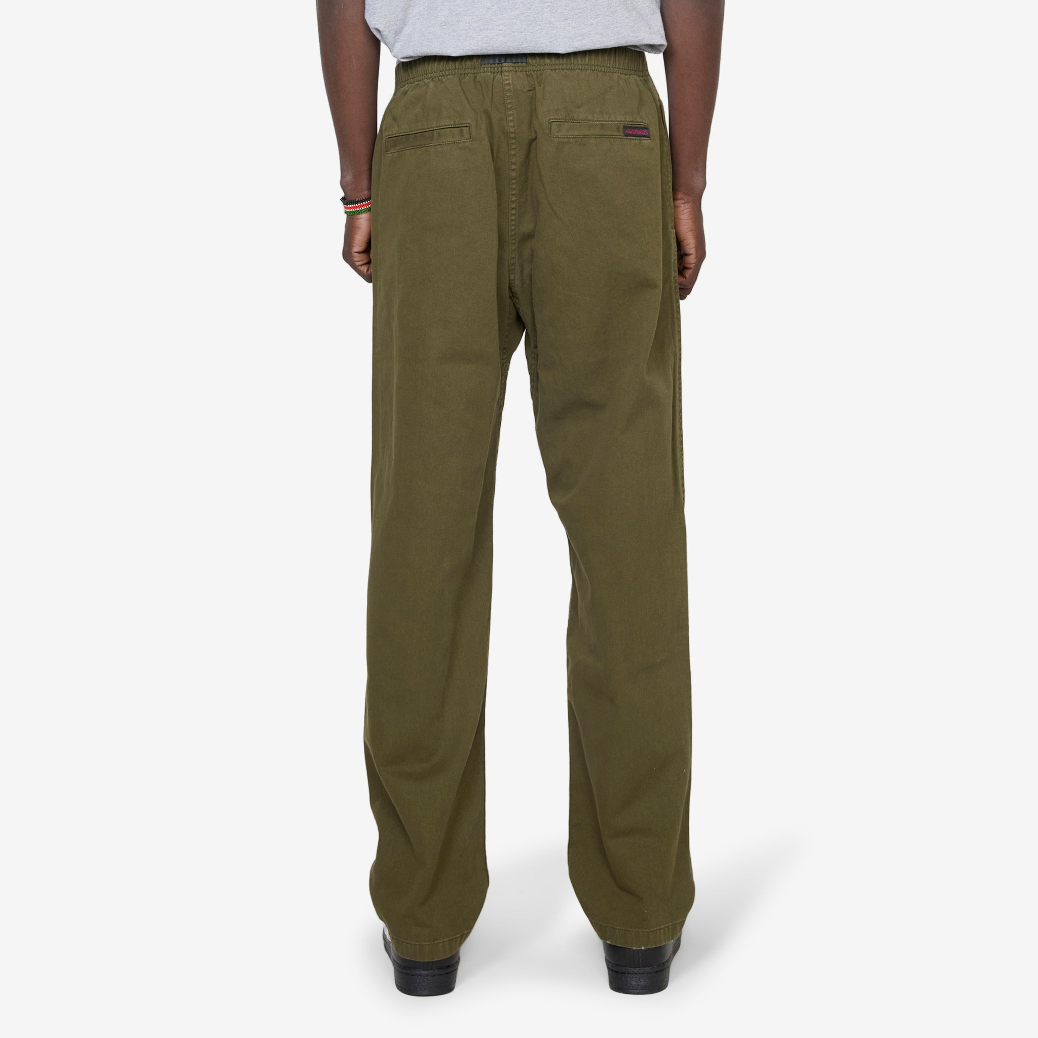 Gramicci Pant in Pine from Gramicci. Relaxed fit pants with a gusset crotch for ease of movement and an elasticised waistband with an integrated belt. Crafted from organic cotton twill for durability. Four-pocket construction with side seam pockets and welt pockets with velcro closure on the back.