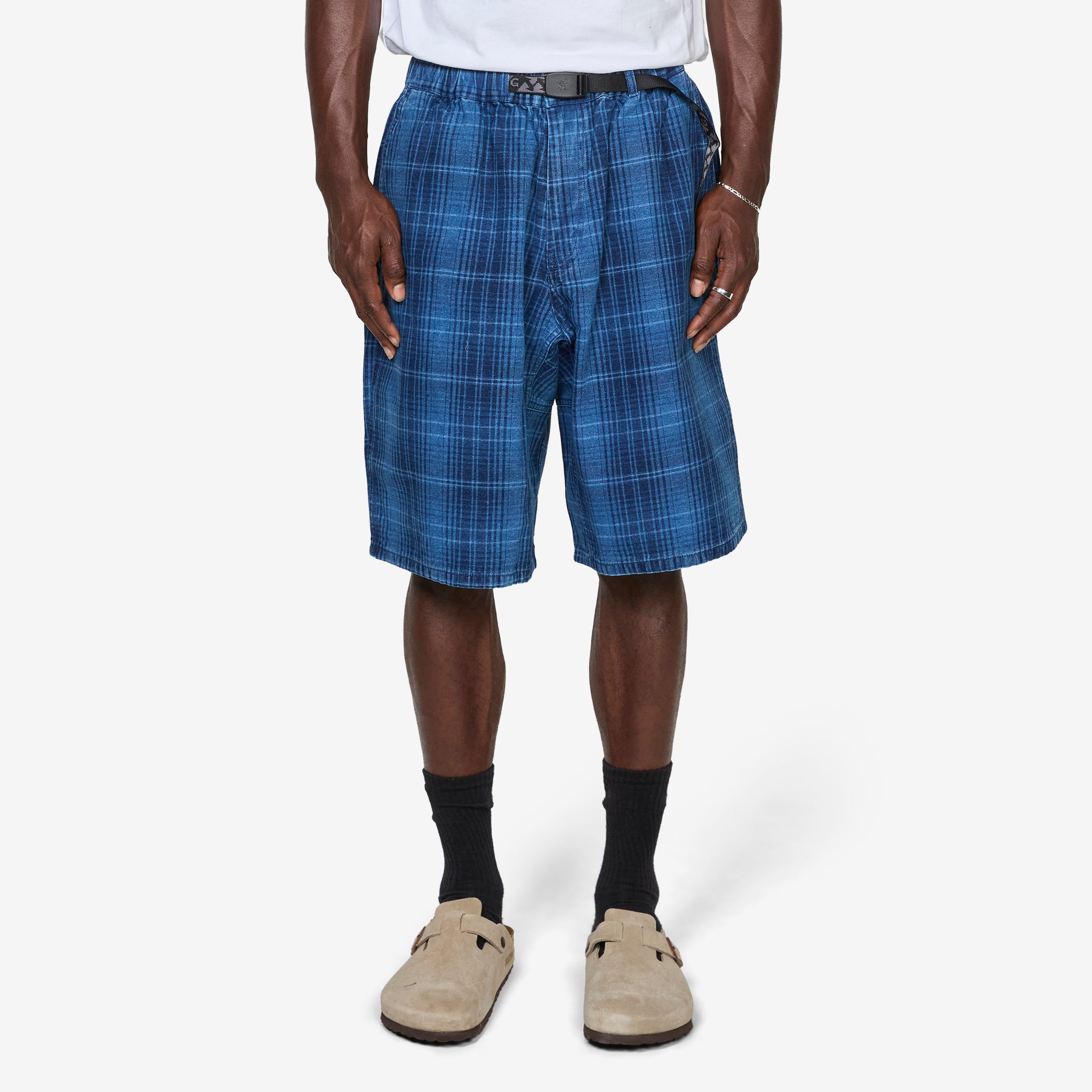 Lagoon Short Denim Plaid in Indigo Checkered Plaid from Gramicci. Relaxed-fit shorts with diamond shaped gusset crotch for ease of movement and an integrated nylon cinch belt. Crafted from 10oz cotton denim with four pocket styling and finished with tag logo at back pocket.