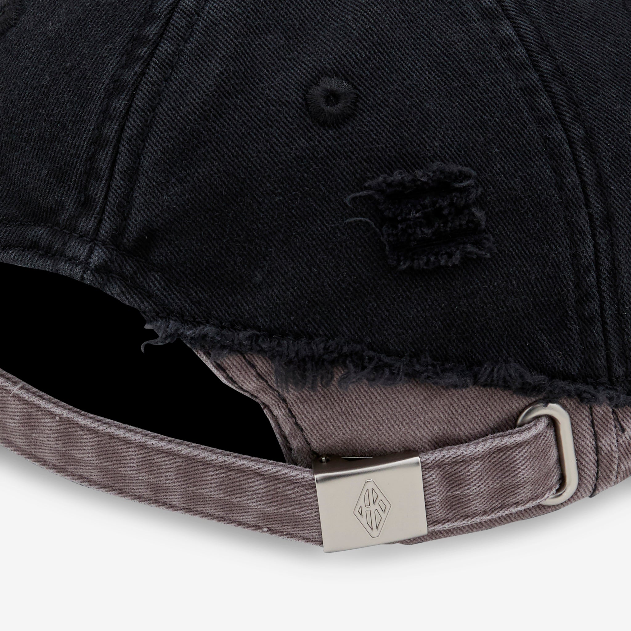 Diamond Cap in Black from Han Kjøbenhavn. 6-panel cap with embroidered ventilating eyelets and a self fabric backstrap with metal clasp closure. Crafted from distressed cotton twill with signature cut line diamond panel detailing.