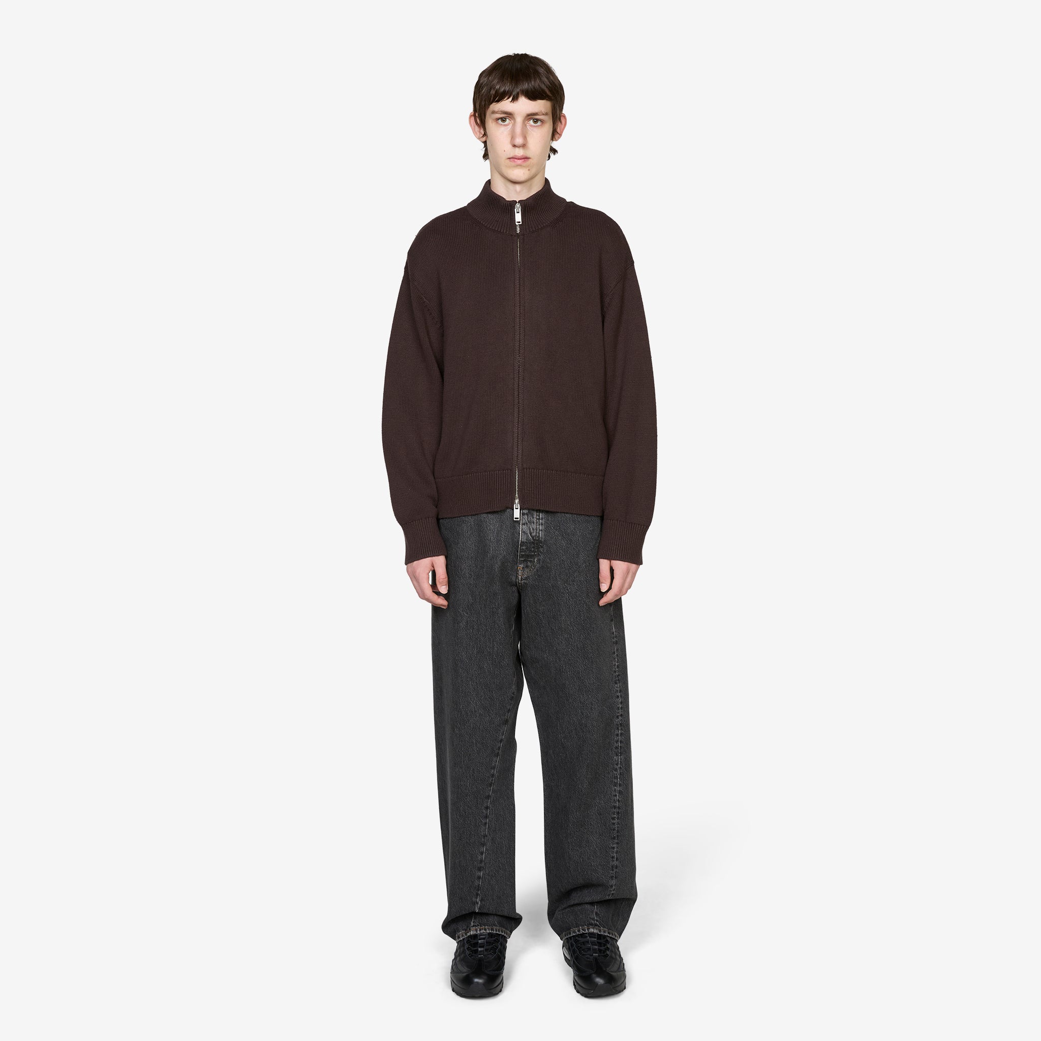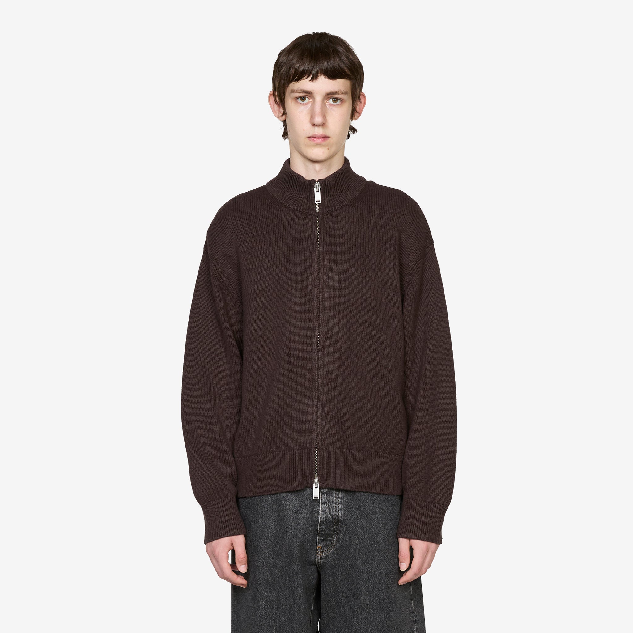 Diamond Detail Zip Cardigan in Dark Brown Diamond from Han Kjøbenhavn. Relaxed fit cardigan with 2-way full-zip closure, dropped shoulders and a rib knit stand collar, cuffs and hem. Crafted from a warm yet breathable cotton wool blend with diamond seam detailing at the back. Finished with a stainless steel brand plaque at the rear neck.