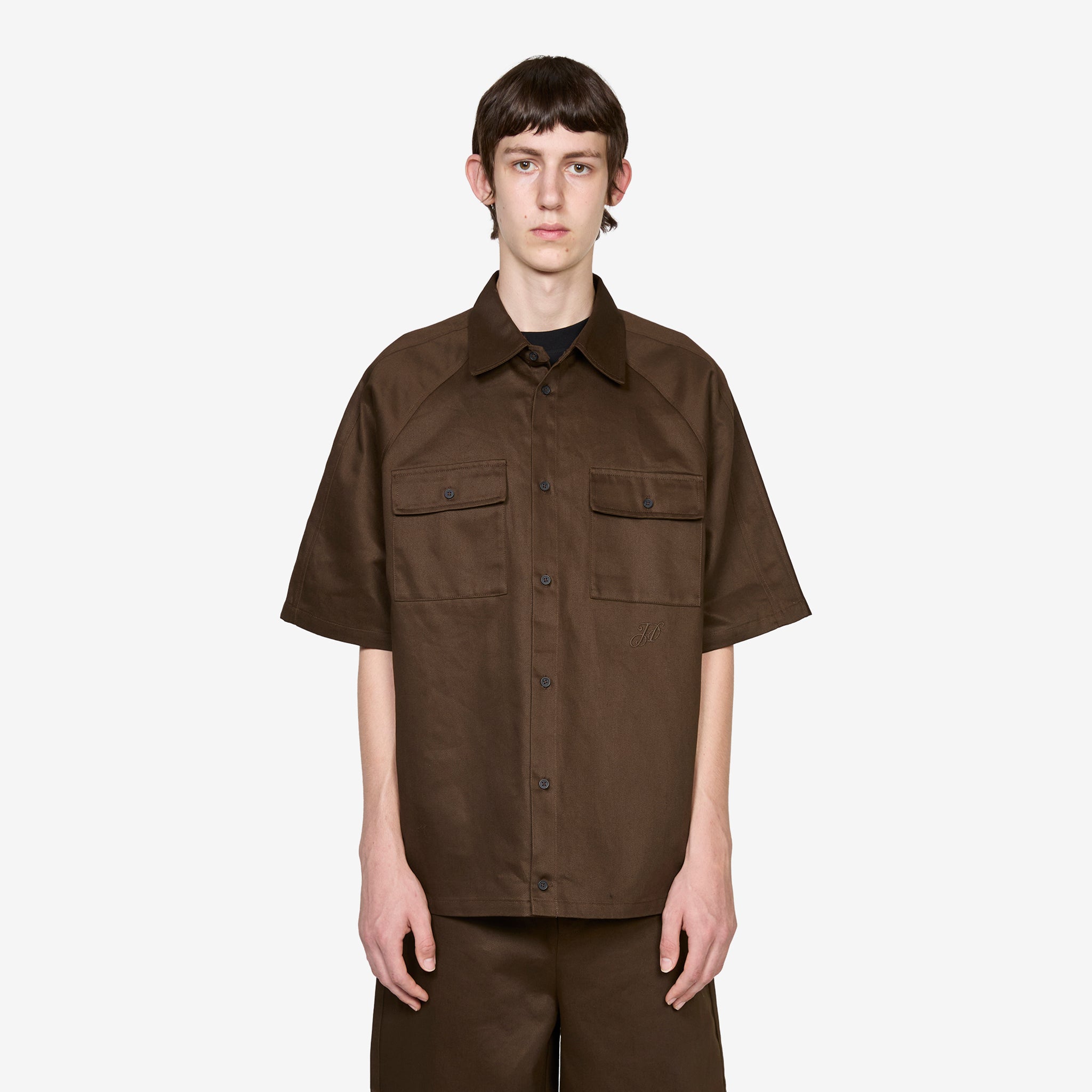 Oversized Cotton Twill Shirt in Brown from Han Kjøbenhavn. Oversized fit shirt with a classic collar, full button closure and two flap-closure chest pockets. Crafted from a sturdy cotton twill with raglan sleeve construction. Finished with signature tonal embroidery at the chest pocket.
