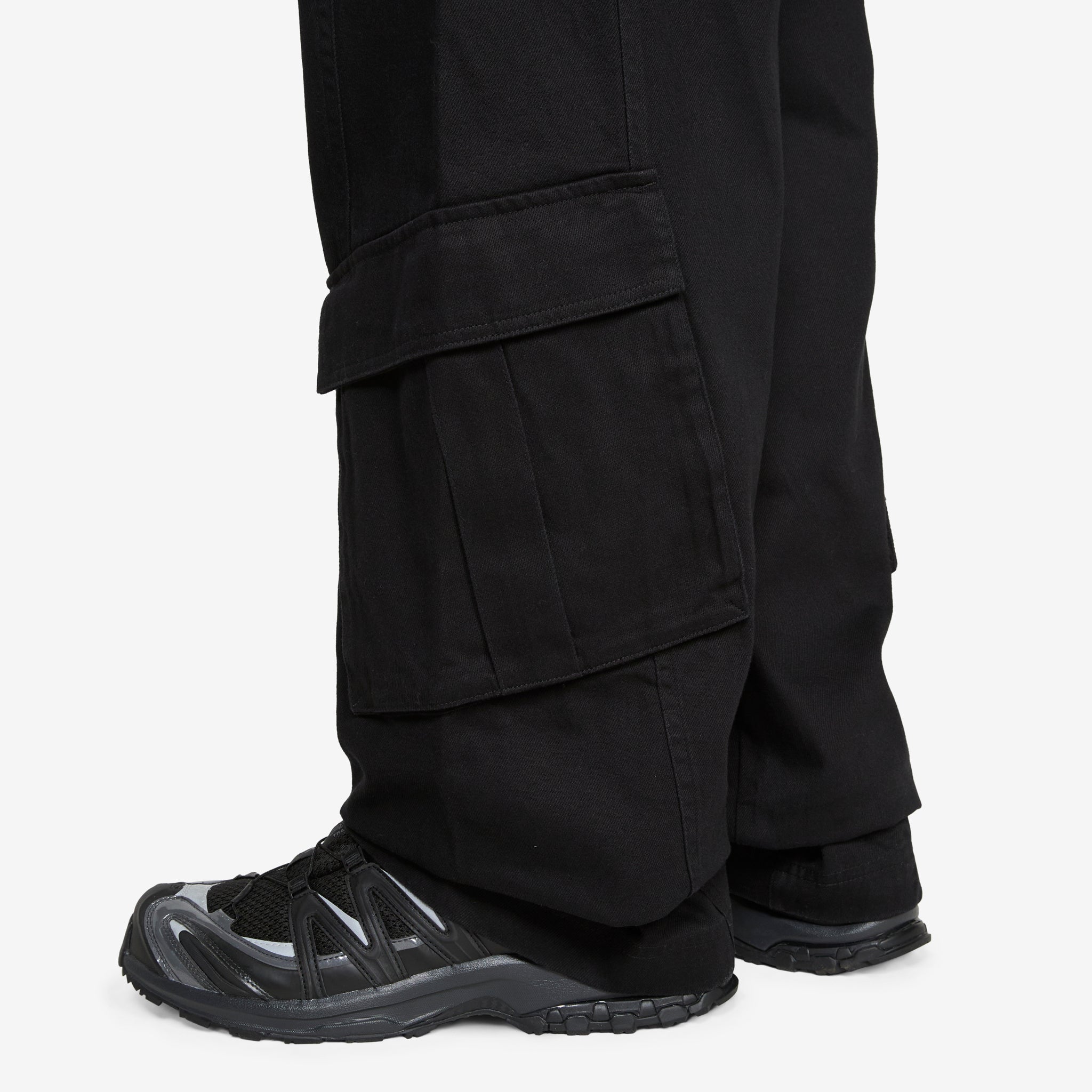 Washed Cargo Pants in Black from Han Kjøbenhavn. Oversized fit pants with a belt loop waistband, 4-pocket styling and mid rise silhouette. Crafted from a washed out cotton with double top-stitch details and darts at the knee for a curved shape. Finished with tilted 3D cargo pockets below the knee.