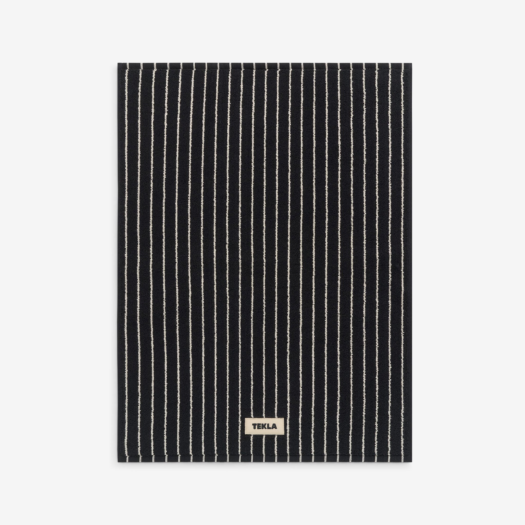 Bath Mat in Black Stripes from Tekla. Designed to balance absorbency and softness. Crafted from densely woven and extra-combed organic heavyweight cotton for longevity and maximum absorbency for drying with minimal effort. Finished with double-stitched hems, closed corners and a woven brand label.
