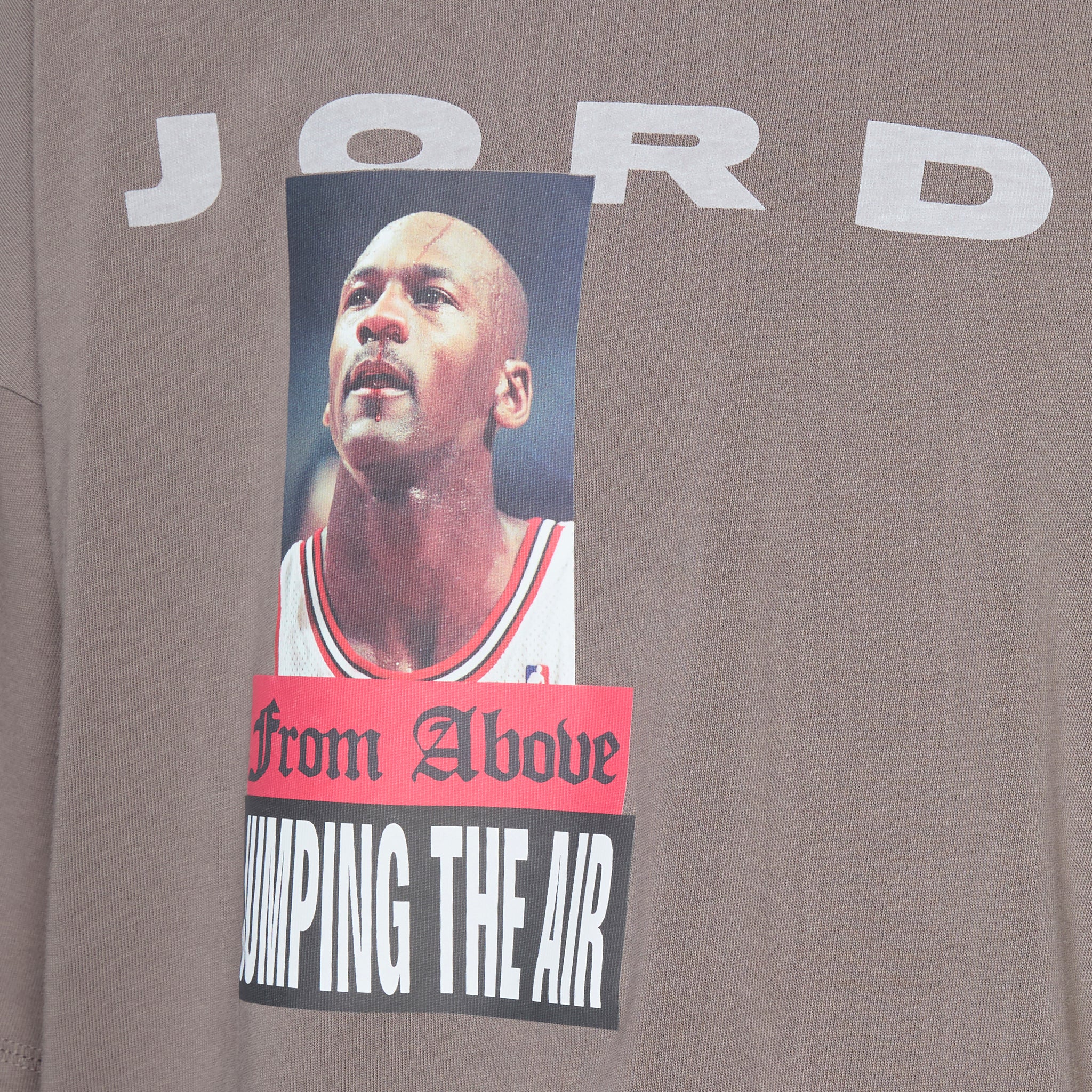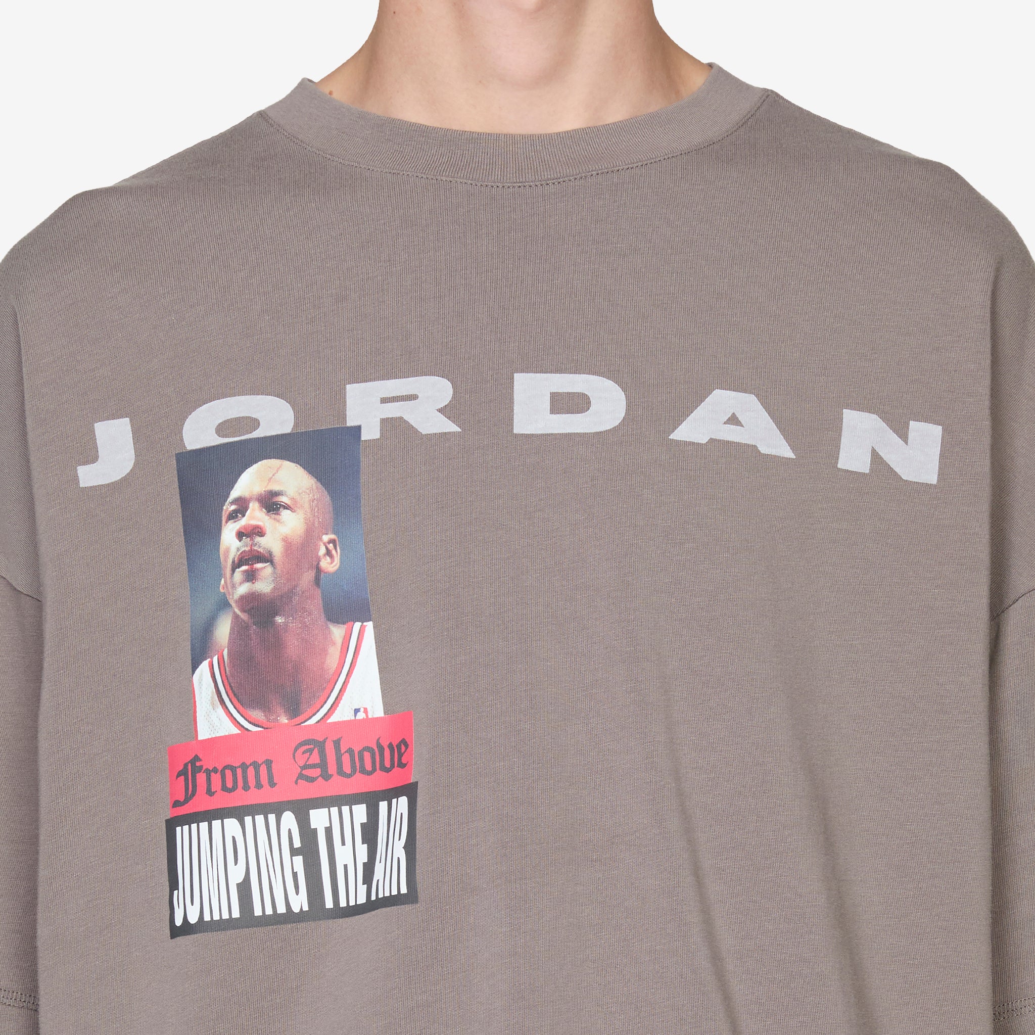 Above T-Shirt in Cave Stone from Jordan Brand. Boxy fit short-sleeve t-shirt with a ribbed collar. Crafted from cotton jersey for a soft hand feel. Finished with printed Jordan graphics at the front and back.