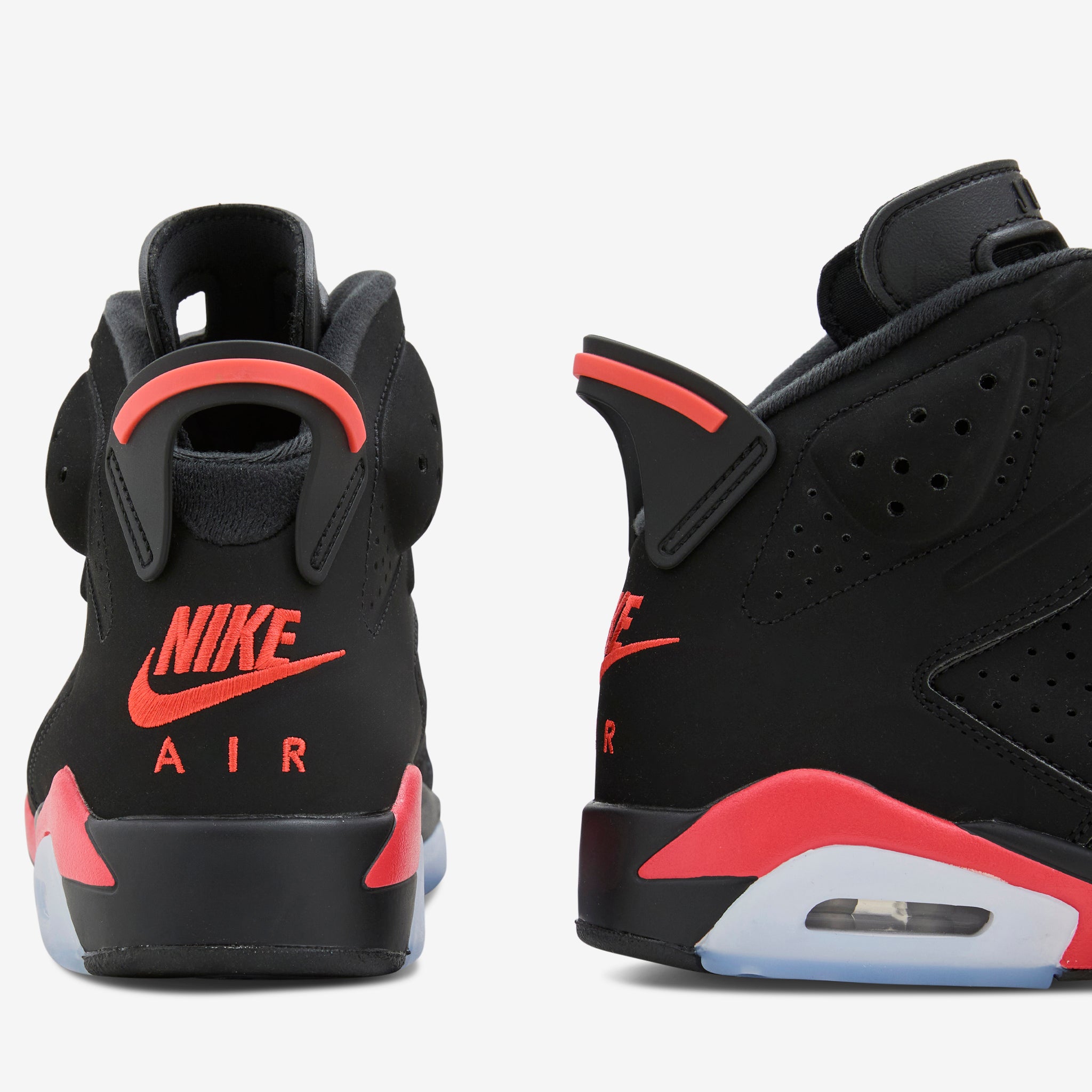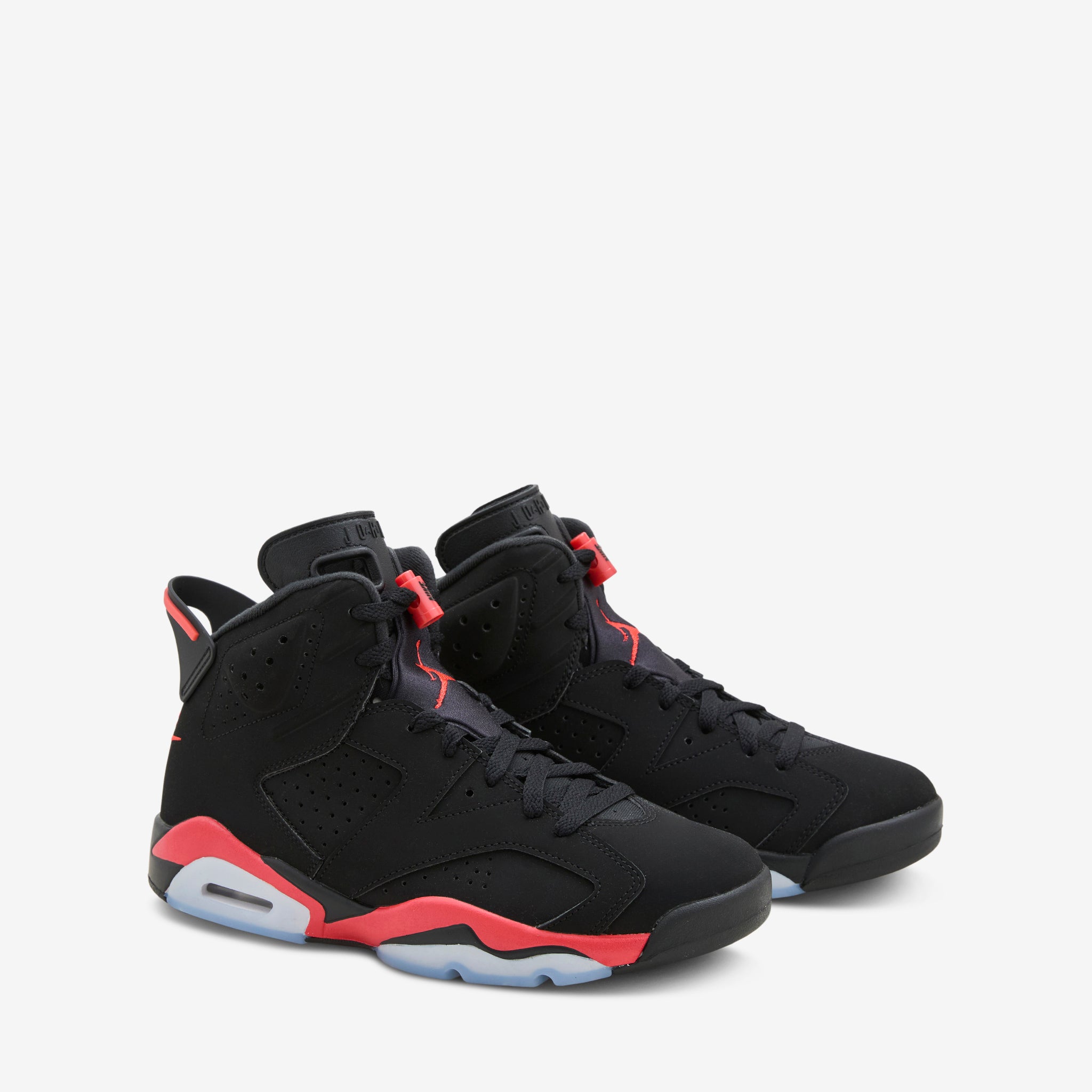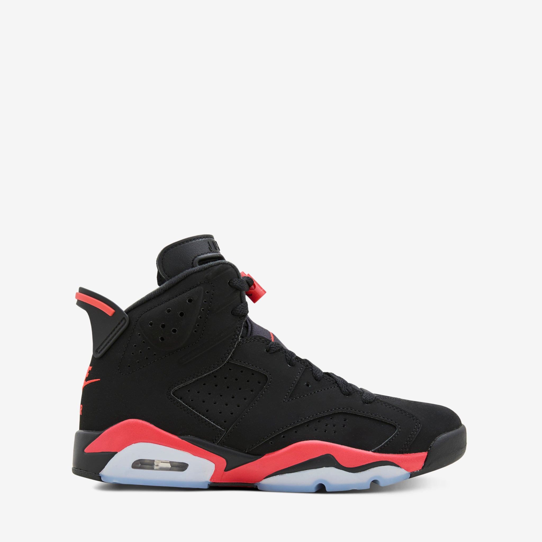 Air Jordan 6 Retro 'Infrared Salesman' in Black and Light Crimson from Jordan Brand. Back for the AJ6's 35th anniversary, this silhouette features a layered upper with bright Light Crimson branding at the heel and reversed accents at the midsole. Nike Air technology absorbs impact for cushioning with every step while the rubber outsole adds grip and durability. Finished with a sample tag and 'Not For Resale' tag at the inner collar.