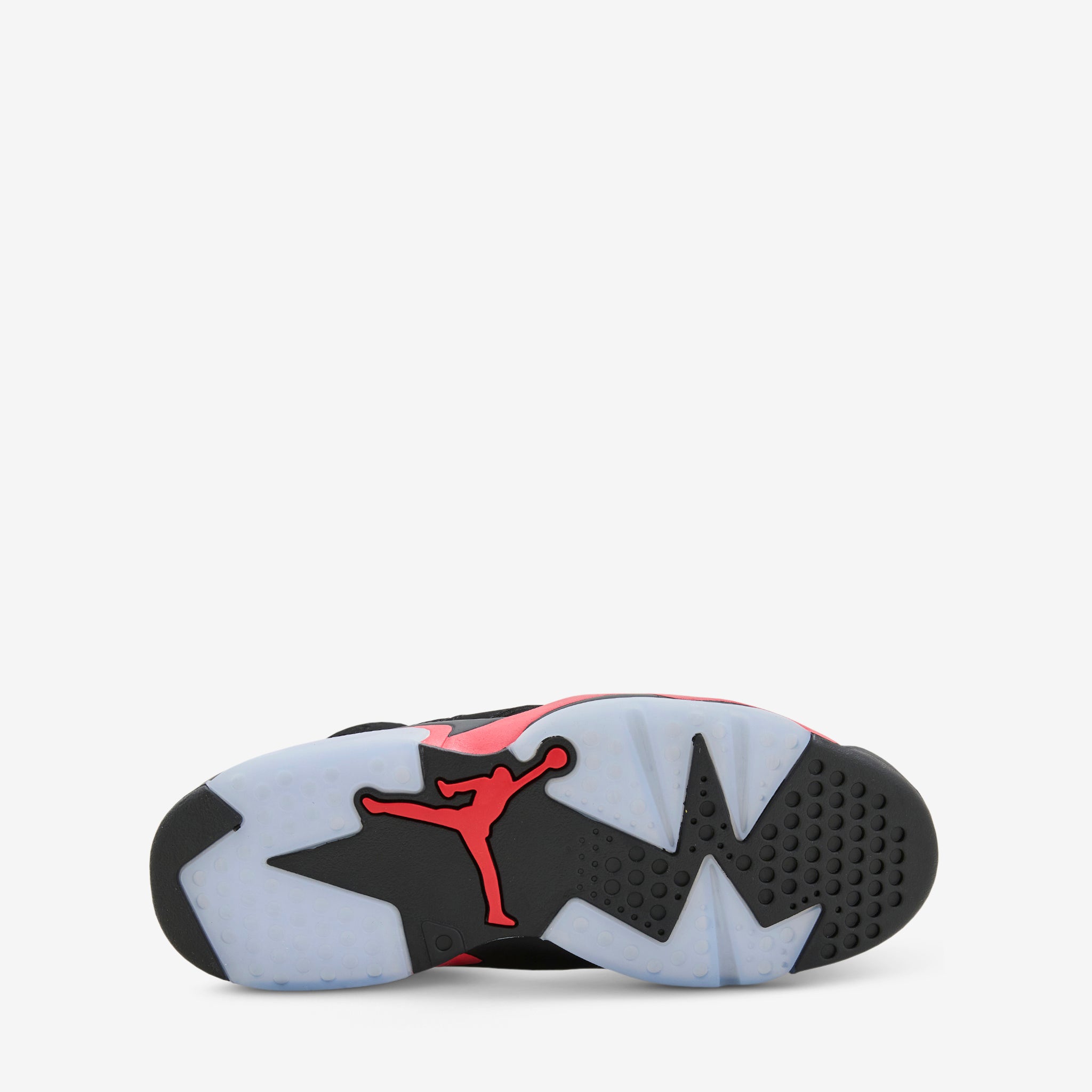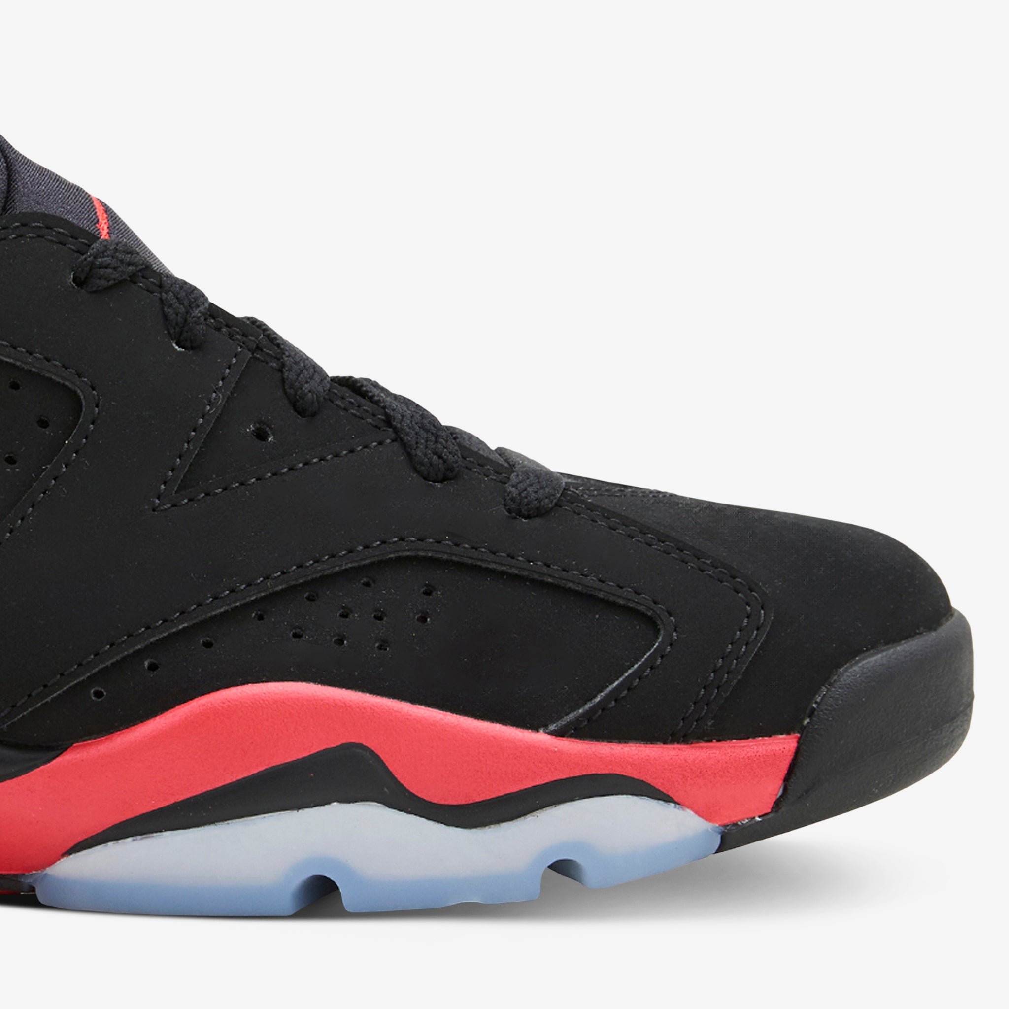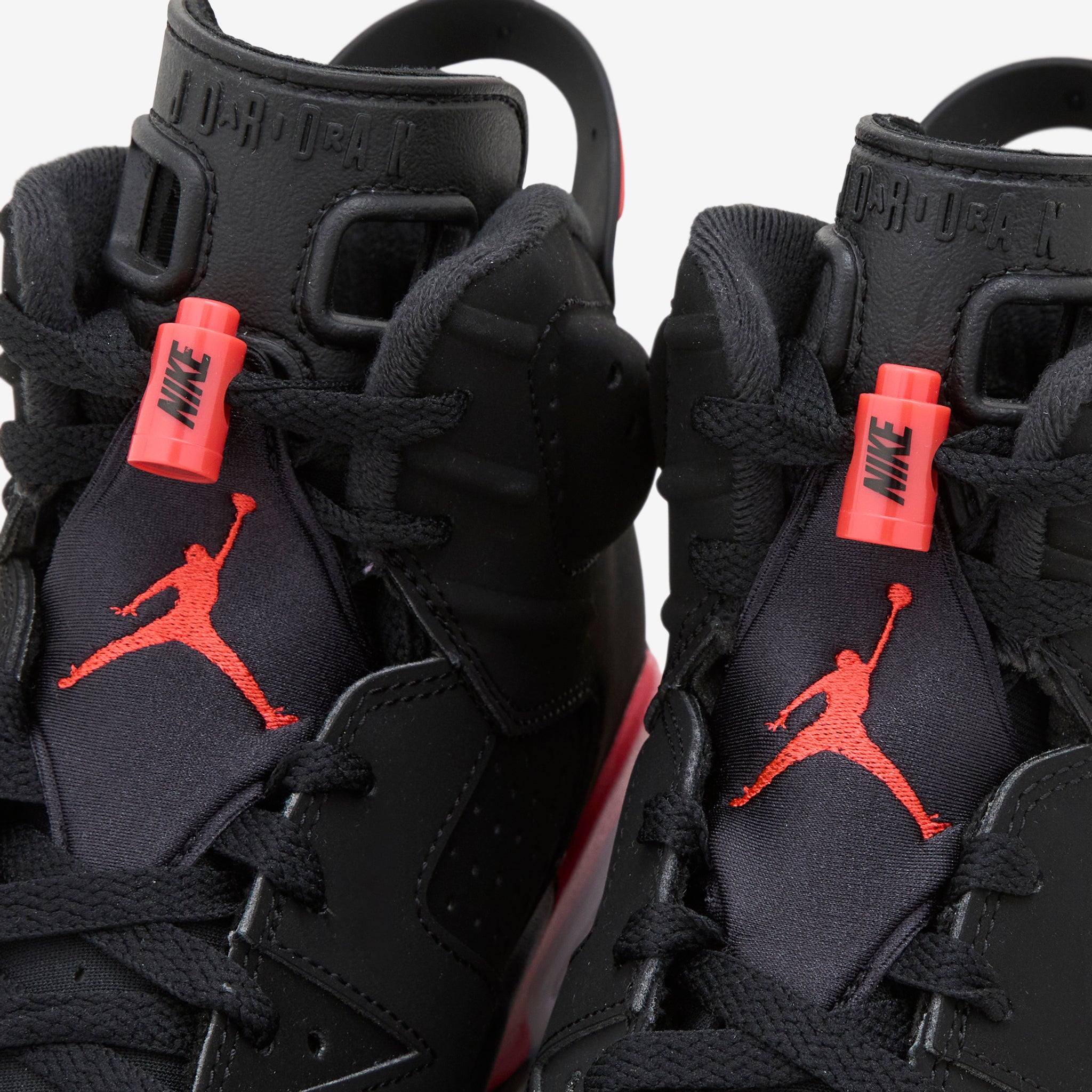 Air Jordan 6 Retro 'Infrared Salesman' in Black and Light Crimson from Jordan Brand. Back for the AJ6's 35th anniversary, this silhouette features a layered upper with bright Light Crimson branding at the heel and reversed accents at the midsole. Nike Air technology absorbs impact for cushioning with every step while the rubber outsole adds grip and durability. Finished with a sample tag and 'Not For Resale' tag at the inner collar.