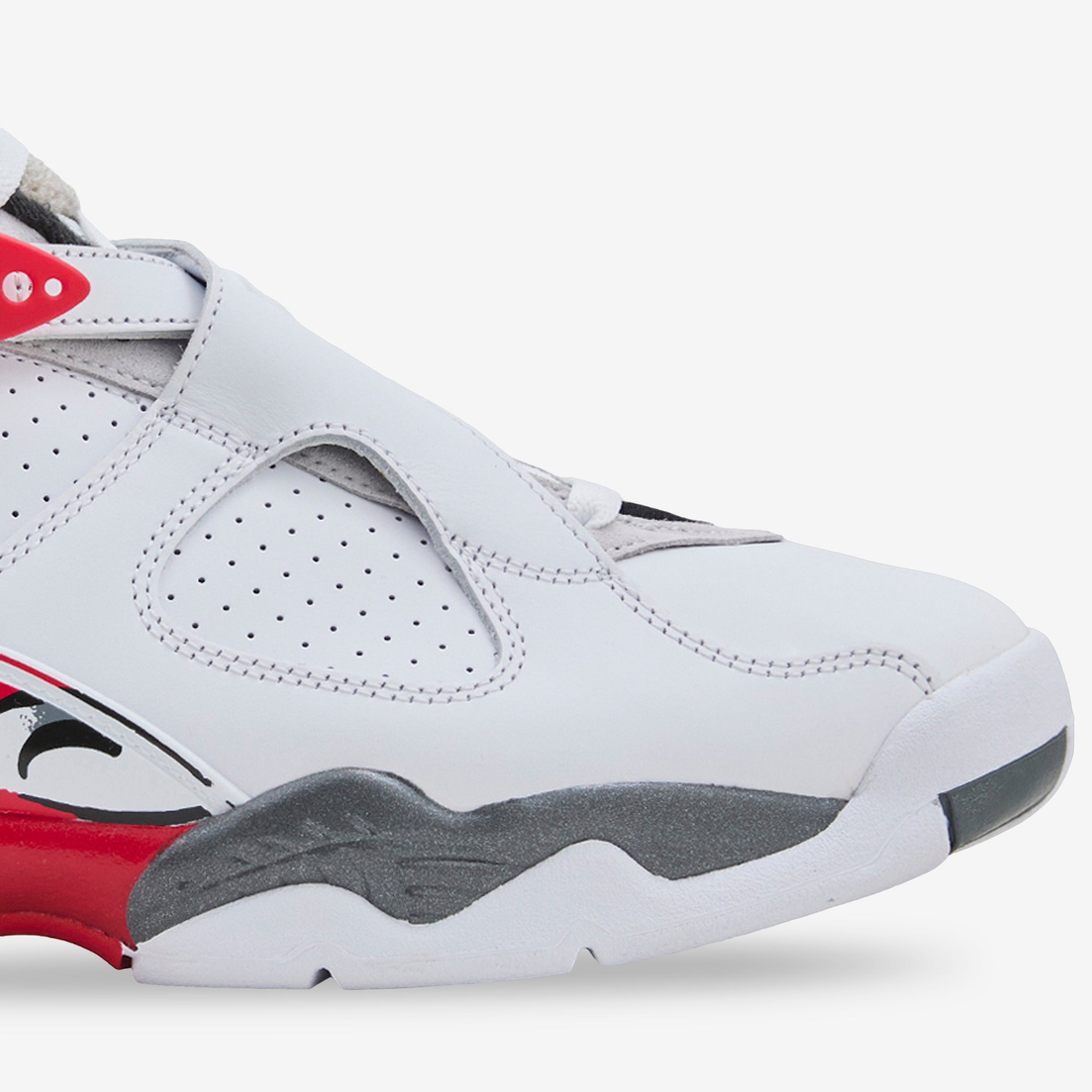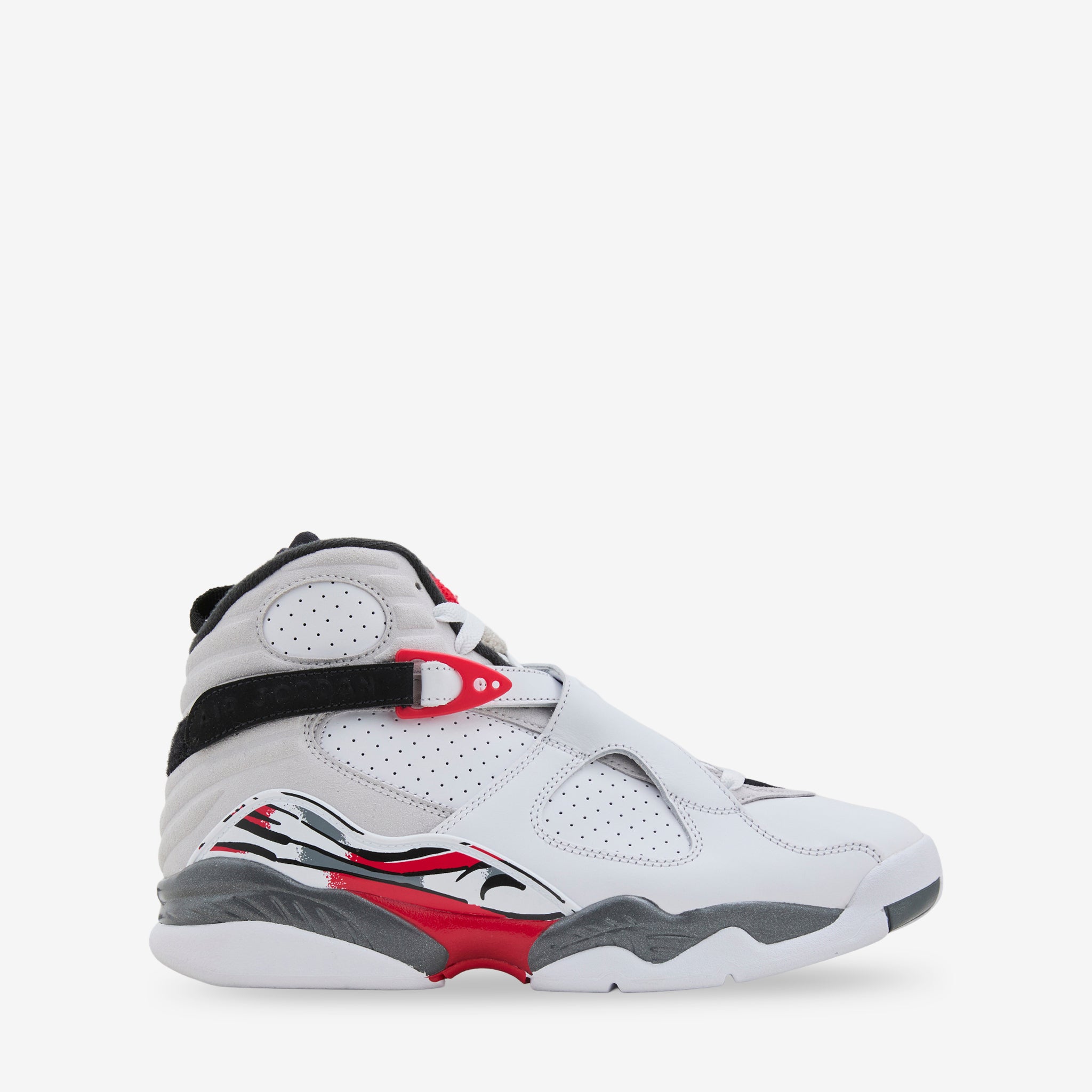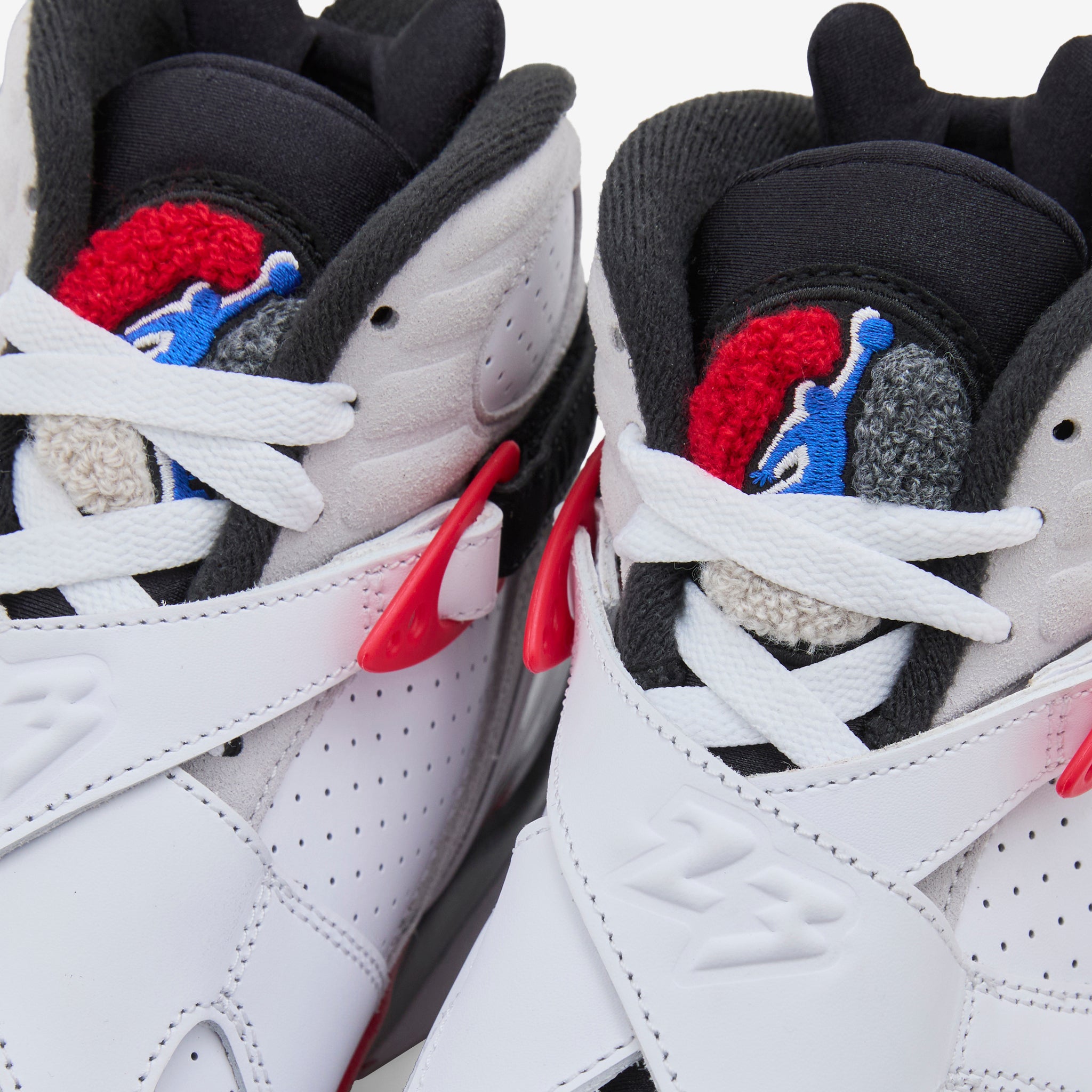 Men's Air Jordan 8 Retro 'Bugs Bunny' in White, Black and True Red from Jordan Brand. Originally released in '92-'93, and famously worn in cartoon version by Bugs Bunny, this AJ8 features a 90's style white leather upper with tonal grey suede accents and moulded construction details. Signature Jordan cushioning and rubber outsole provides traction and support. Finished with forefoot straps and 'Bugs Bunny' tongue details.