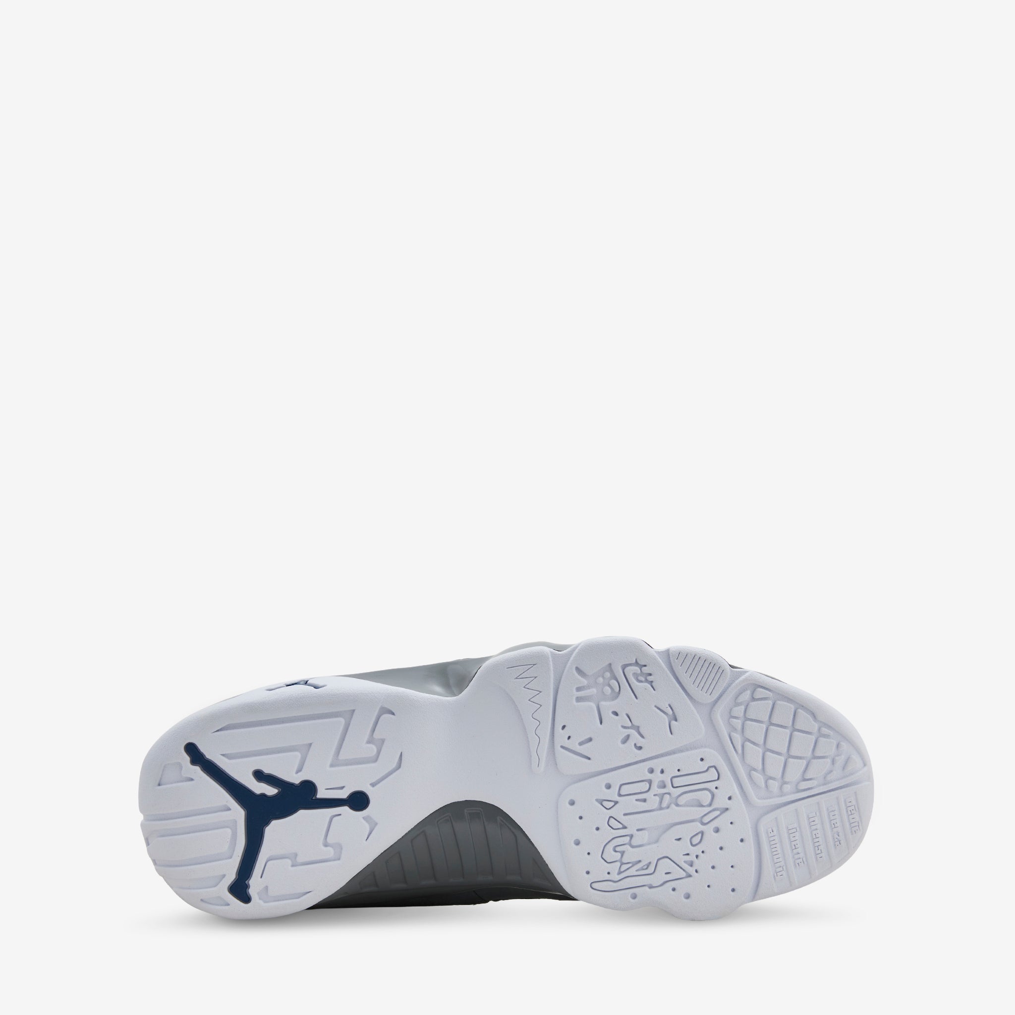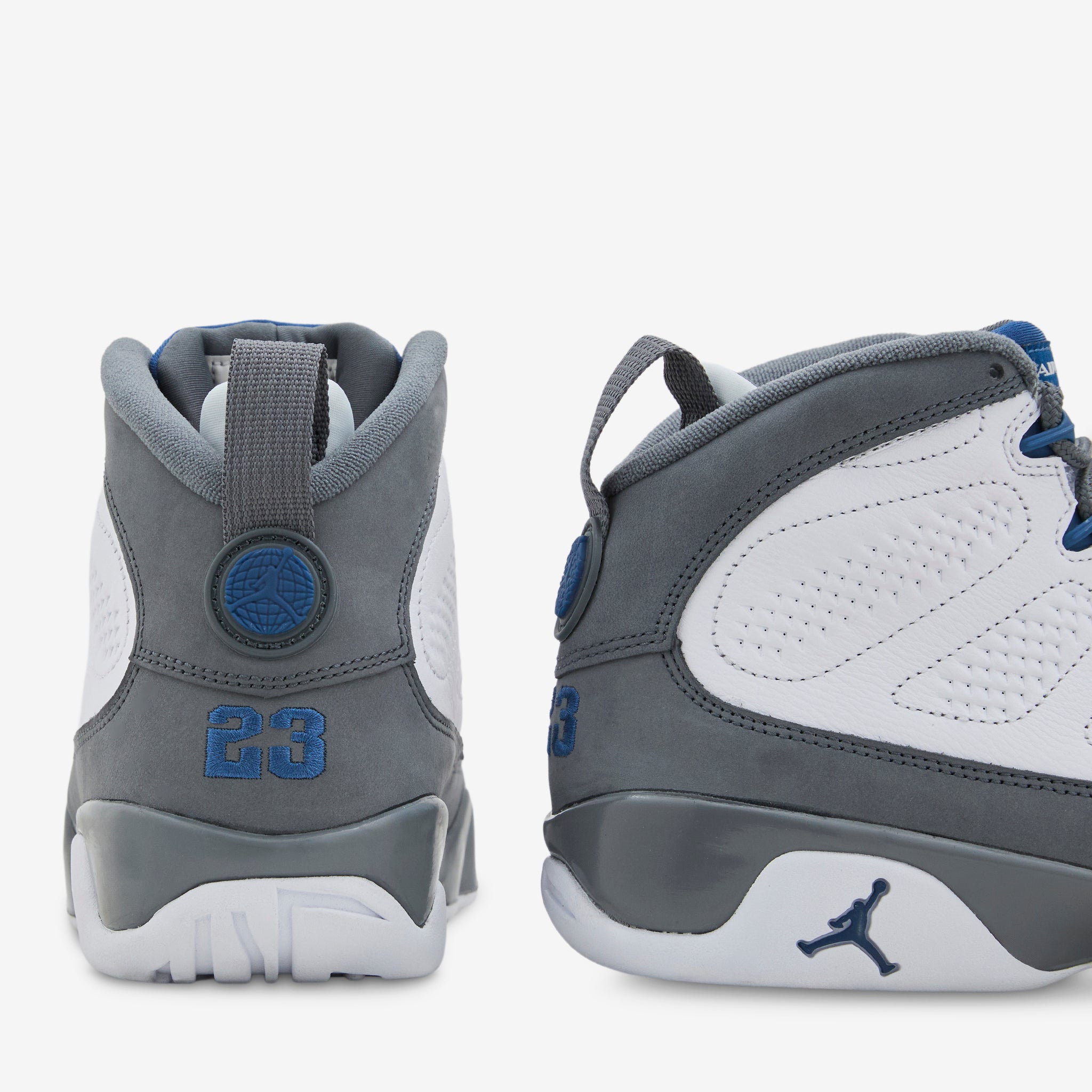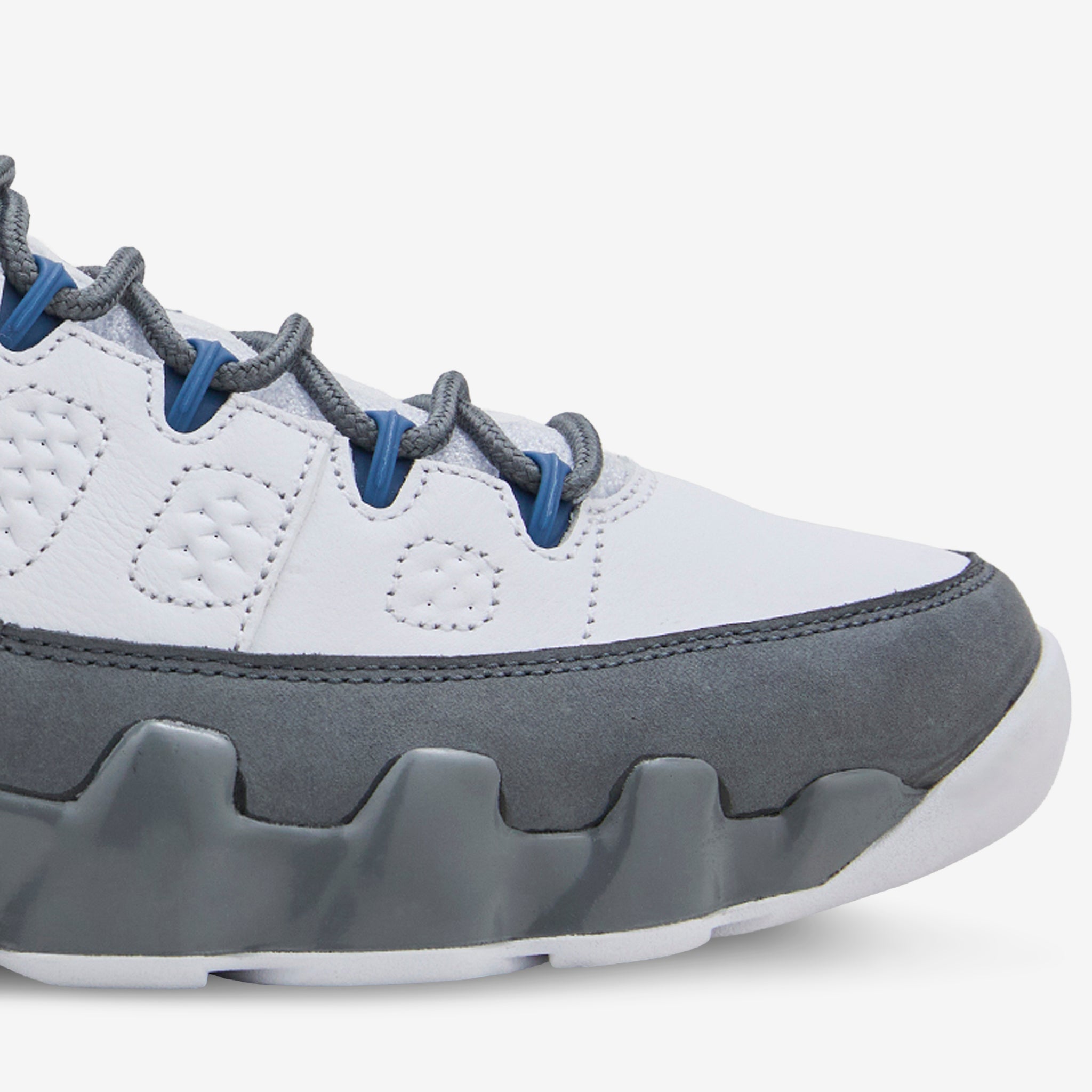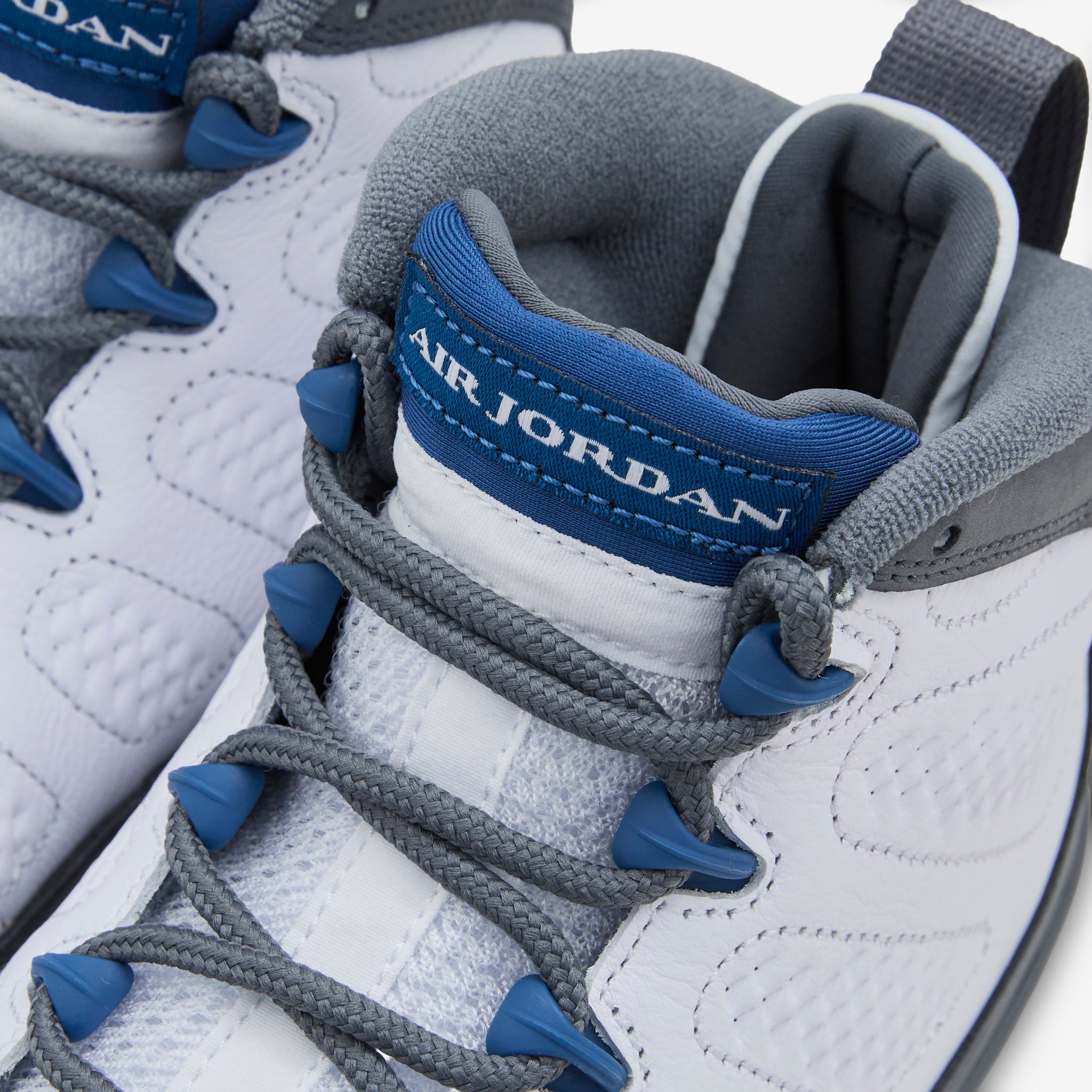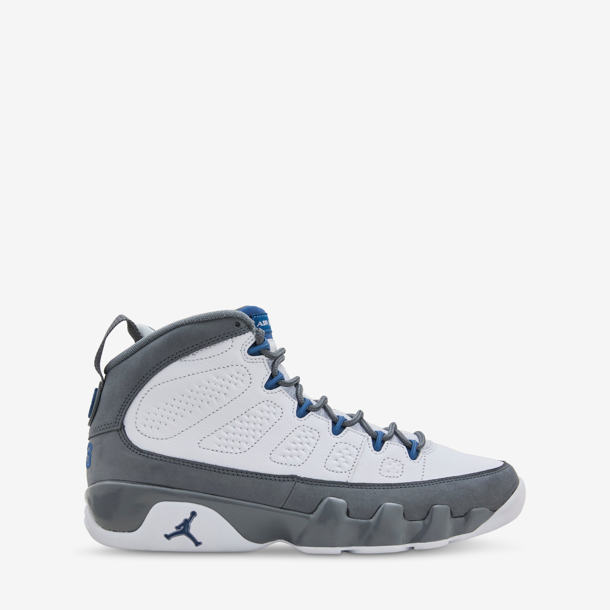Men's Air Jordan 9 Retro in White, French Blue and Flint Grey from Jordan Brand. Returning for the first time in almost 25 years, this classic colourway features a layered leather upper and 'one-pull' lacing system. Unique jagged misdole features signature Nike Air technology for impact absorption and cushioning. Finished with a rubber outsole and Jordan branding.