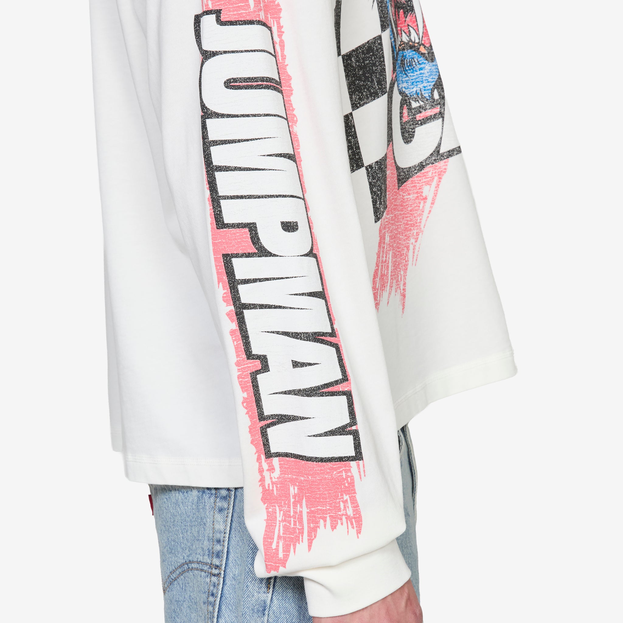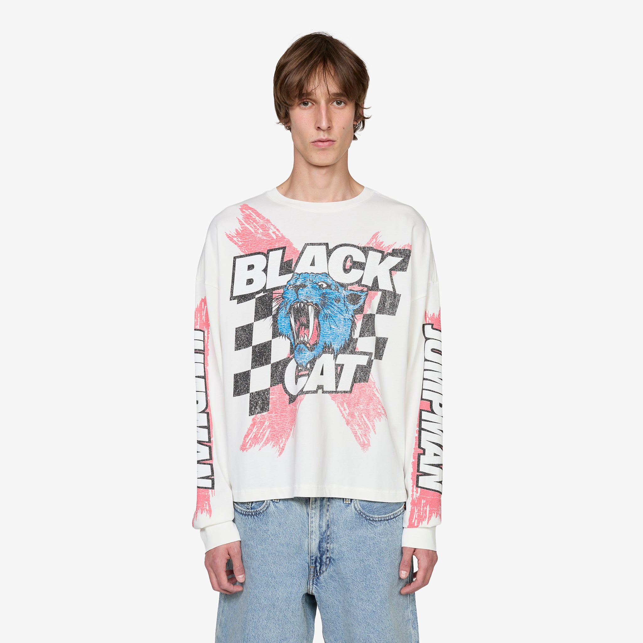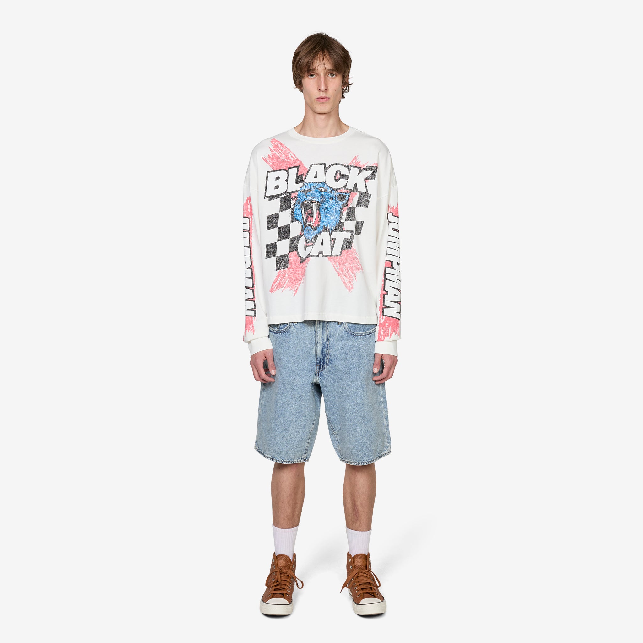 Black Cat Longsleeve T-Shirt in Ivory from Jordan Brand. Boxy-fit long-sleeve t-shirt with a ribbed collar and cuffs. Crafted from cotton jersey for everyday wear. Finished with printed graphics throughout.