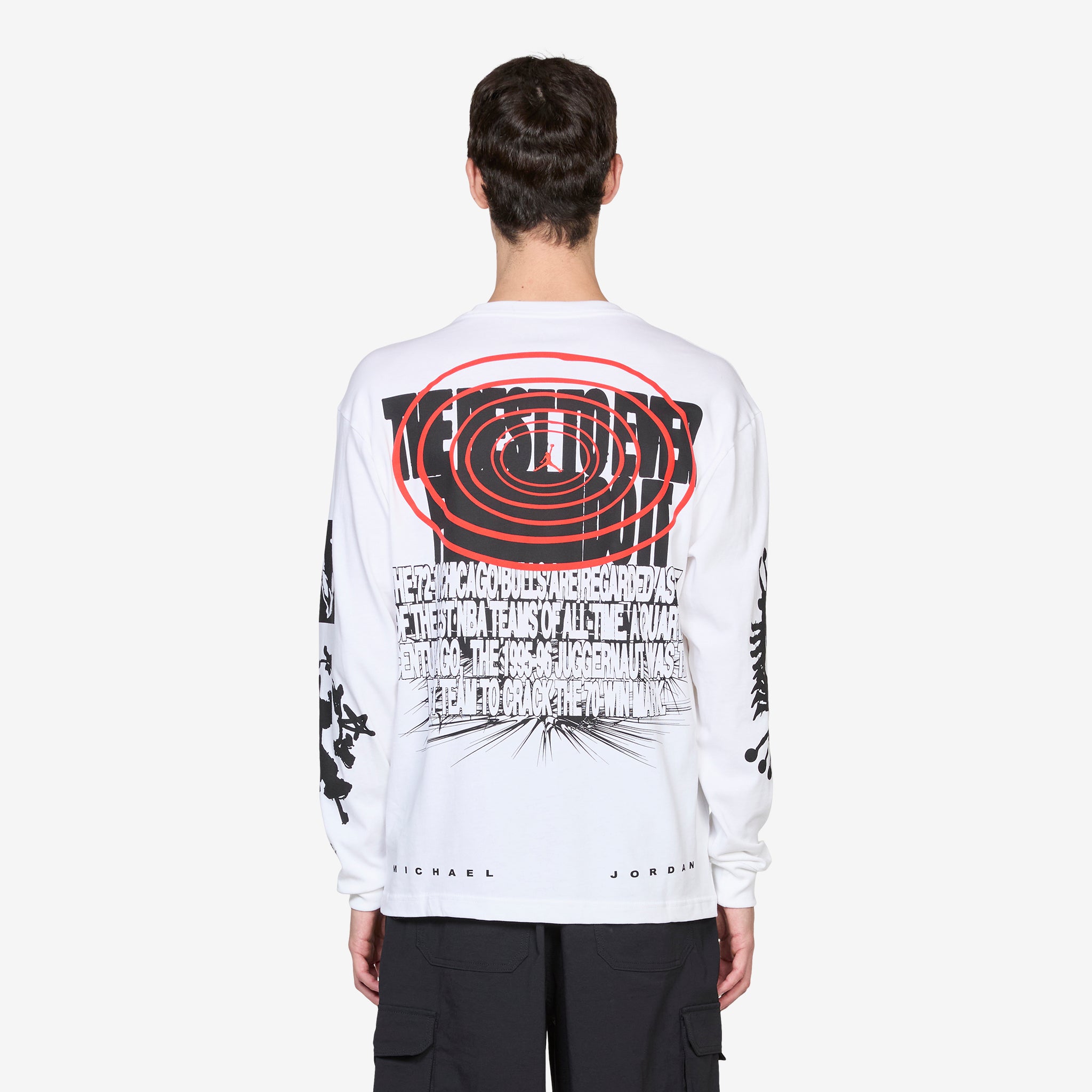 M J Wings Longsleeve OS T-Shirt White | Black from Jordan Brand. Regular fit, long-sleeve shirt made from 100% cotton. Large screen print on the front, back and sleeves. Ribbed cuffs and neck.