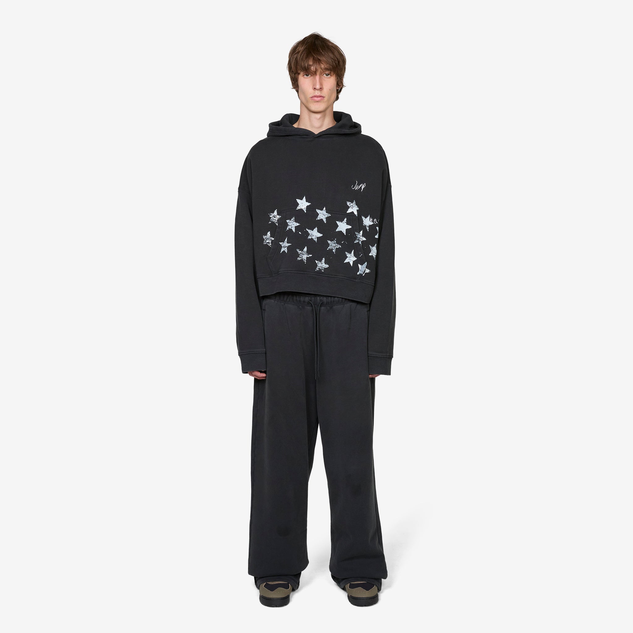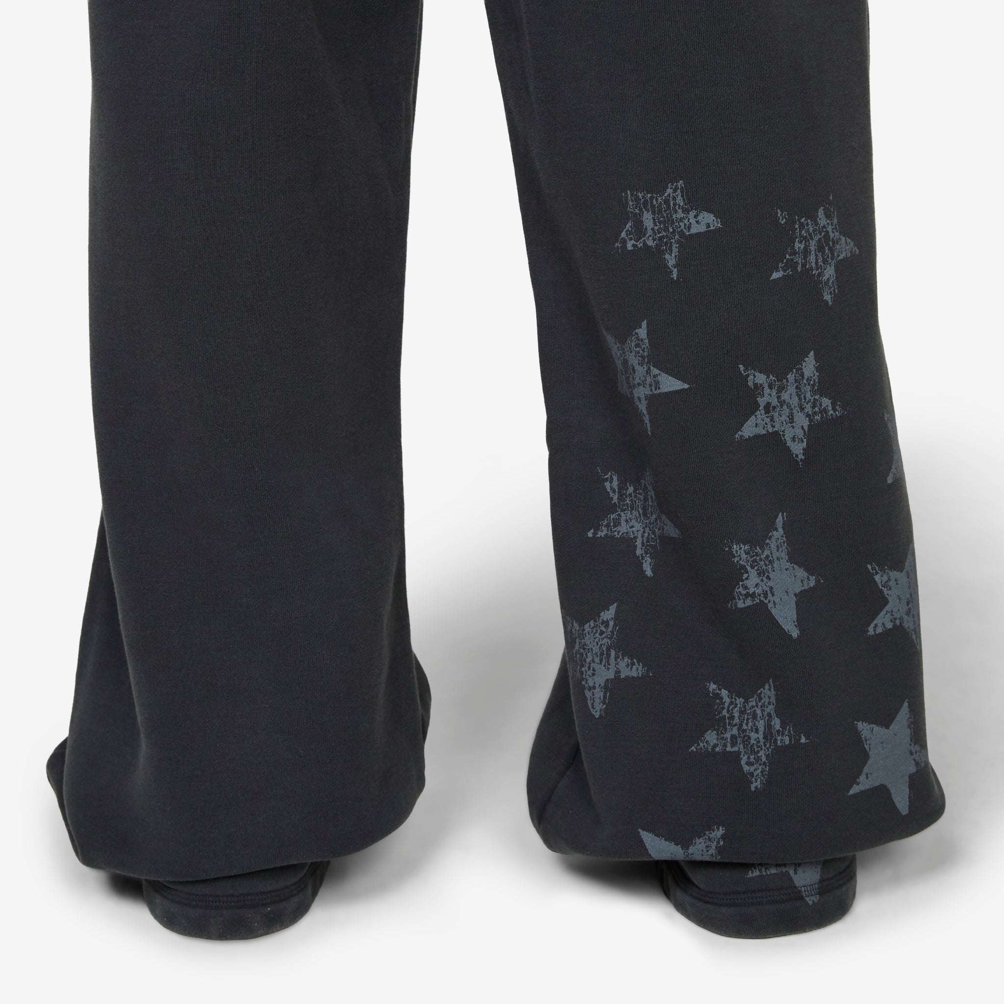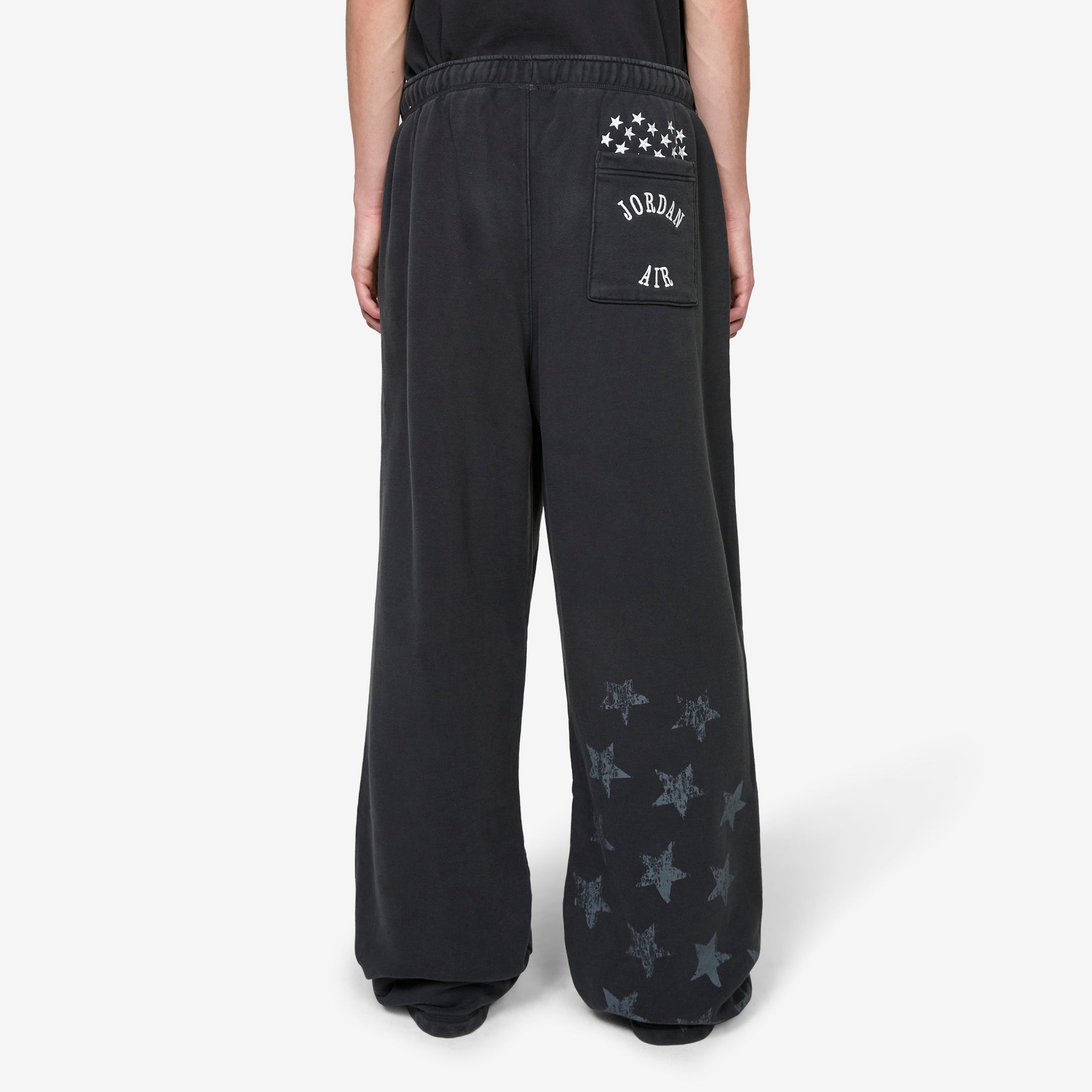 OS Fleece Pant in Black from Jordan Brand. Oversized fit fleece pants with a wide leg silhouette and back pocket detail. Crafted from midweight brushed cotton fleece for a soft hand feel. Finished with printed star graphics positioned at the back hem.