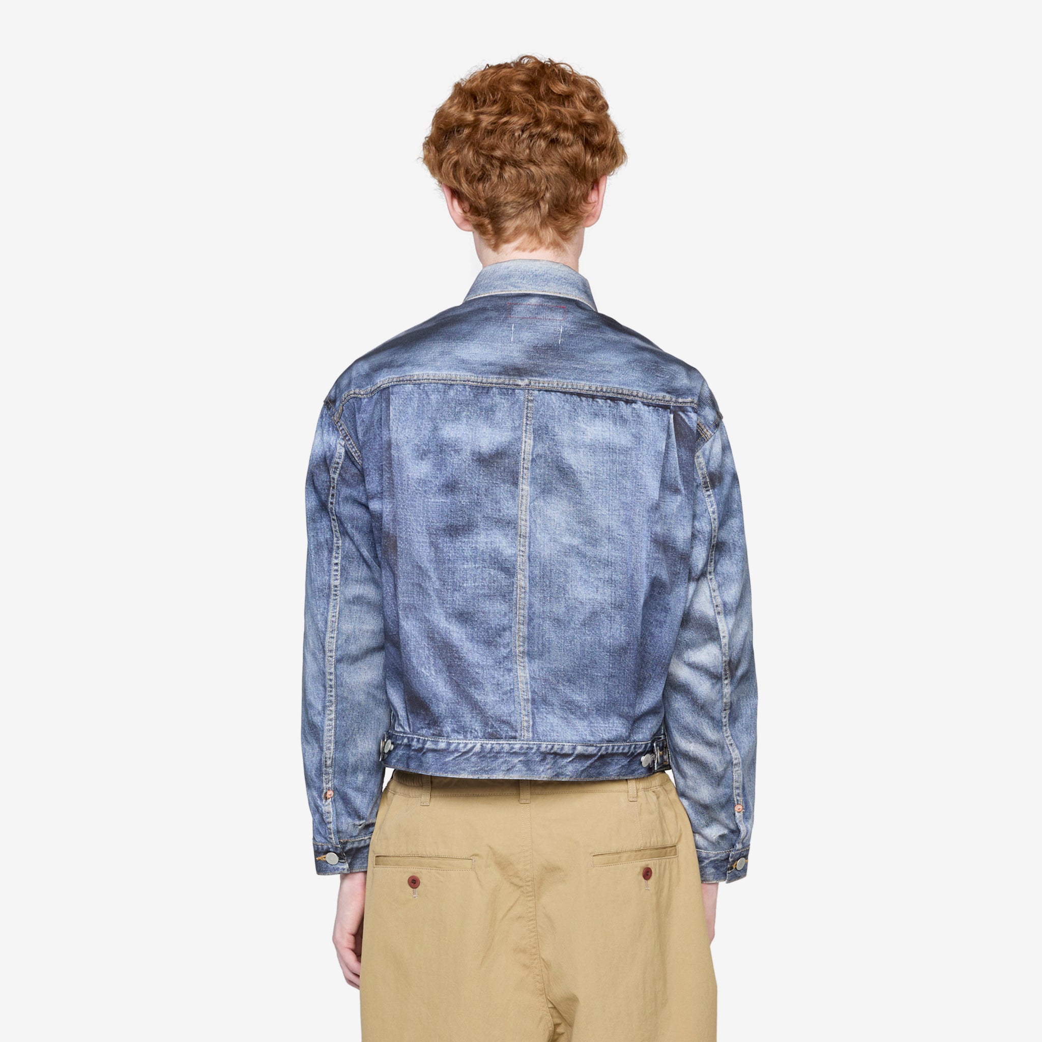 Levi's BerBerJin Inkjet Printed Jacket in Indigo from Junya Watanabe MAN. Produced in collaboration with Levi's and BerBerJin, this cropped, boxy fit jacket features a classic collar and adjustable buttoned waist and cuffs. Crafted from durable Nylon in an all-over trompe l'oeil inkjet print, which is taken from real vintage Levi's items from the Tokyo vintage Americana store BerBerJin.
