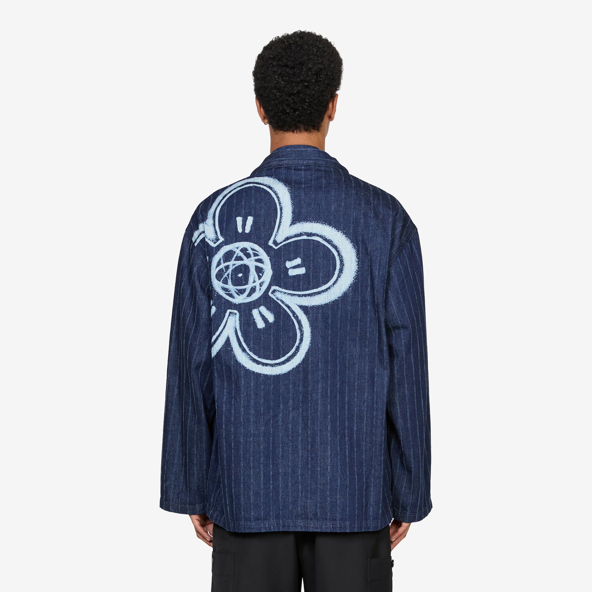Kenzo x Futura 2000' Kimono Jacket Rinse Blue Denim from KENZO PARIS. Kimono-style jacket in rinse-washed Japanese denim from Kenzo and Futura 2000. Crafted using Kaihara punch needle denim to create raised textured stripes throughout. Features a structured collar, double front fastening and contrast ‘Kenzo Paris’ logo reinterpreted by Futura 2000 on the belt.