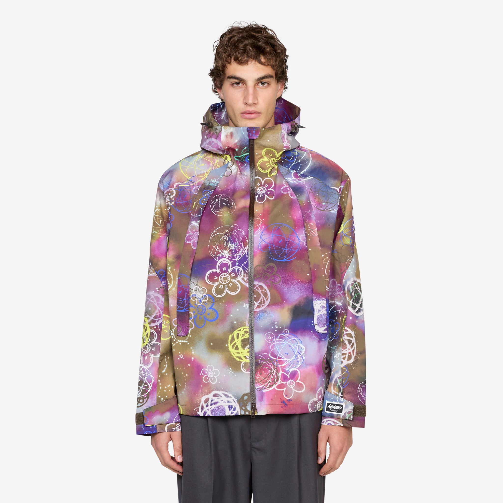 'KENZO x Futura 2000' Short Windbreaker in Khaki from KENZO PARIS. Protective windbreaker with a toggle-adjustable hood and hem, two-way full zip closure and strap-adjustable cuffs. Crafted from water-repellent nylon ripstop in an all-over custom collaborative print from artist Futura 2000. Finished with two front zip-closure pockets, two internal storage pockets and reflective branding details at the left sleeve.