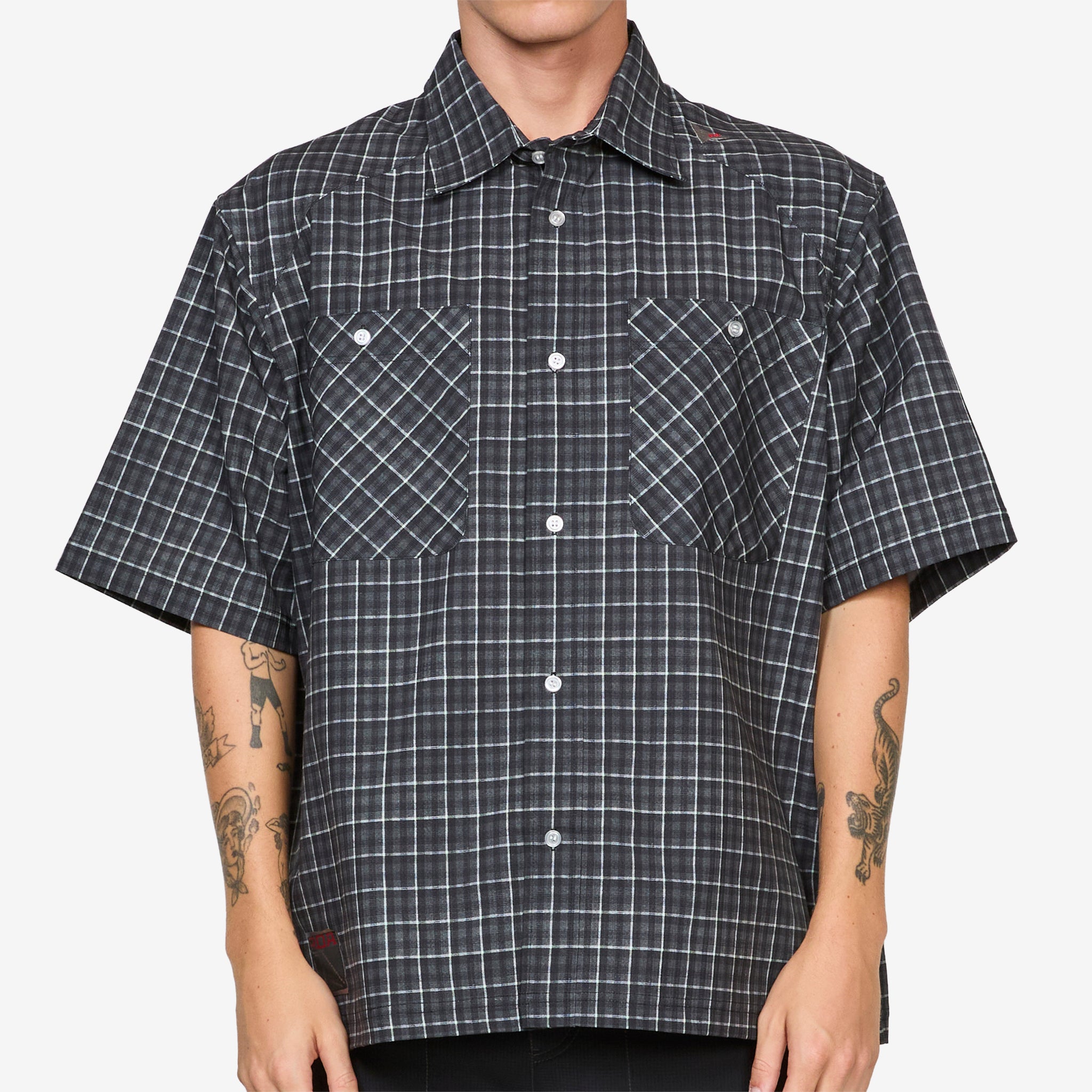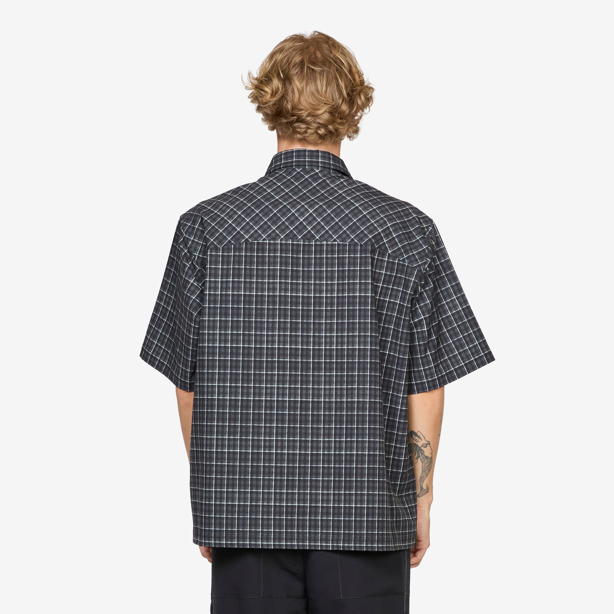 Aair Floweave Printed Check Short Sleeve Shirt in Grey from ROA. Relaxed fit short-sleeve button-up shirt with a classic collar, straight hem, two button chest pockets and a full button closure. Crafted from a breathable quick-drying fabric, offering comfort and ventilation. Finished with an embroidered ROA logo on the left shoulder and a jacquard label on the right side.