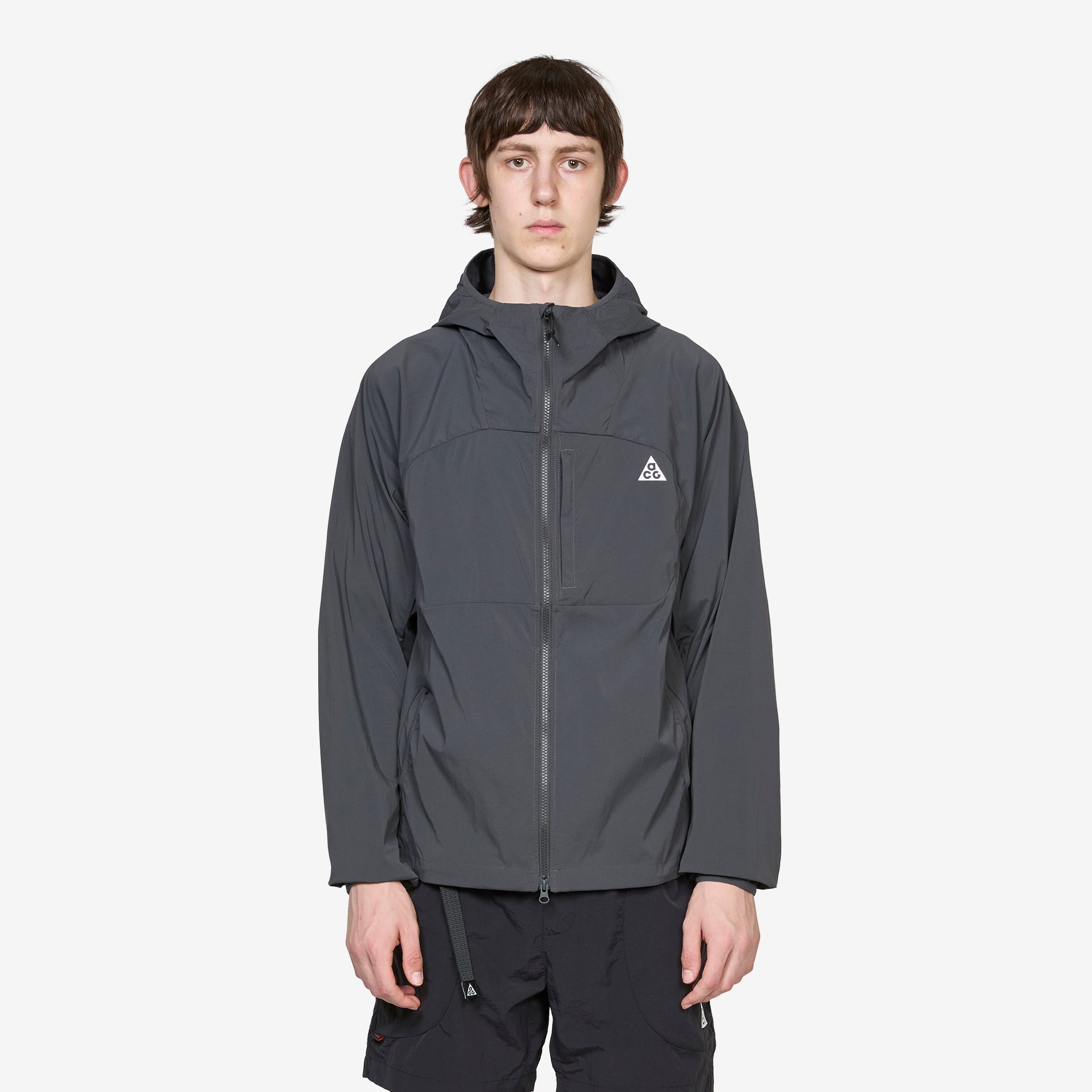 ACG 'Five Towers' UV Protection Jacket in Anthracite and Summit White from Nike. Relaxed fit jacket with an elasticated ergonomic hood, 2-way full zip closure and a bungee-cord adjustable hem. Crafted from a Dri-FIT nylon blend with built in UVA and UVB protection, shielding the sun from areas covered by the garment. Finished with embroidered branding and a zip-closure chest pocket, which the jacket can be packed into for easy storage.