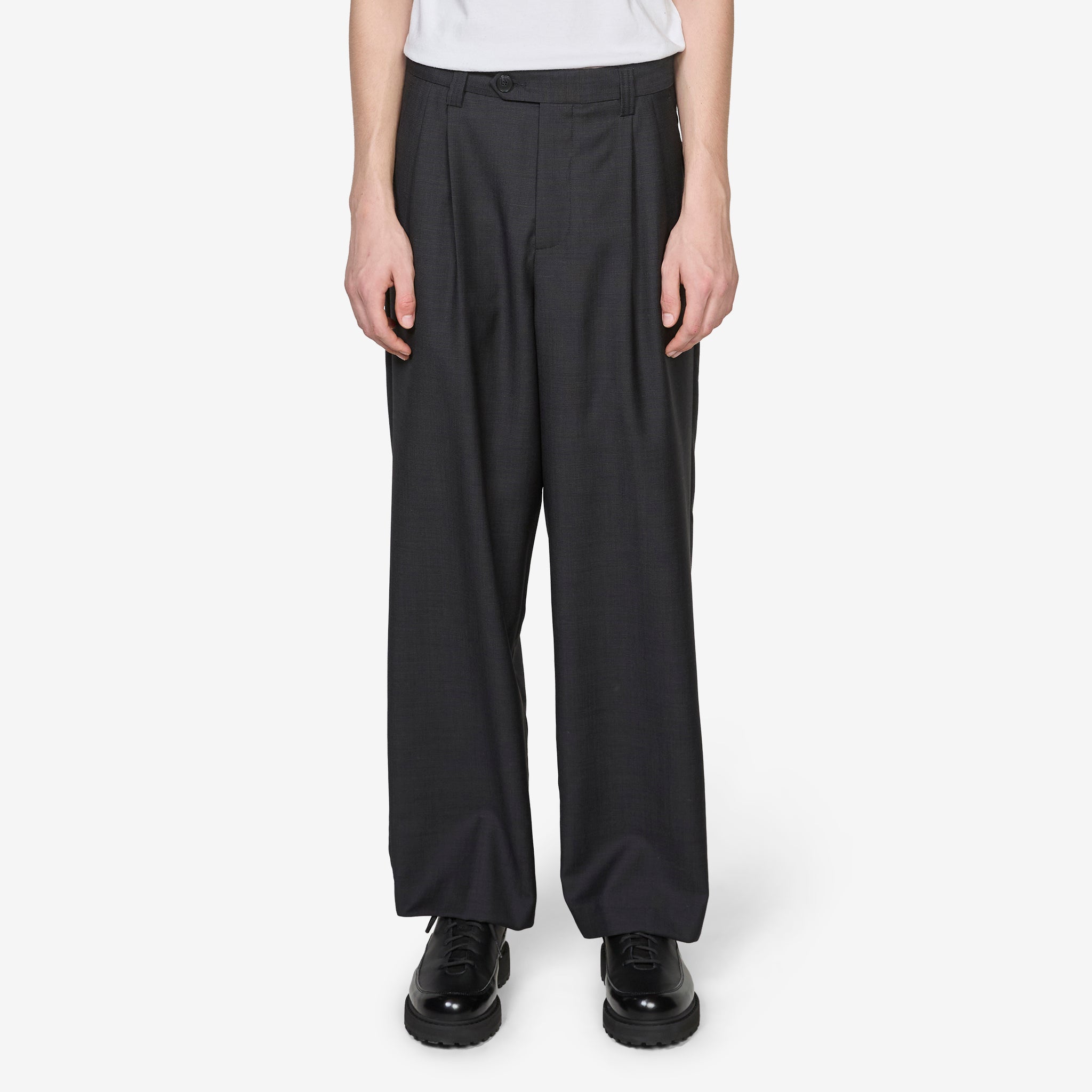 Classic Trousers in Dark Grey Grain from mfpen. Wide straight-leg trousers with four-pocket construction, double front pleats and a mid-rise. Constructed from soft lightweight wool and finished with black resin button fastening, hook-and-eye closure and a YKK zip fly.
