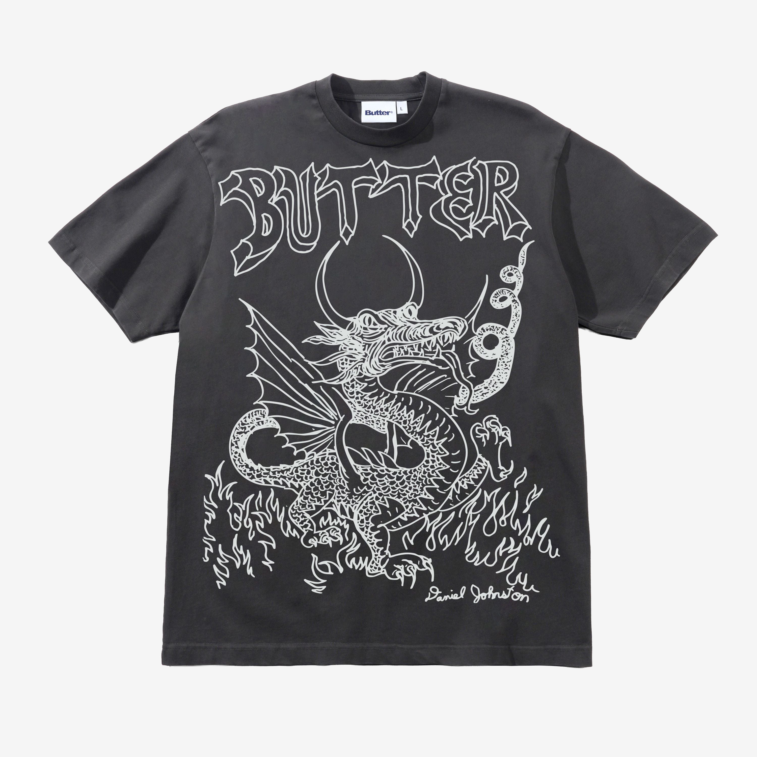 Daniel Johnston Dragon T-Shirt in Washed Black from Butter Goods. Relaxed fit crew neck t-shirt. Crafted from a soft mineral washed 230gsm cotton. Finished with large illustrative screen print on the front.