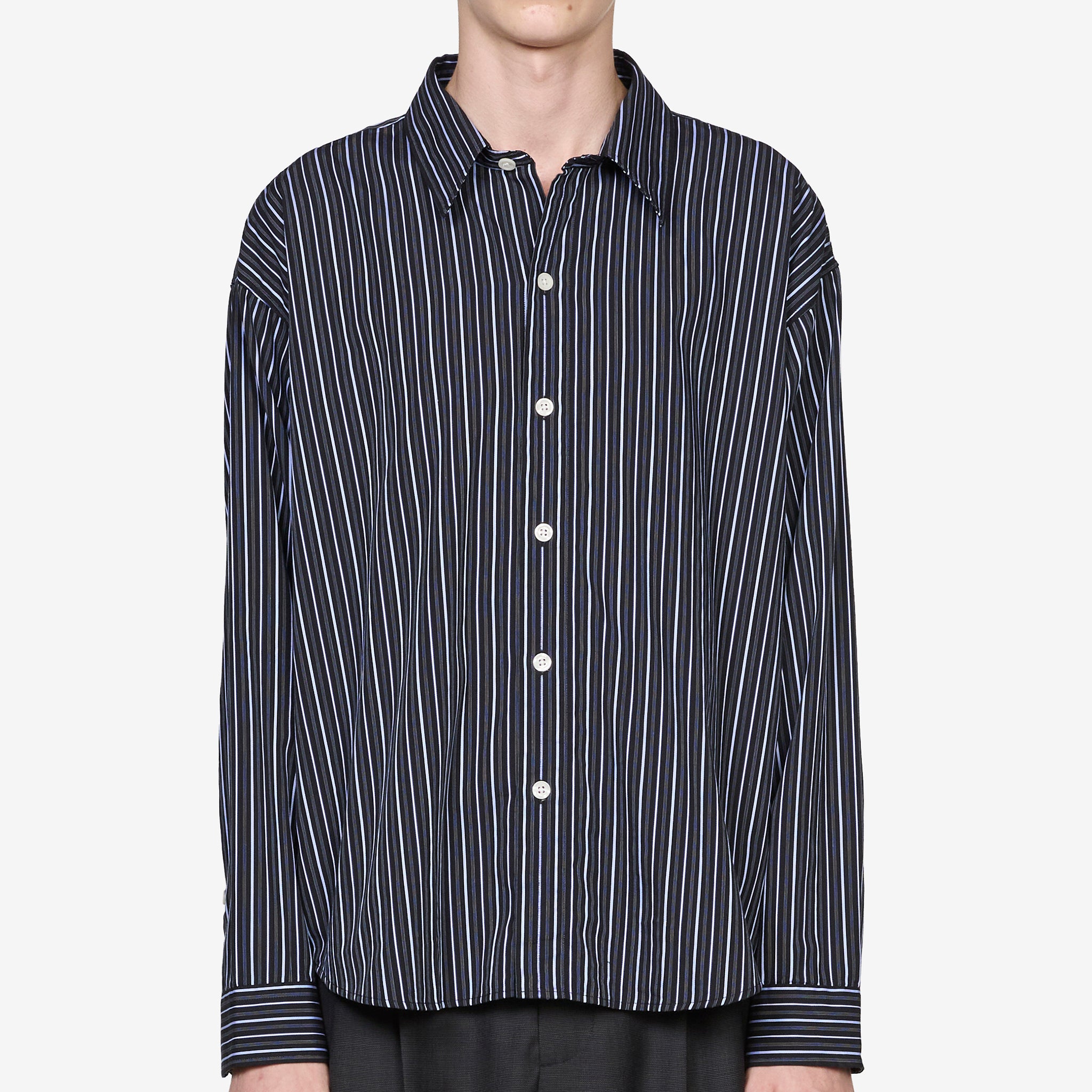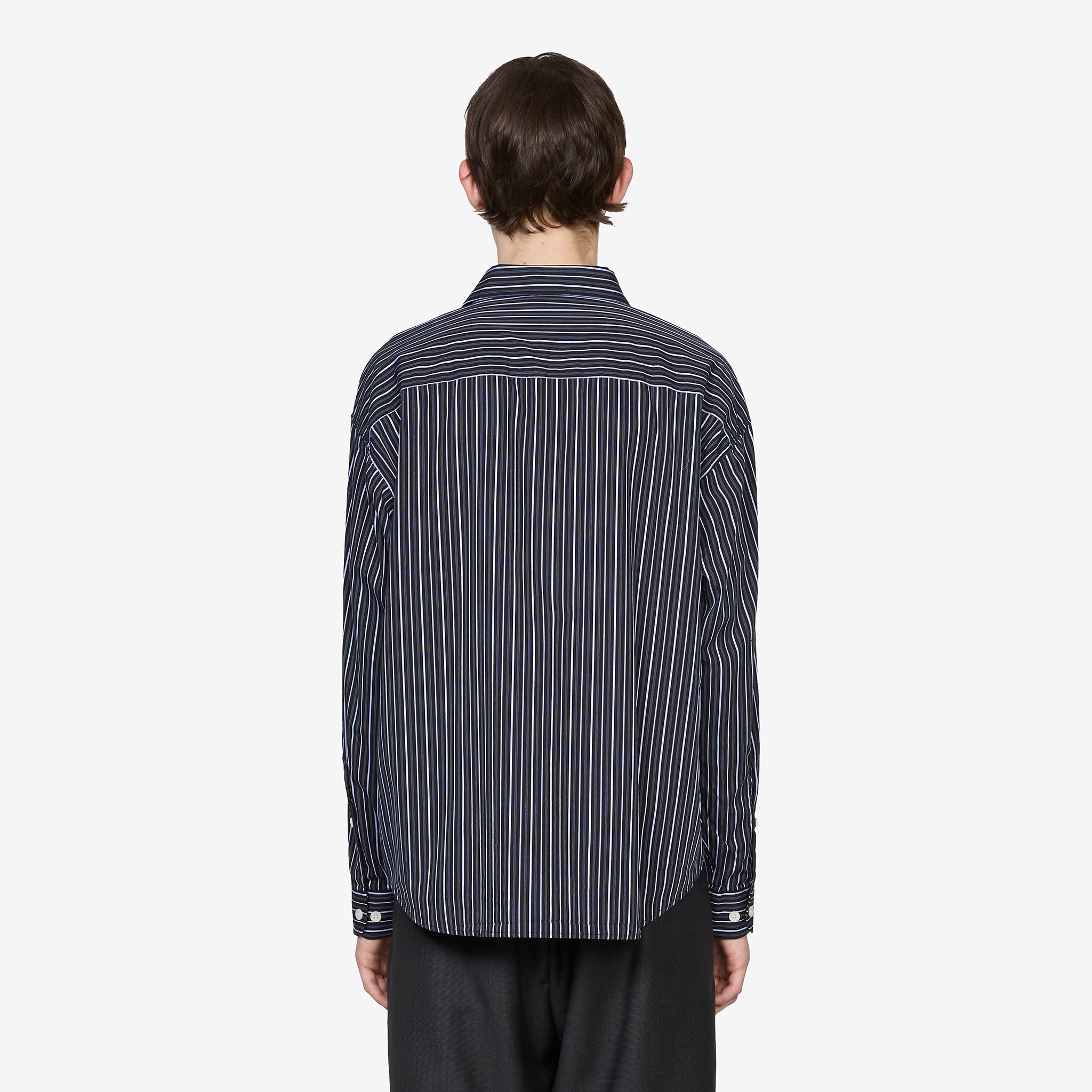 Exact Shirt in Black Office Stripe from mfpen. Boxy and slightly cropped fit longsleeve shirt with a spread collar, ivory resin button closure, dropped shoulders and a curved hem. Crafted from a soft, garment washed organic cotton in a blue and black multi stripe throughout and finished with a straight yoke.