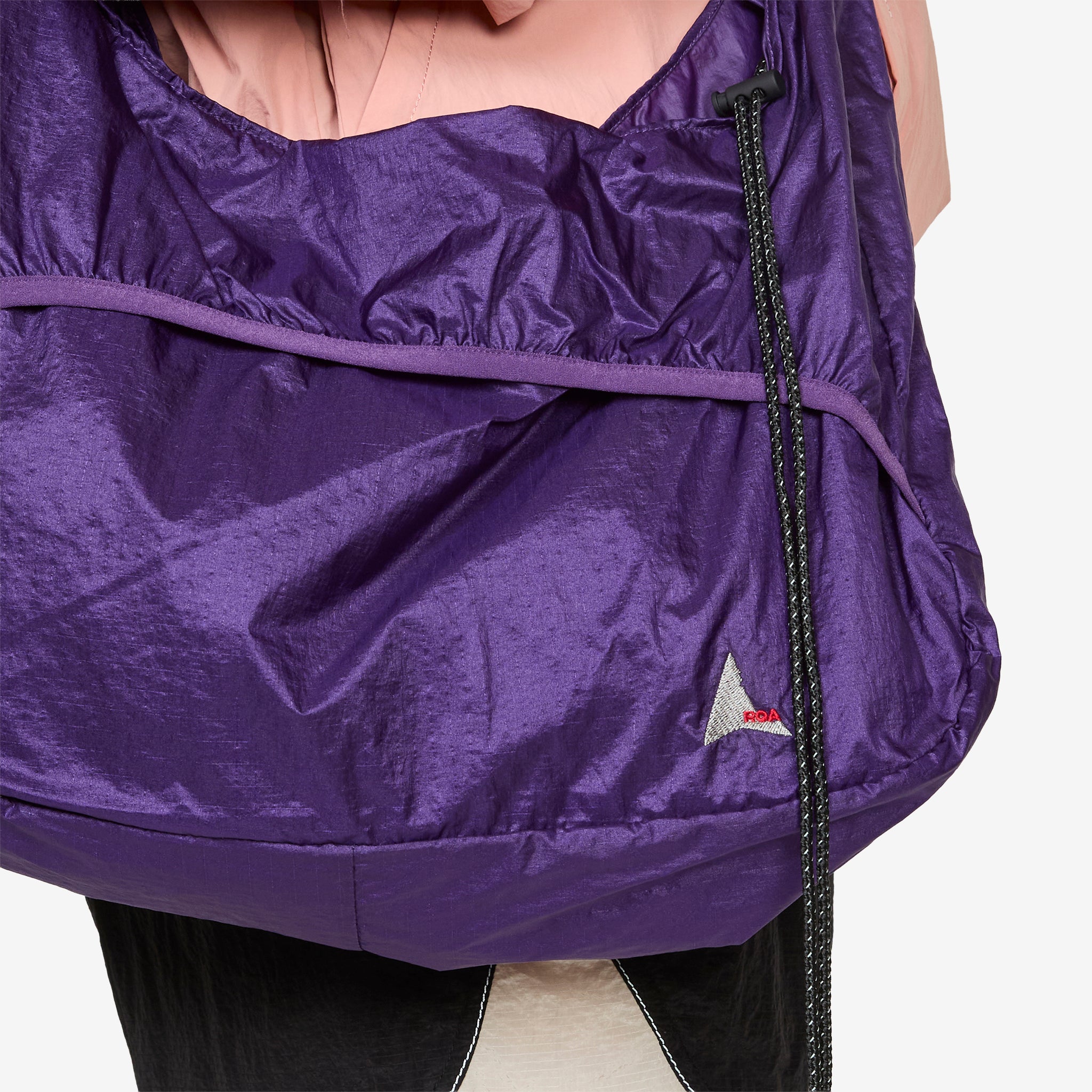 Laki Packable Knot Bag in Purple from ROA. Packable sling bag featuring an adjustable shoulder strap, front external pocket and internal storage pocket. Crafted from durable water-repellent 25gsm micro ripstop nylon and finished with a reflective pull tab, small button closure pocket and embroidered branding at the front.