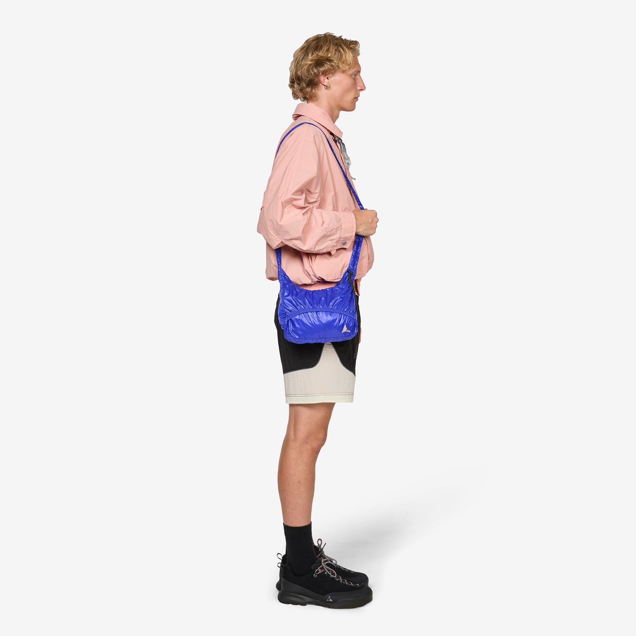 Laki Small Packable Knot Bag in Blue from ROA. Small packable sling bag featuring an adjustable shoulder strap, front external pocket and internal storage pocket. Crafted from durable water-repellent 25gsm micro ripstop nylon and finished with a reflective pull tab, small button closure pocket and embroidered branding at the front. Carrying capacity of 0.5kg.