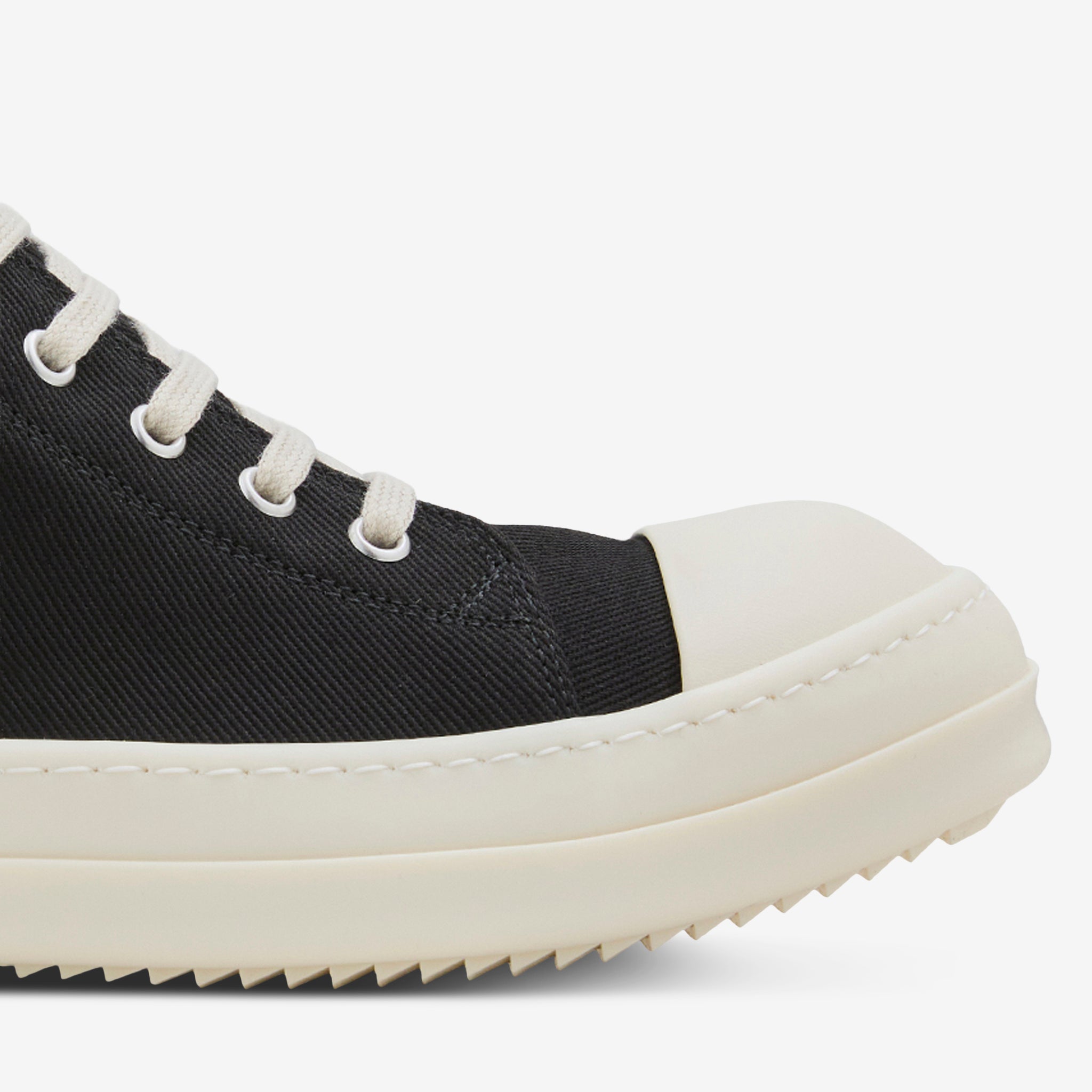 Low Sneaks 8oz Deep Black Denim in Black and Milk from Rick Owens DRKSHDW. Under-ankle height sneakers featuring an upper crafted from an 8oz overdyed Italian cotton denim with a soft and washed handfeel. Finished with a protective toe cap and shark tooth sole.