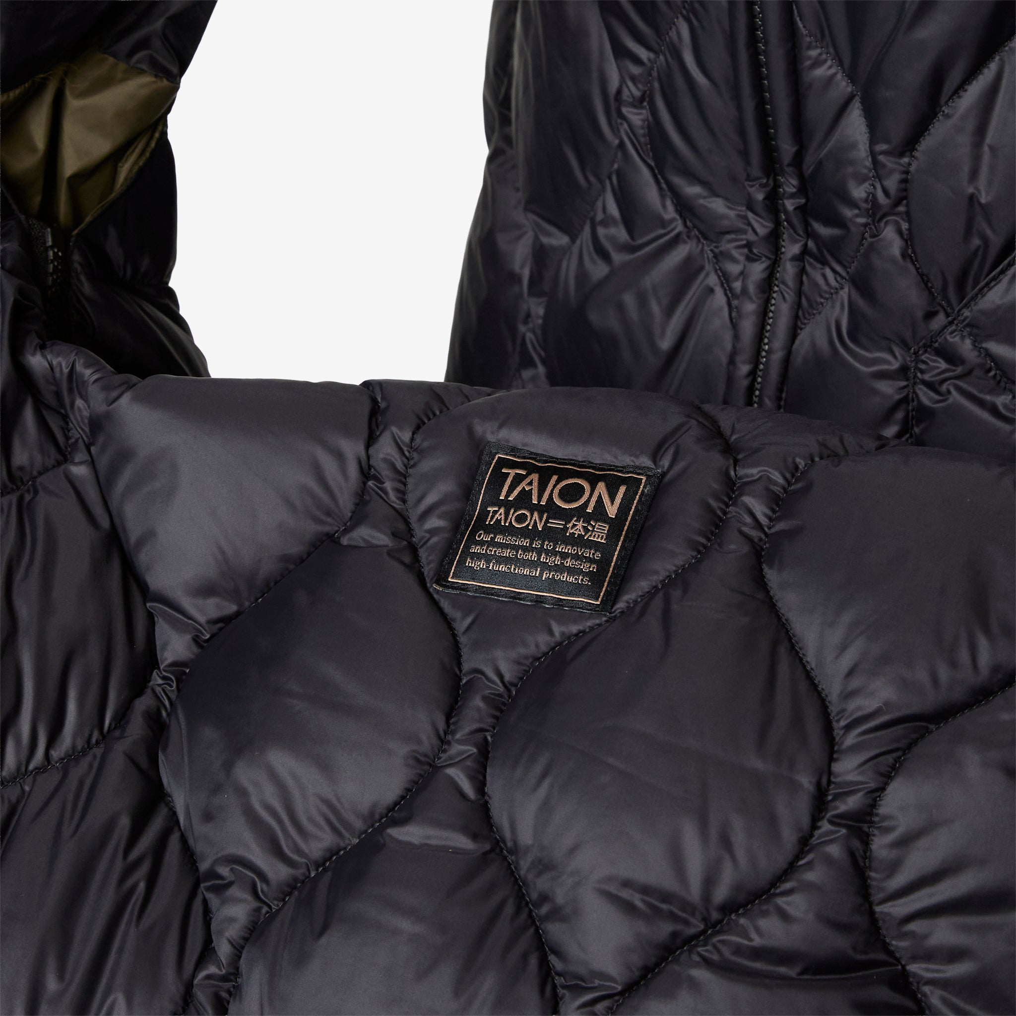 Military Banana Shoulder Down Bag (L) in Black from Taion. Large-sized banana shaped bag with a fixed crossbody strap and zip closure. Crafted from a lightweight high density fabric and filled with premium 800 fill-power down. Finished with additional interior compartments and small brand patch on the exterior.