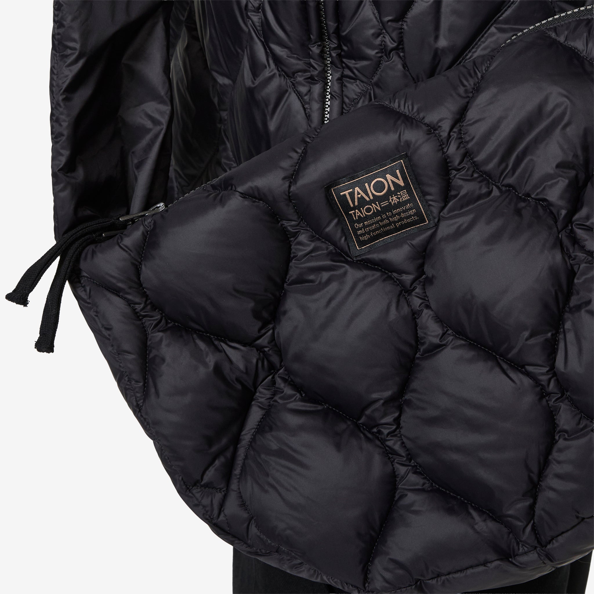 Military Banana Shoulder Down Bag (M) in Black from Taion. Medium-sized banana shaped bag with a fixed crossbody strap and zip closure. Crafted from a lightweight high density fabric and filled with premium 800 fill-power down. Finished with additional interior compartments and small brand patch on the exterior.